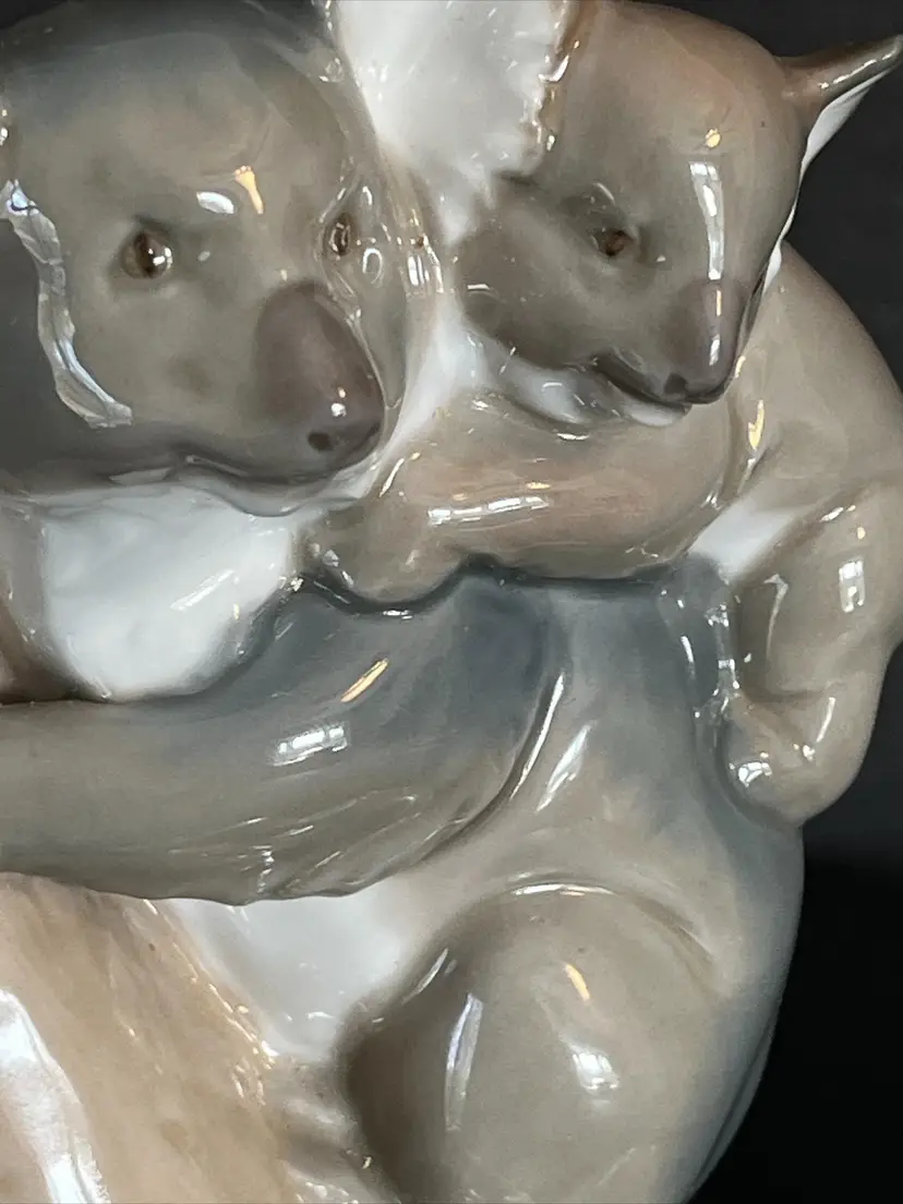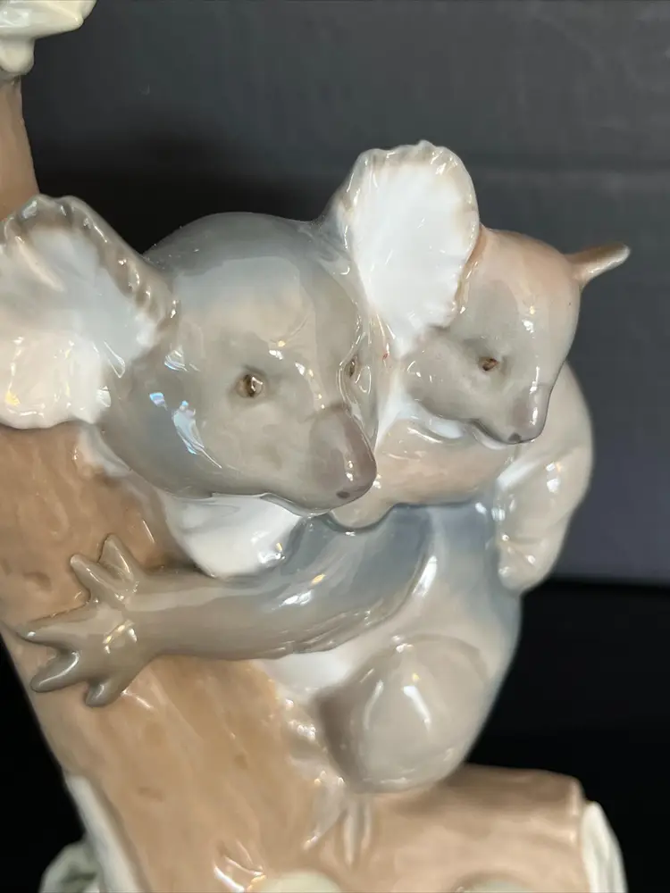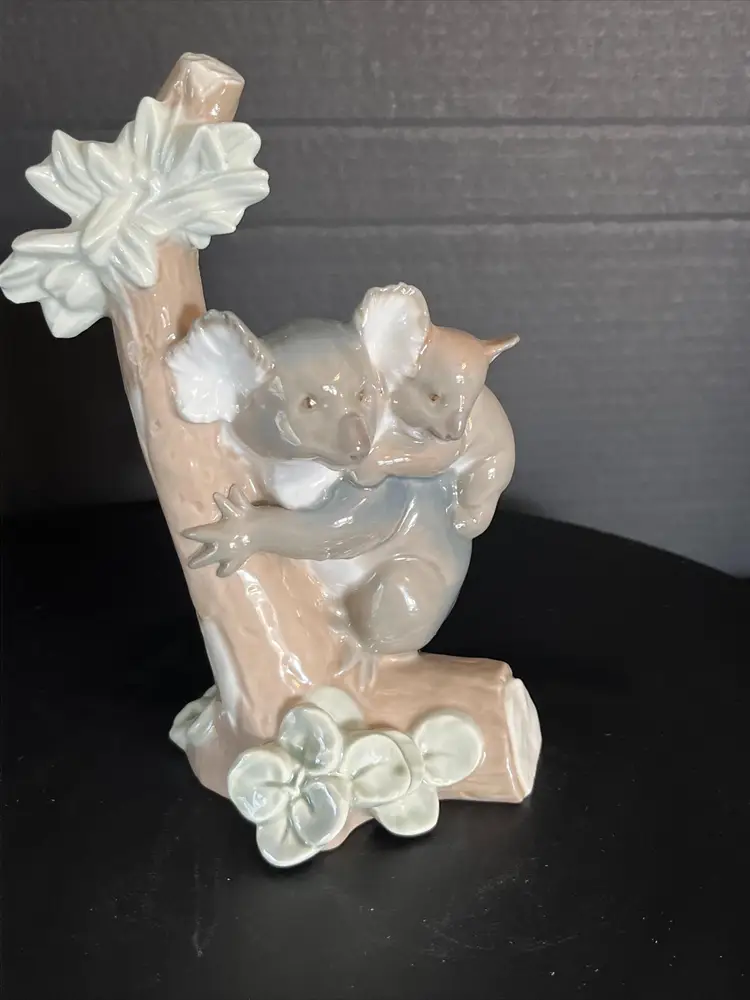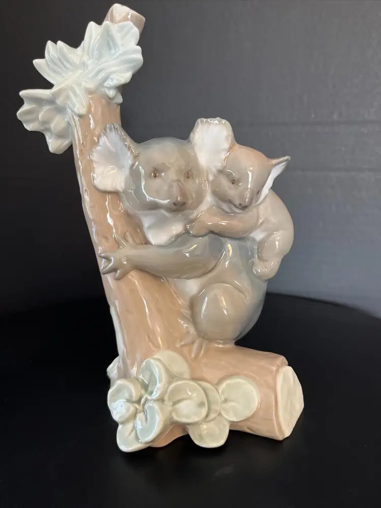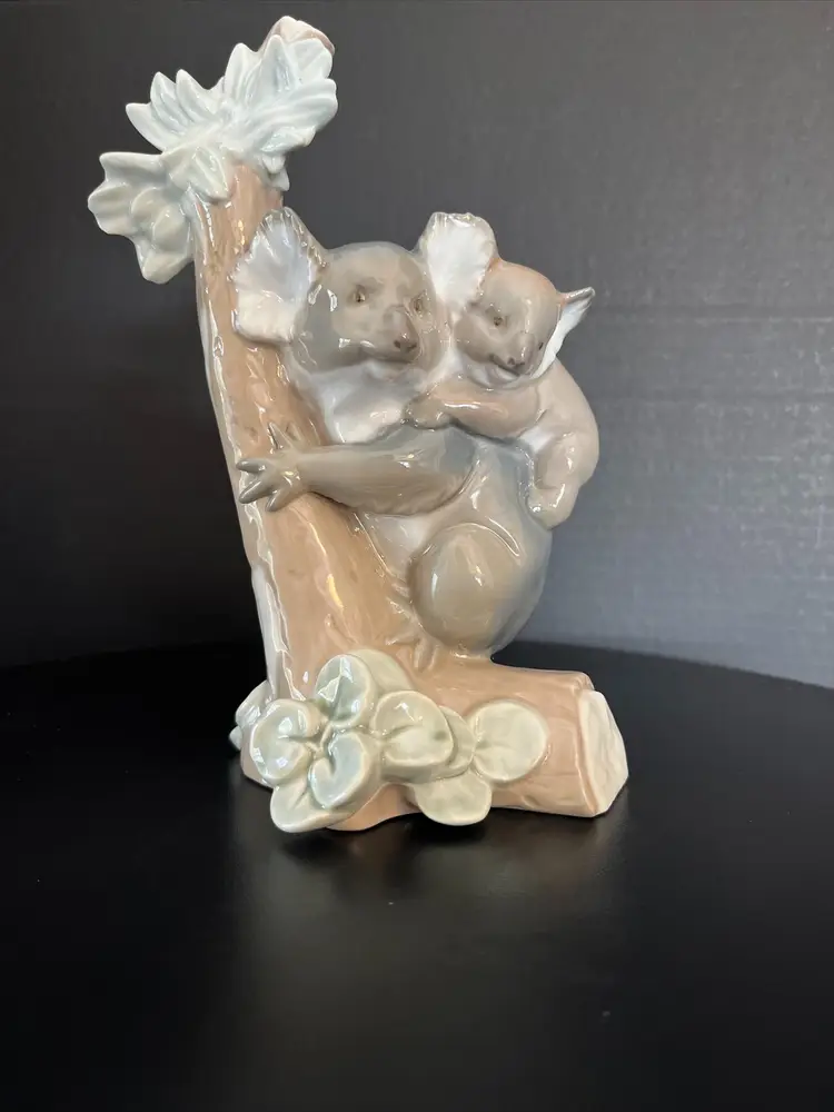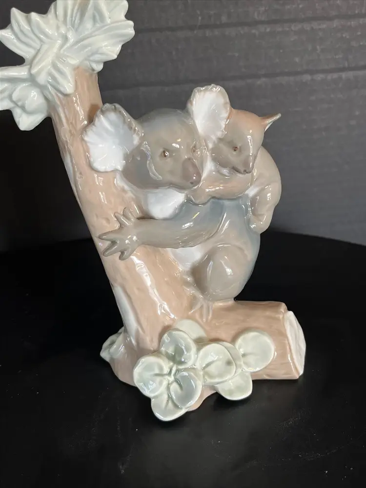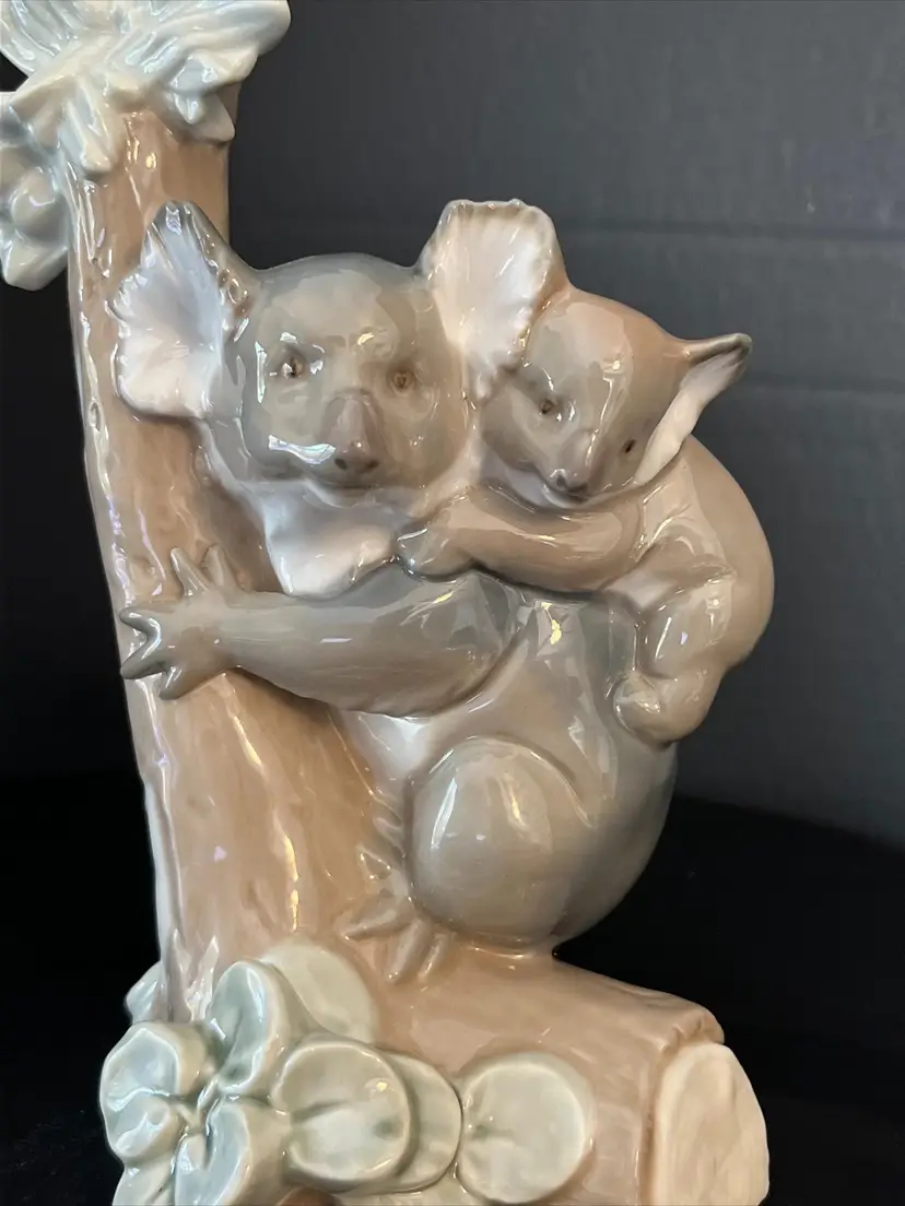 This Lladró figurine, designed by Antonio Ramos in 1987, features a mother koala with her baby cub. The piece is beautifully crafted from glazed porcelain and is part of the Wildlife collection. It is a retired piece, issued in 1987 and retired in 1993. The figurine measures 8.5 inches in height, 5 inches in length, and 4.25 inches in width. It weighs 2 pounds and has a grey, white, brown, and green color scheme. The koala figurine will make a lovely addition to any room and a great gift for lovers of Animals, Australia, the outback or the simple beauty of wildlife.