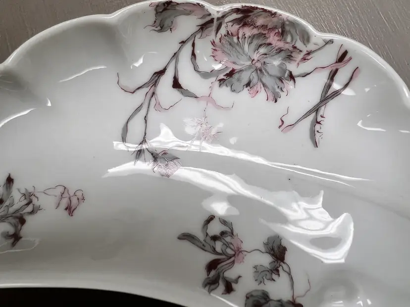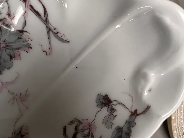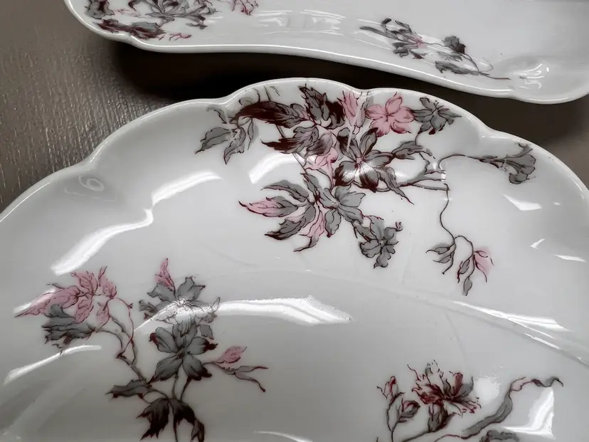 Haviland Limoges Bone Dishes Set (2). Pink and gray flowers, measure approximately 6” in length, 3.25” width and 1” high. Could be used as intended or would make a lovely trinket dishes. There are 3 small black marks on one piece (pictured) looks like original not caused but considered in price. Happy to ask questions. I have more Haviland pieces.