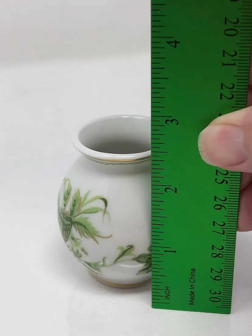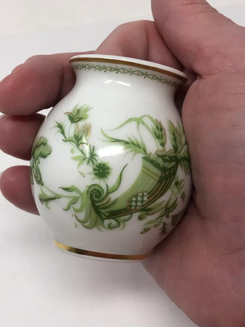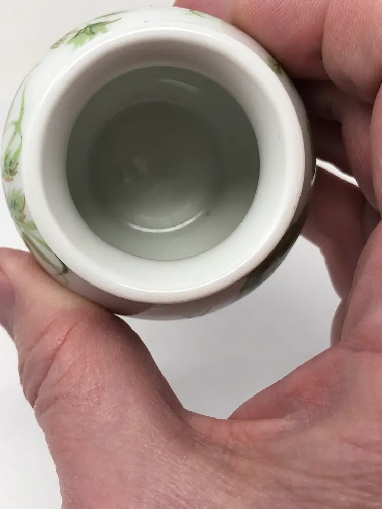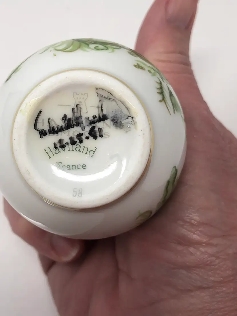 2 1/2" tall vessel. Green florals and gold detail. Stamped Haviland Limoges France 58. Hand dated and signed. No chips or cracks