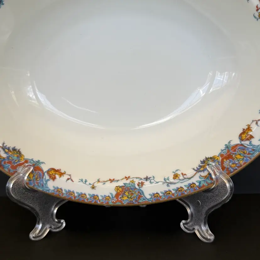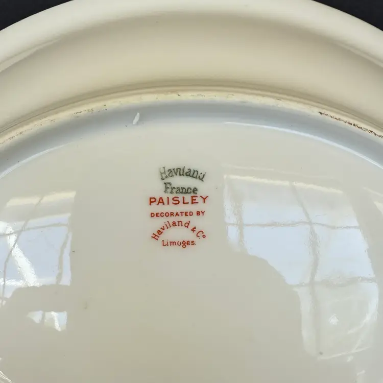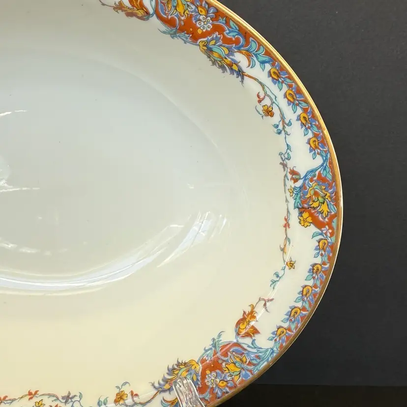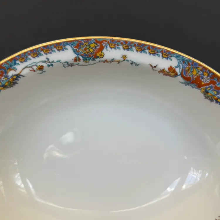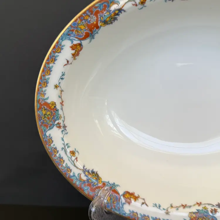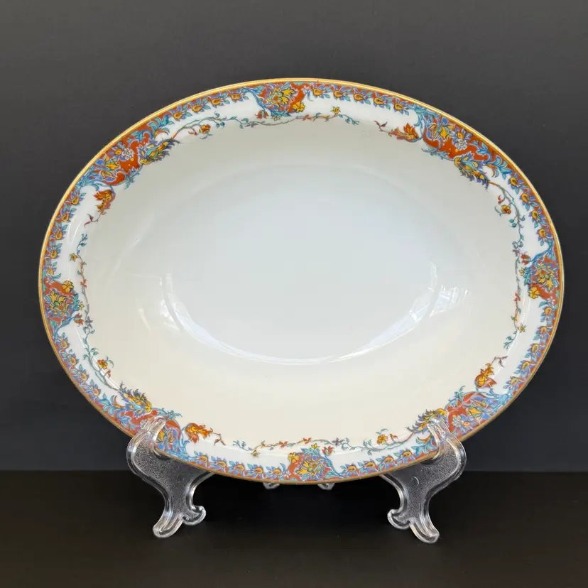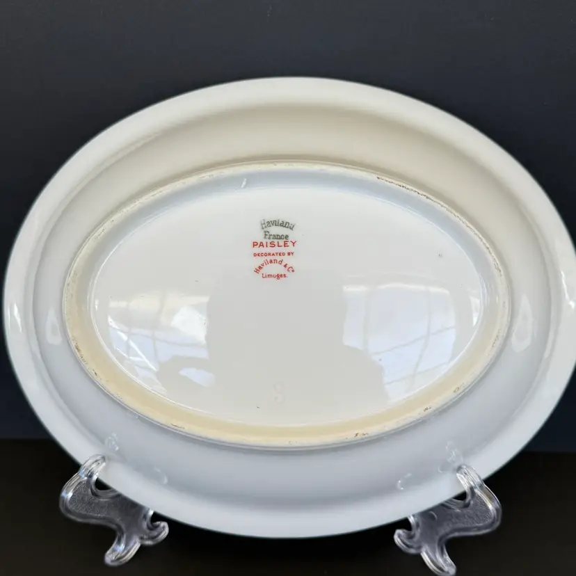 This is a vintage Haviland Limoges oval serving bowl, specifically in the "Paisley" pattern, which is known for its multicolor floral trim and gold accents.