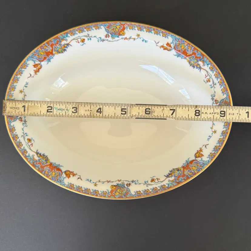 The bowl measures 9.25 x 7.5 x 2“. It is in very good condition with minimal signs of use, and without chips or cracks.