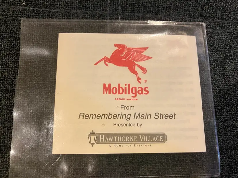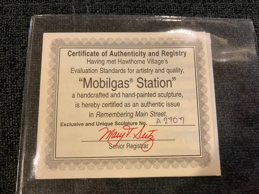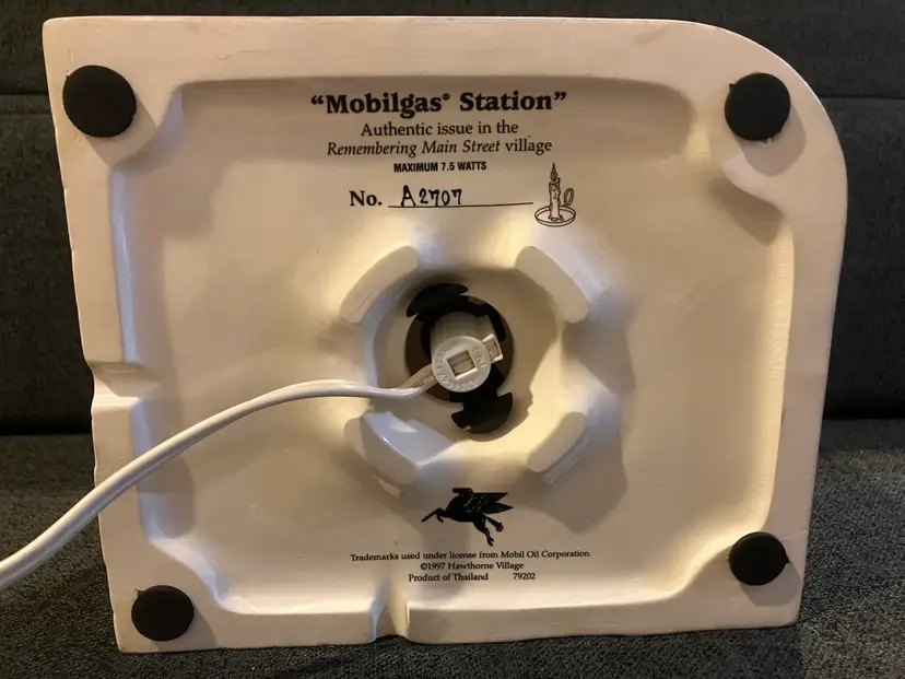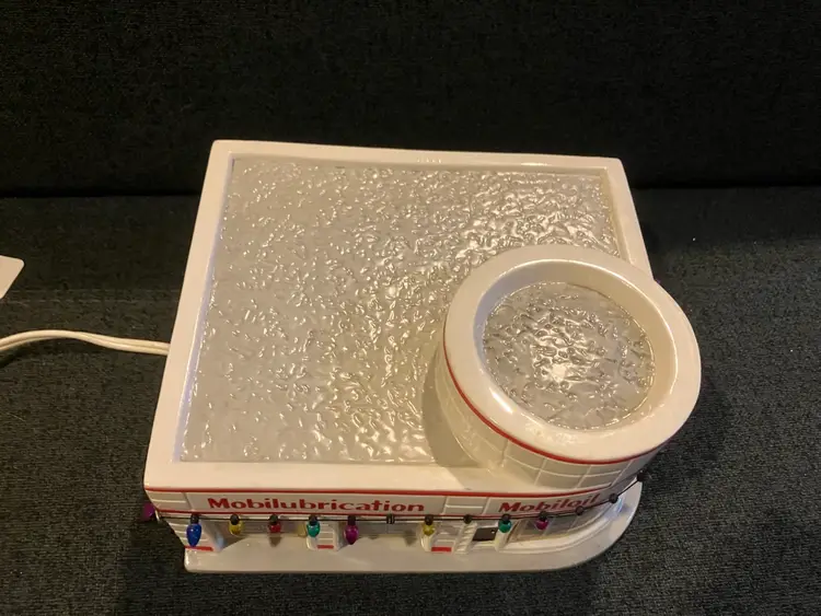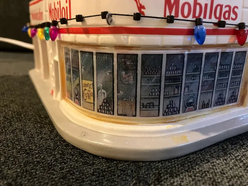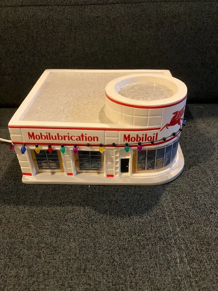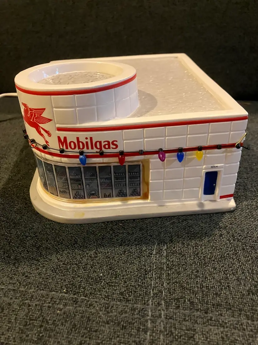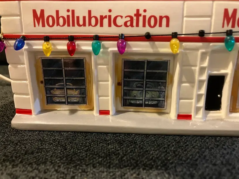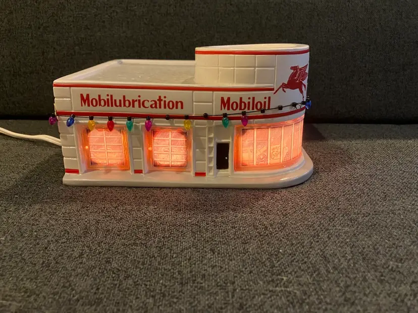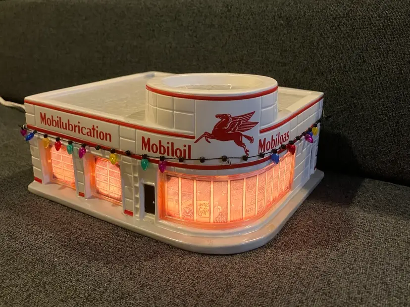 This retro Mobilgas Station is part of the Hawthorne Village “Remembering Main Street” Collection. Lit from within, it will add nostalgia to any train platform or holiday set up. There are some bulbs missing from the plastic light string and some of the glue has yellowed, but once you see that Pegasus logo, you’ll be transported back to days gone by!