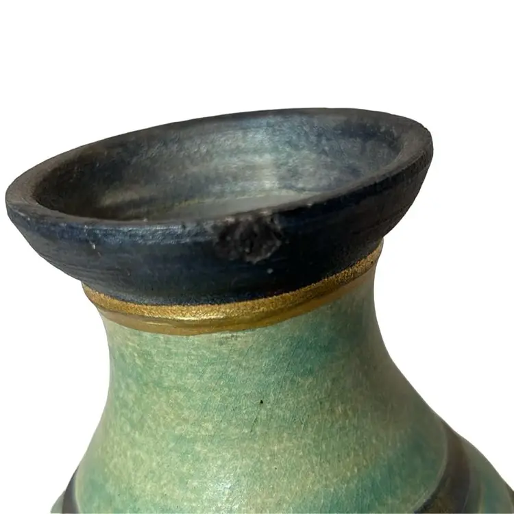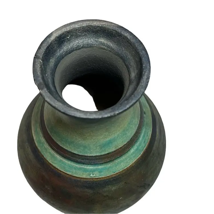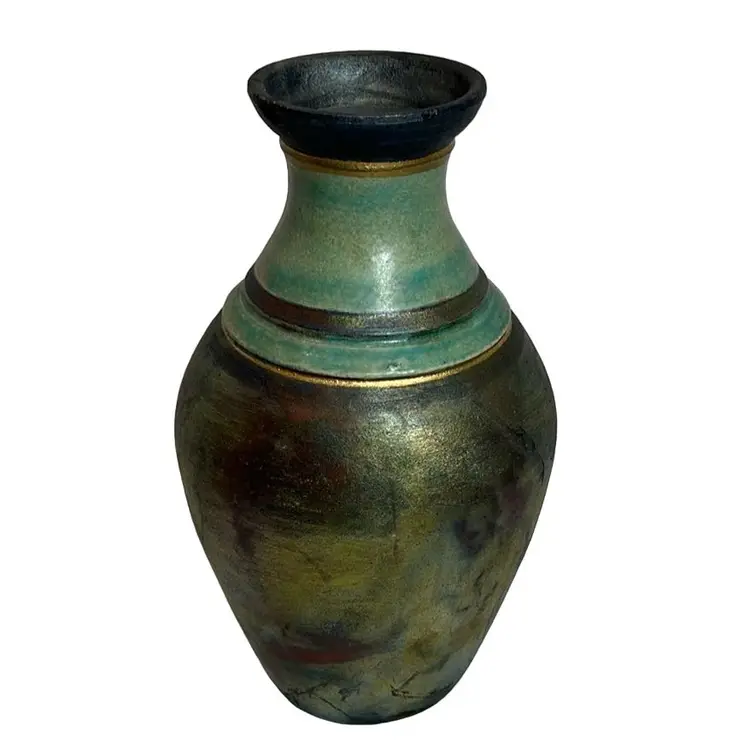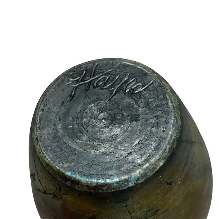 Beautiful RAKU piece- glazing at neck- repaired rim chip as shown- nice repair- 8.5” tall, 2.75” base, 2.5” mouth