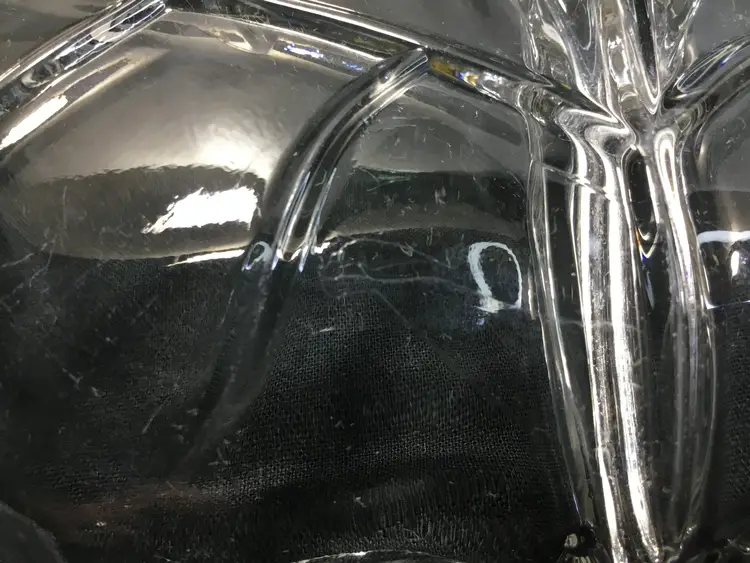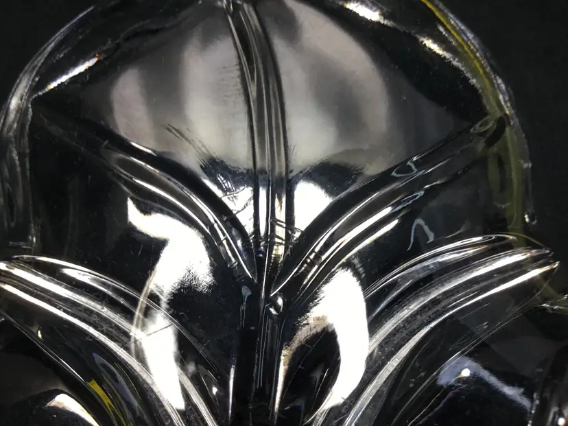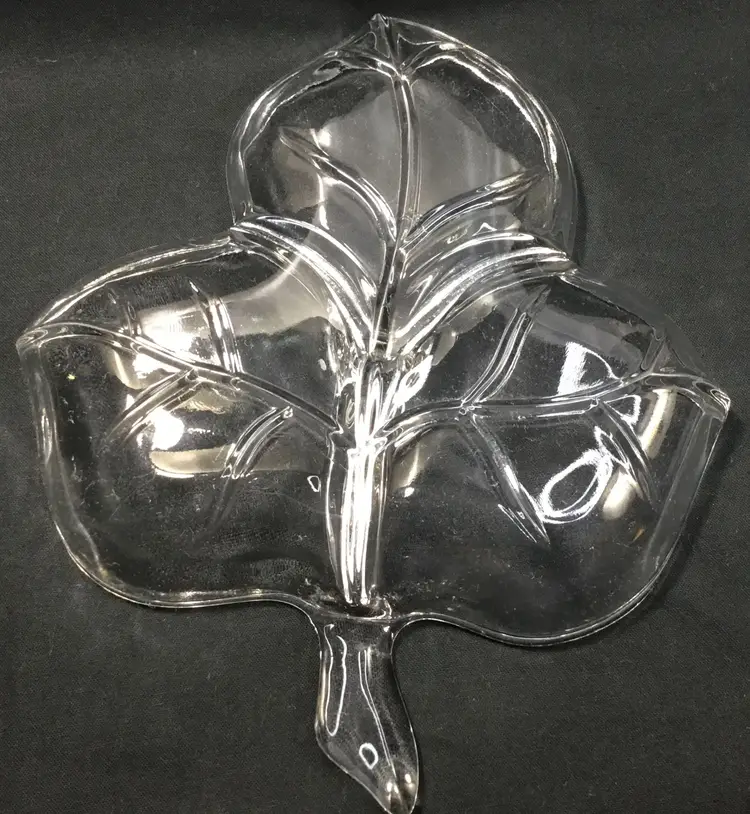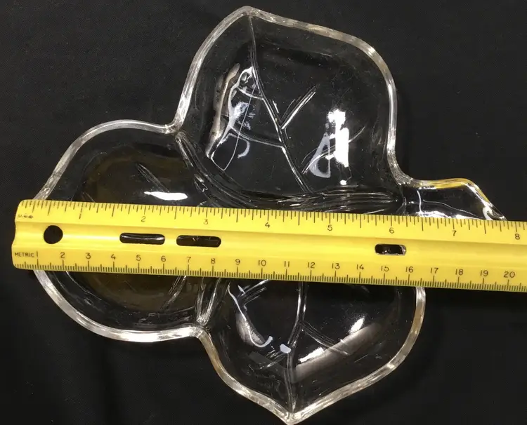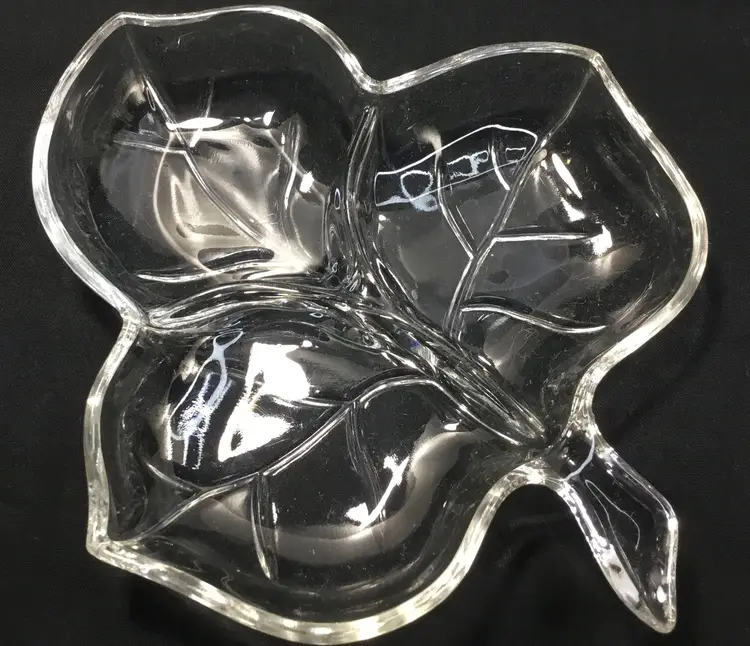 8 inches long by 6.75 inches wide by 1 inch deep, 3-lobed, clear glass, divided serving dish. Use for candies, nuts, relishes, or display. Divided into 3 compartments. Pressed glass made by Hazel Atlas glass company in 1960s. Small, shallow scratches on bottom, manufacturer's crease on bottom (See all photos)