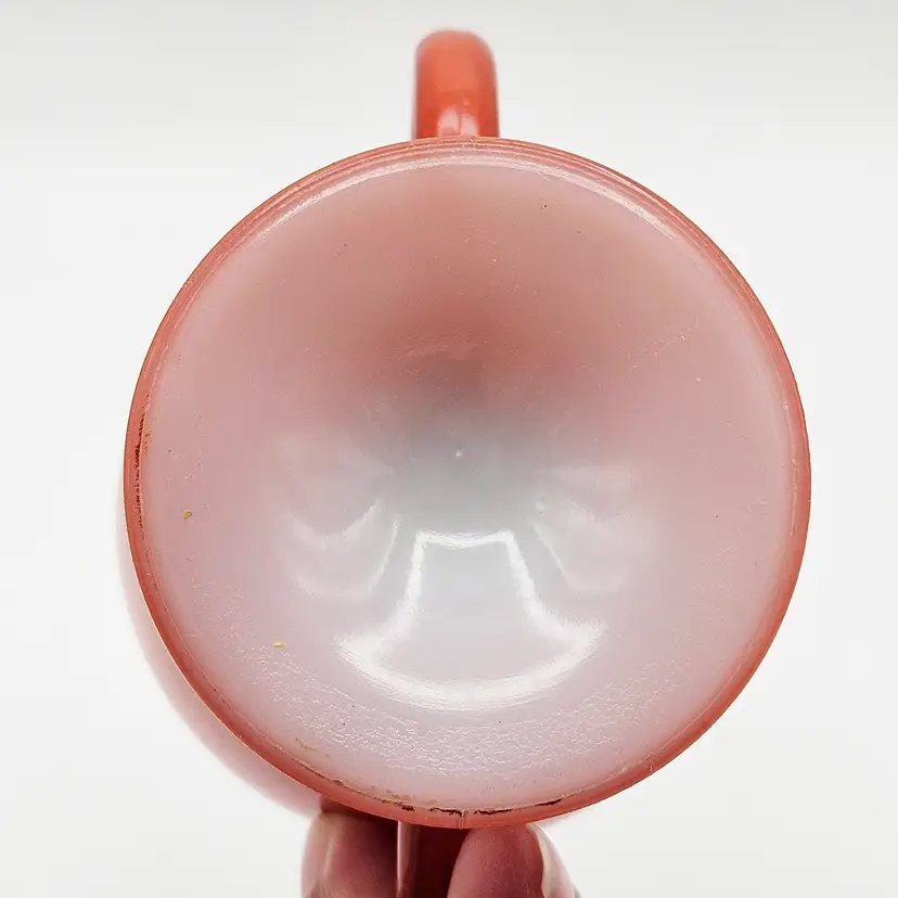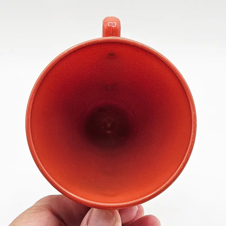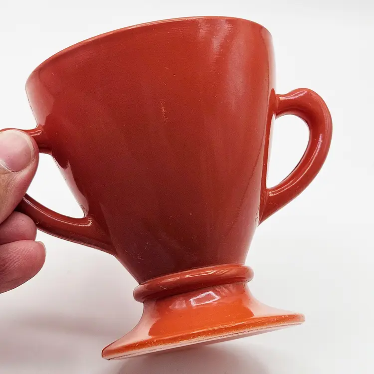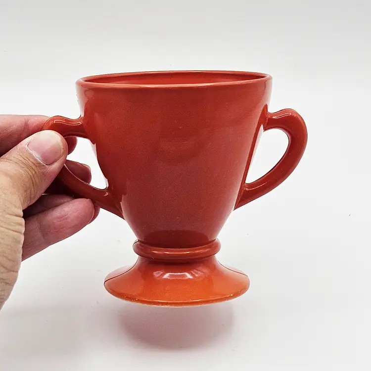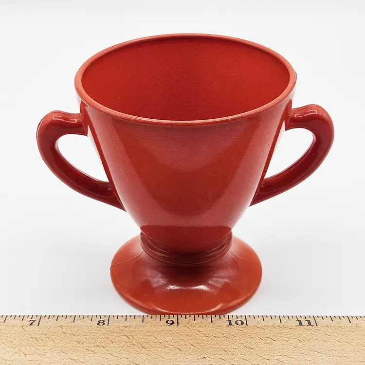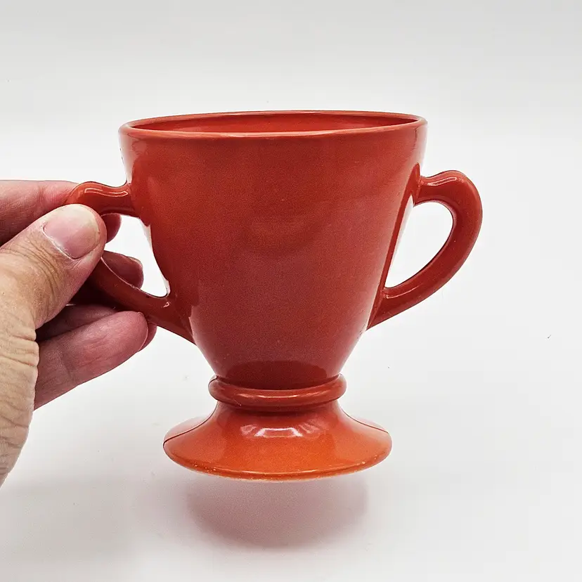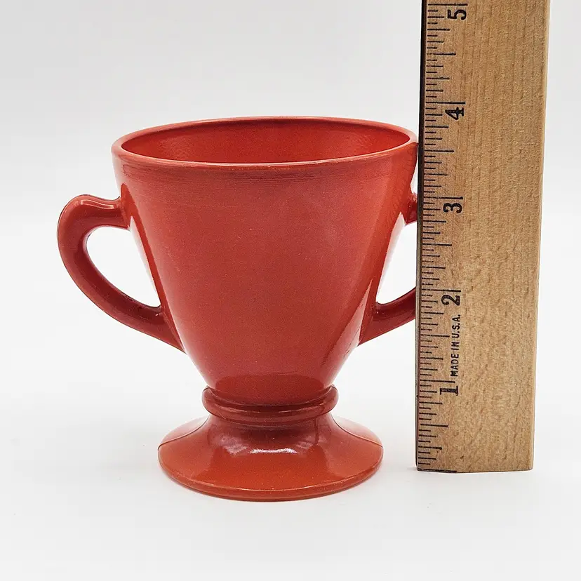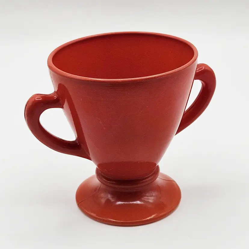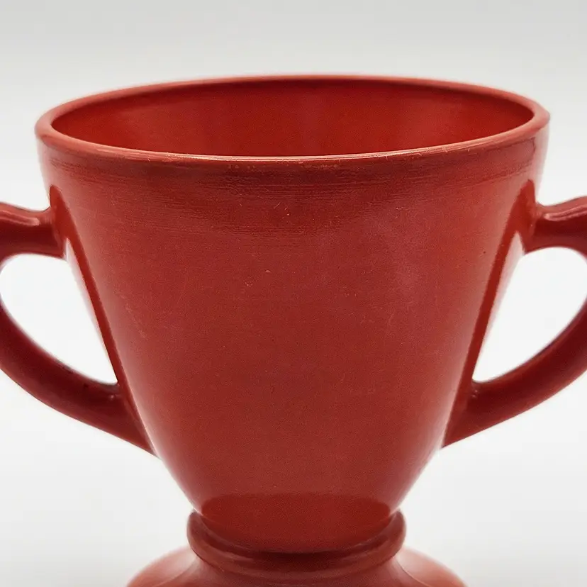 Hazel Atlas Ovide rust sugar bowl, manufactured in the United States.It is made from rust-colored Platonite glassware line, which is a type of opaque milk glass patented by Hazel Atlas. Officially known as Rust, though it is also described as burnt orange, salmon, or coral. The bowl features a trophy-style footed pedestal base with two curved handles.It is a discontinued pattern from the 1930s to the 1950s. A popular item for collectors of mid-century modern kitchenware. MCM.