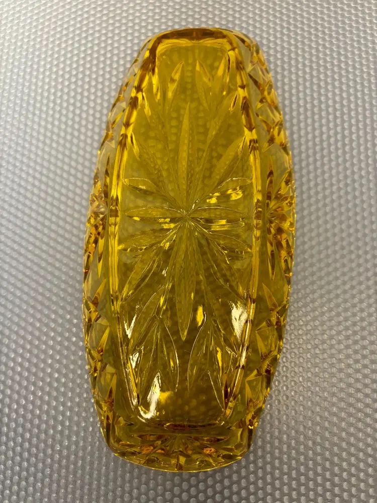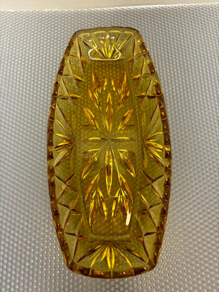 The Hazel Atlas Prescut Gold Pattern Celery Dish is a beautiful piece of mid-20th-century glassware. Produced by the Hazel Atlas Glass Company, this vintage dish features the intricate Prescut Gold pattern, known for its elegant and detailed design. Ideal for both display and use, it adds a touch of vintage sophistication to any table setting. Perfect for collectors and those who appreciate classic glassware, this celery dish is a charming addition to any collection.