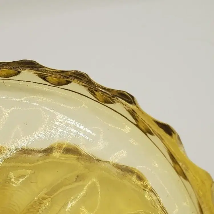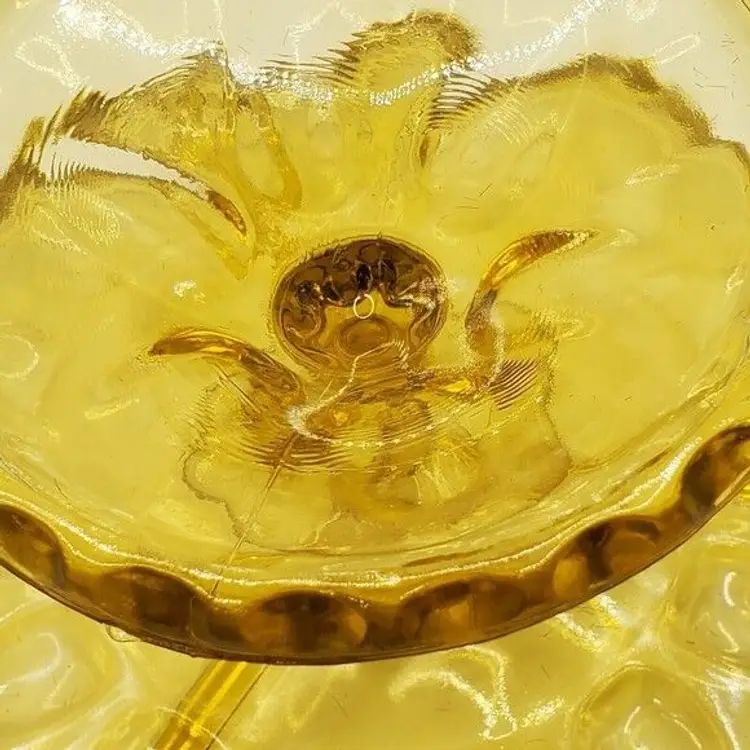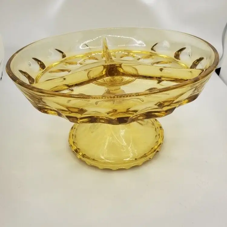 This Hazel Atlas Reflection Amber Thumbprint Divided Footed Relish Dish Vintage is a beautiful yellow dish that brings a touch of elegance to any table setting.