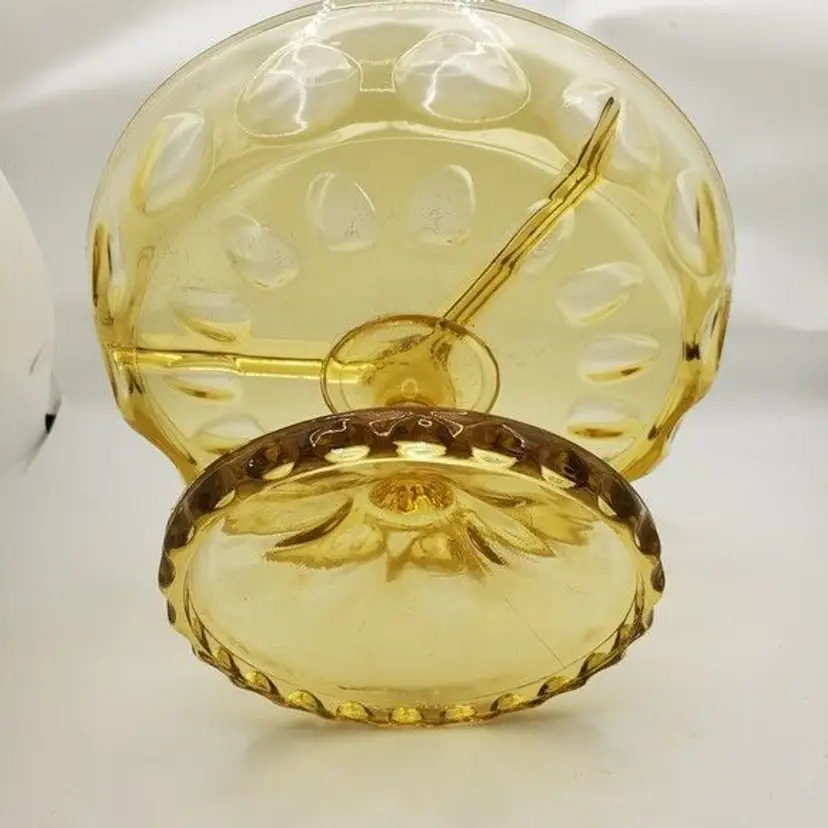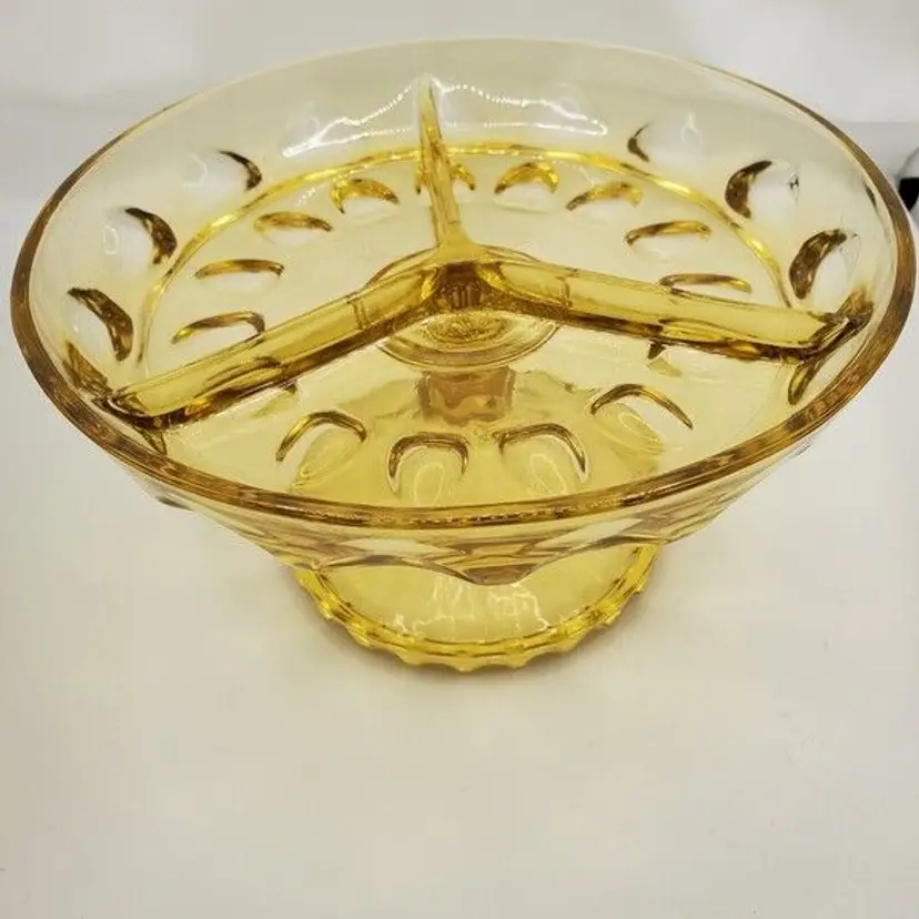 • Vintage Hazel Atlas design • Reflective Amber Thumbprint pattern • Divided for multiple relish options • Footed for stability and style