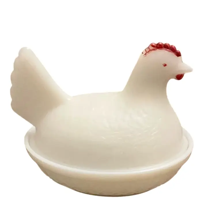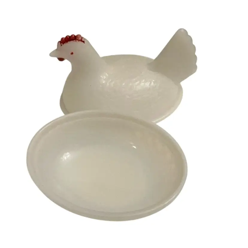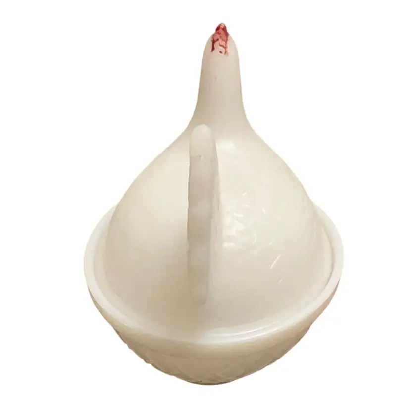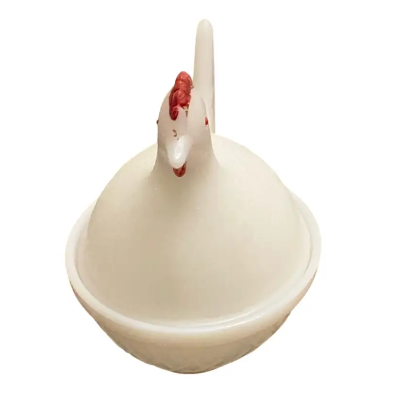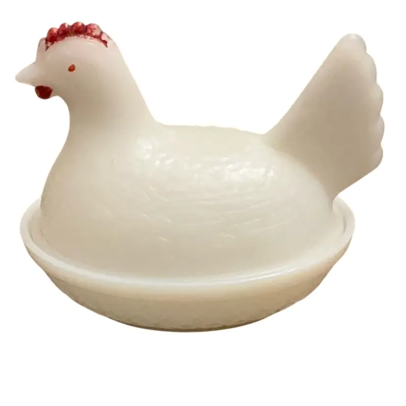 Very old milk glass with the blue hue. Has the ring of fire when held up to the light dating this piece as quite old possibly 1940’s. No sticker or stamped logo. Some paint loss on the hen’s comb but that is to be expected at this age.