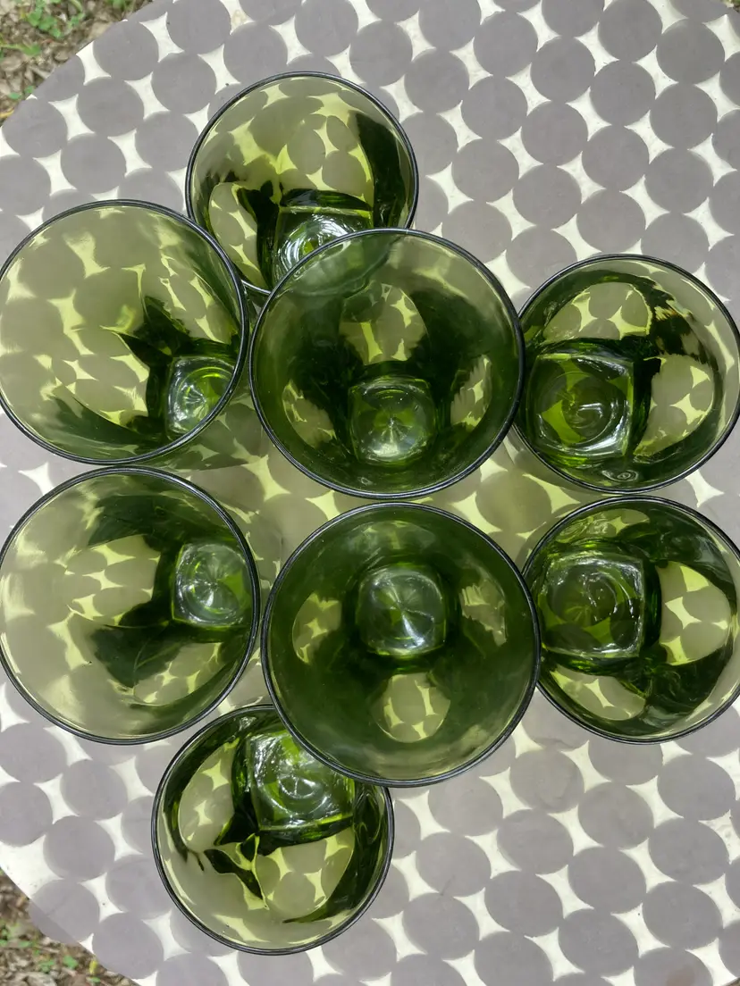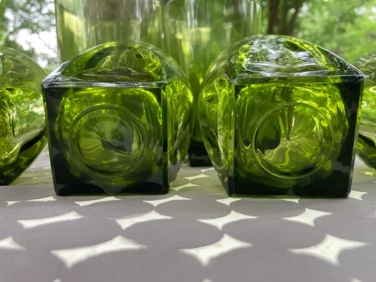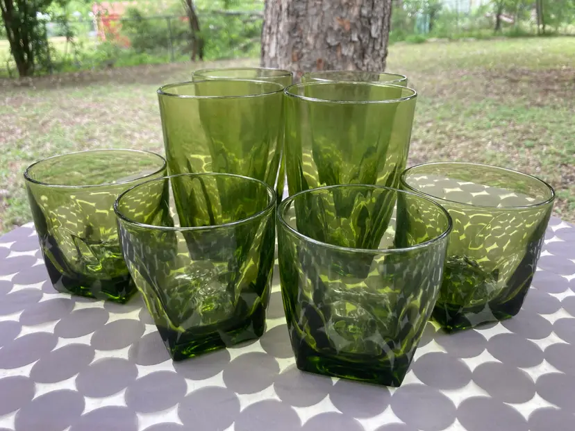 Add some vintage class to your MCM bar with this set of 8 Hazel Atlas square-bottom avocado glasses. The rocks glasses hold 8 ounces and the taller ones are 12oz.