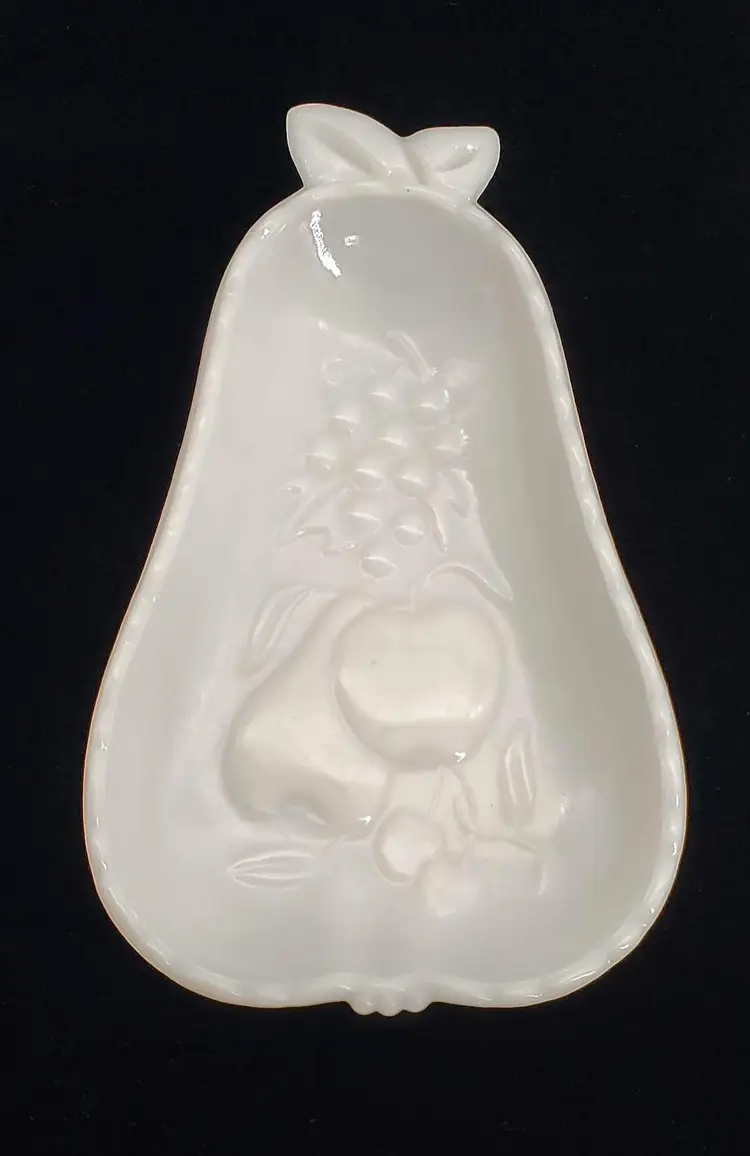 This vintage Hazel Atlas 1940's milk glass dish depicts fruits on the front (pear, apple, cherries & grapes), and lovely pear blossoms on the back.