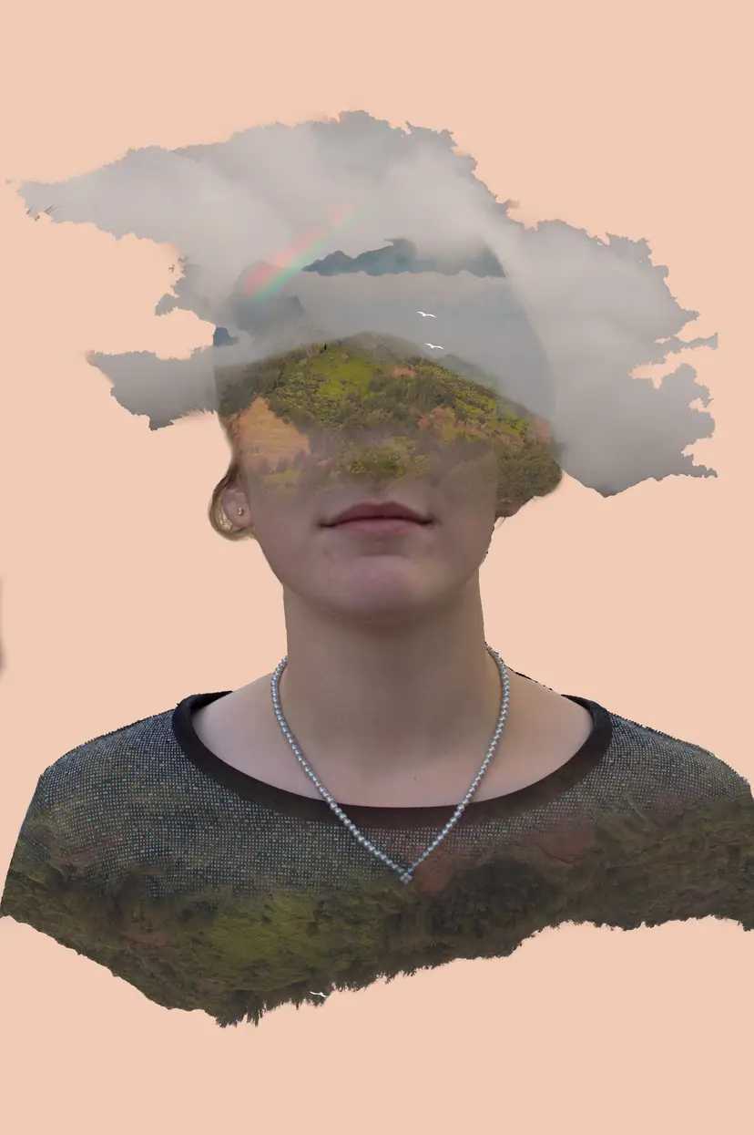 On the surface this image depicts a portrait of a women turning into the forest and a mountain top. Yet if you take a closer look you'll find bird, a rainbow and maybe even a few hikers. It's a reminder to not take the simple things for granted, and even the smallest detail can bring an exciting discovery. Dream big and keep your head in the clouds.