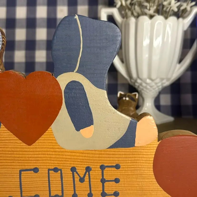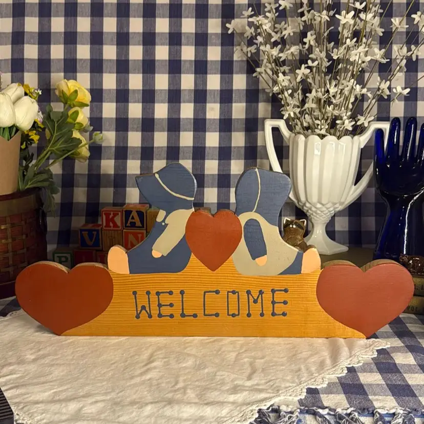 Heart and Boy & Girl Welcome Sign. 17.5" long, 8" tall, and 0.75" thick.