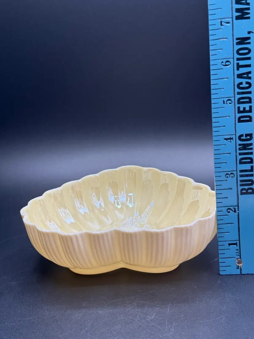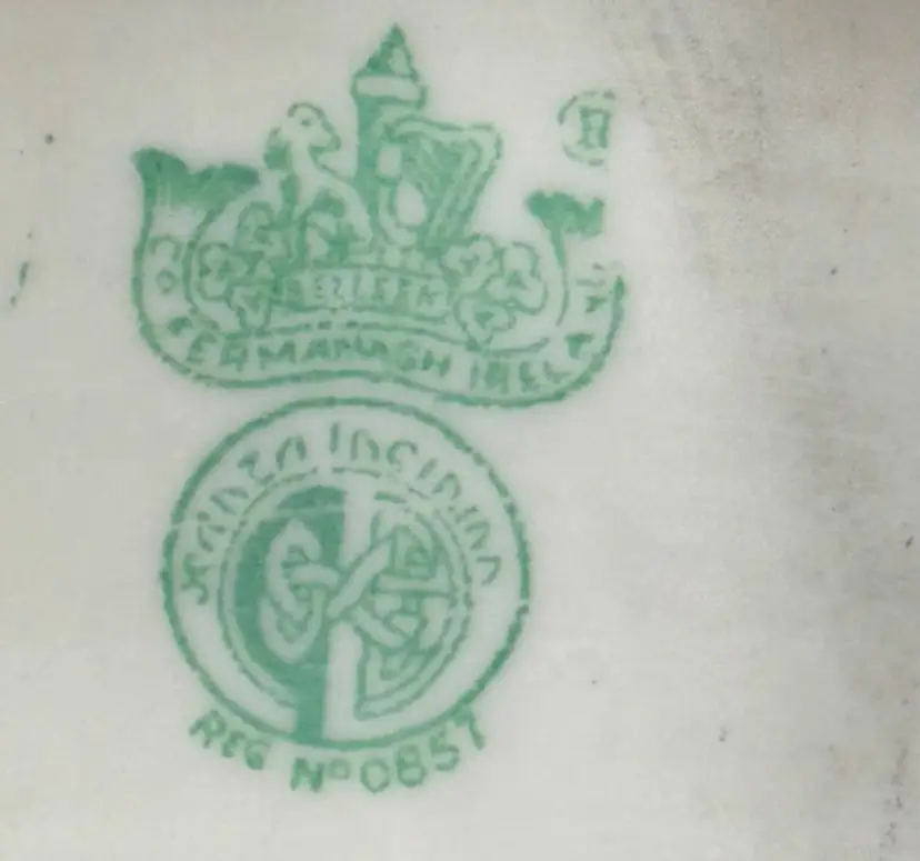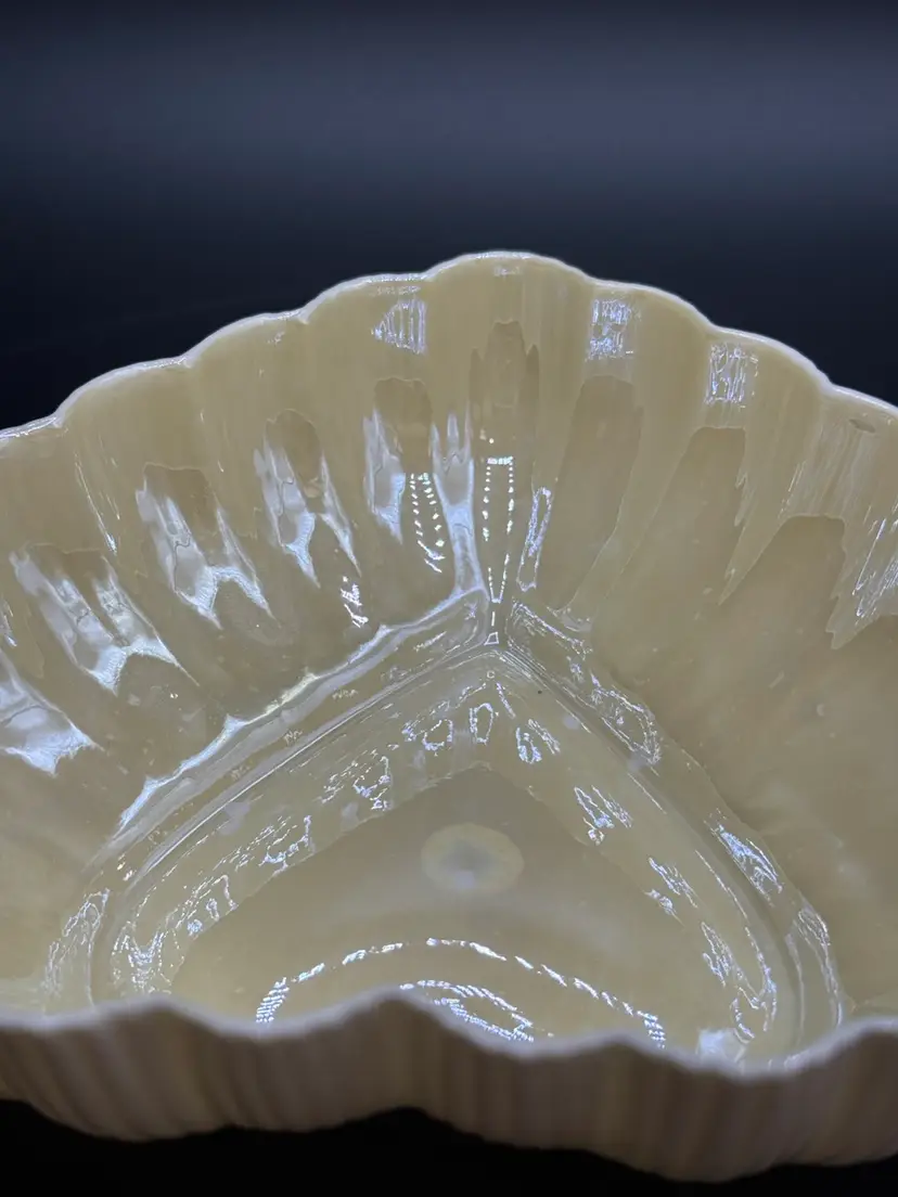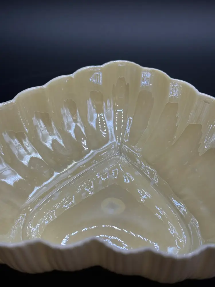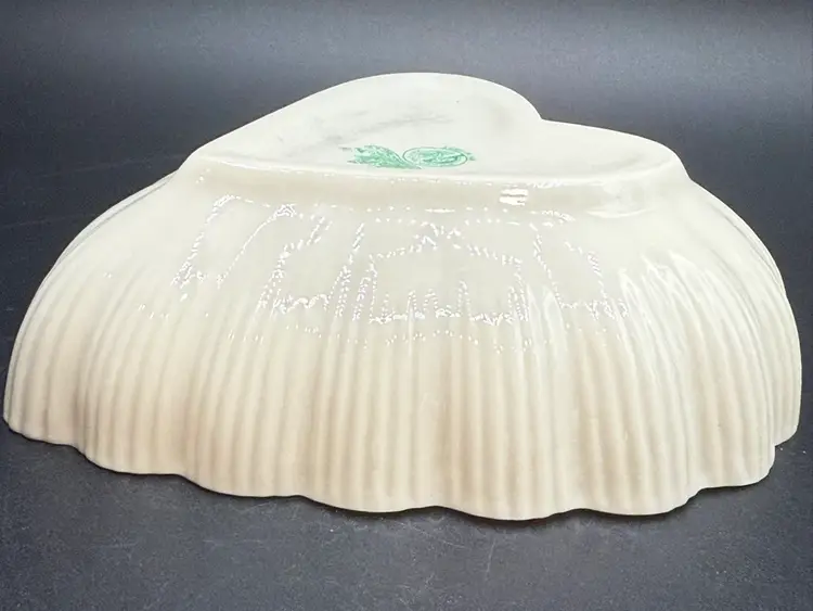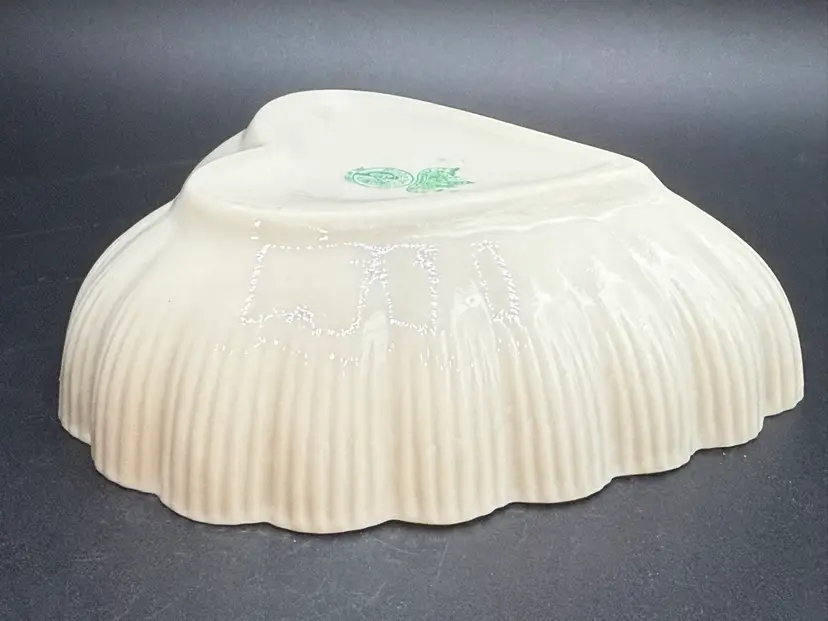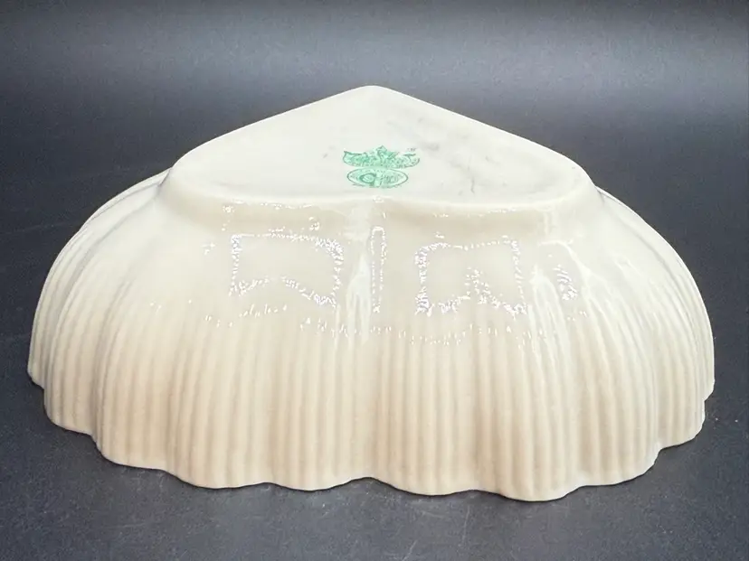 Description: This piece is made of fine Parian China which is a type of Porcelain. There is a Yellow Luster glaze to the interior of the piece. The base stamp color Green is the 6th mark for this line and dates the piece from 1965-1980. Belleek was est. in 1857 located in the Village of Belleek Co Fermanagh on the banks of the River Erne. Each piece of pottery passes through 16 pairs of hands to ensure quality of the final product. This company is still in business.