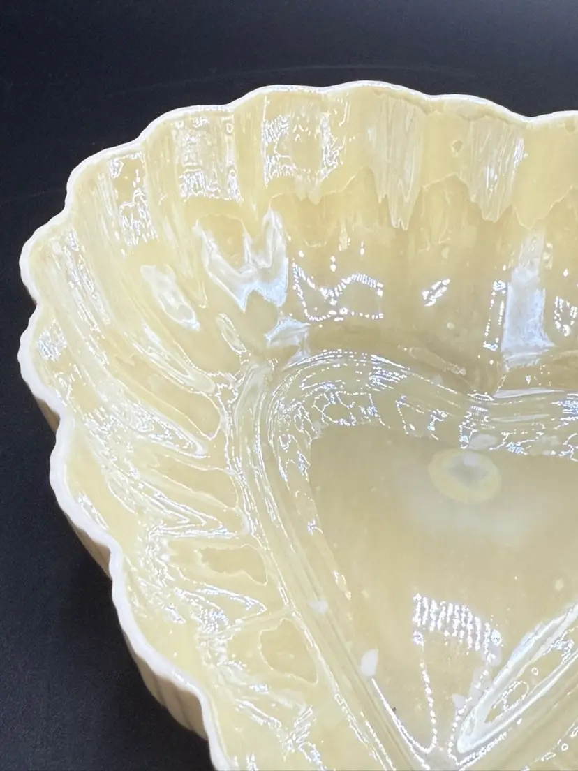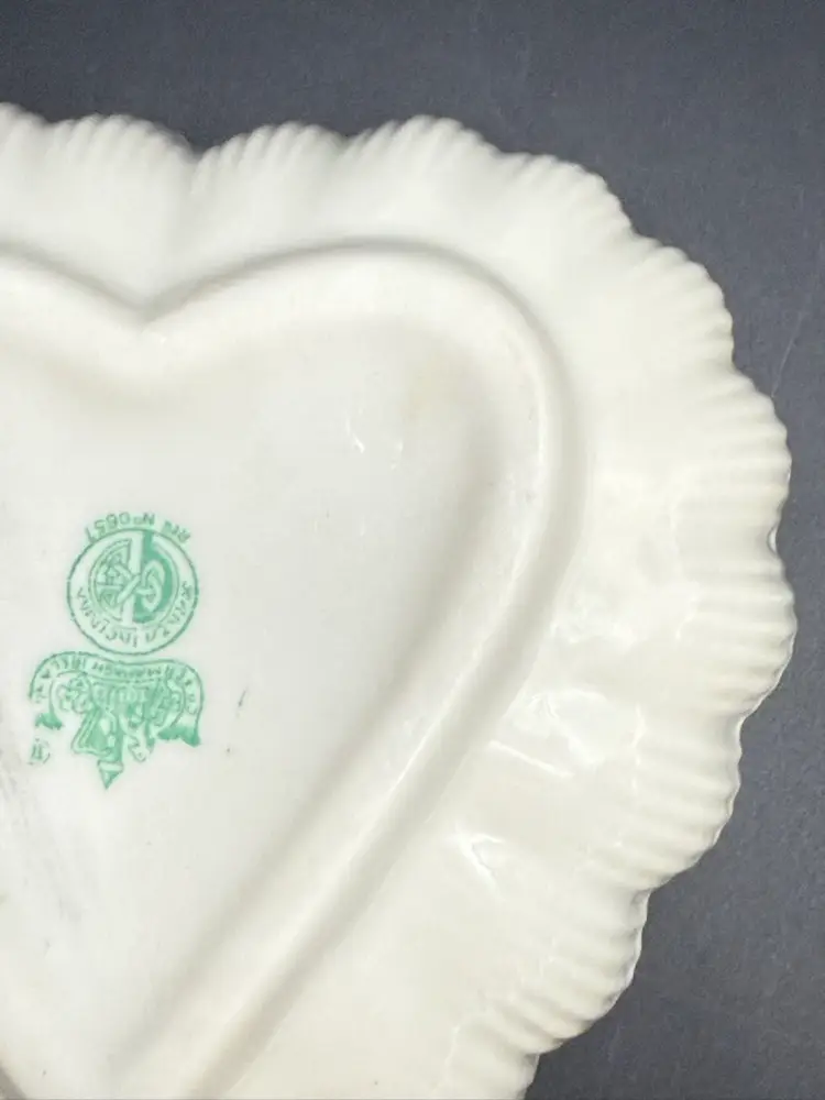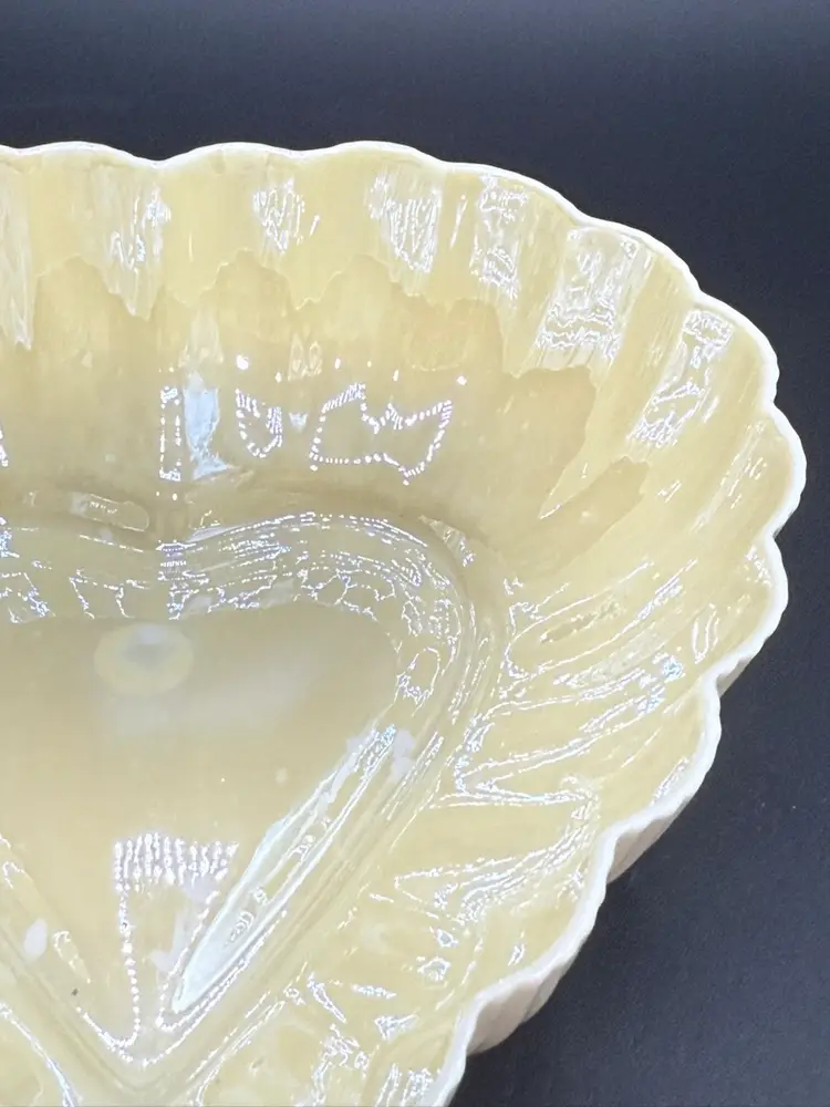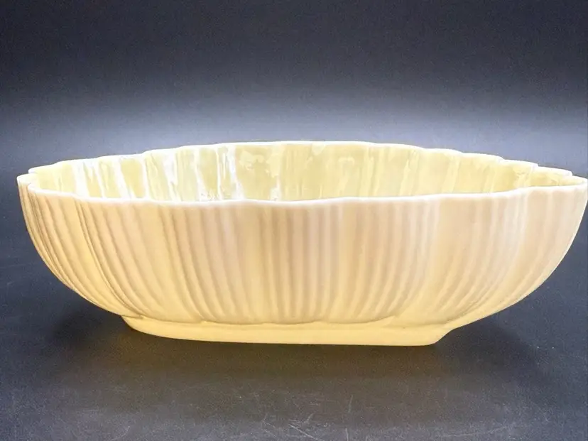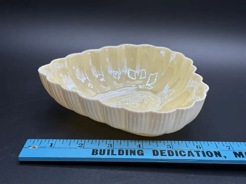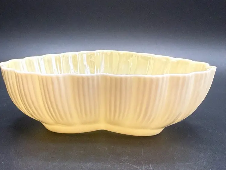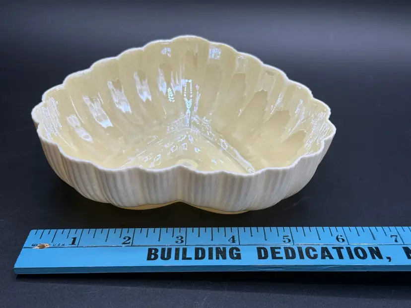 Description: This piece is made of fine Parian China which is a type of Porcelain. There is a Yellow Luster glaze to the interior of the piece. The base stamp color Green is the 6th mark for this line and dates the piece from 1965-1980. Belleek was est. in 1857 located in the Village of Belleek Co Fermanagh on the banks of the River Erne. Each piece of pottery passes through 16 pairs of hands to ensure quality of the final product. This company is still in business.