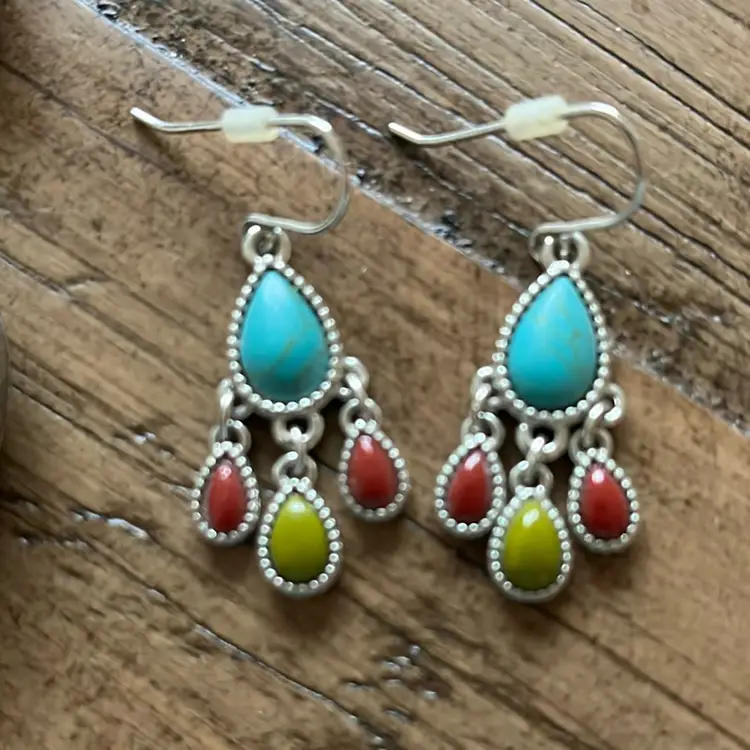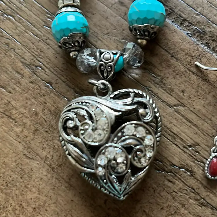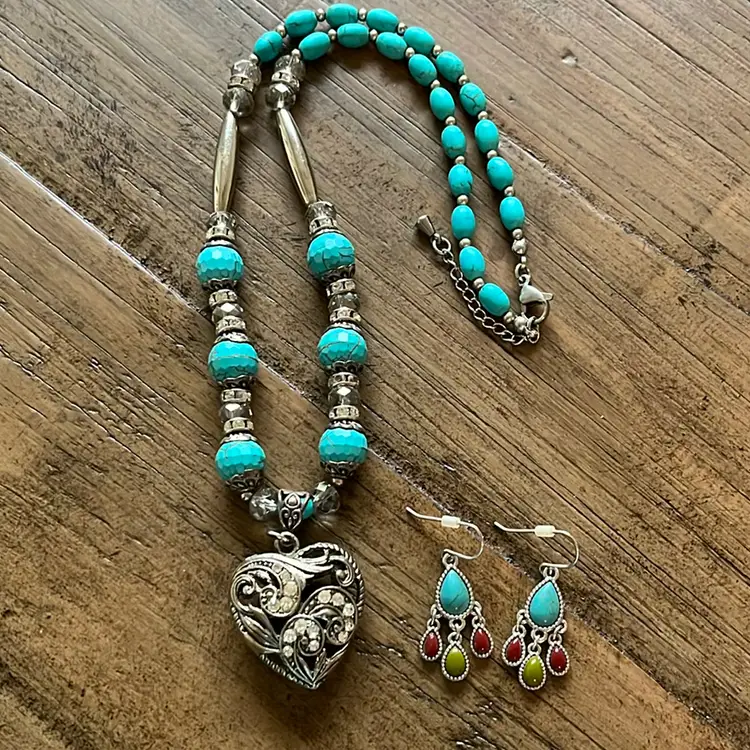 Necklace measures 22” Earrings have ear wire and a 1” drop