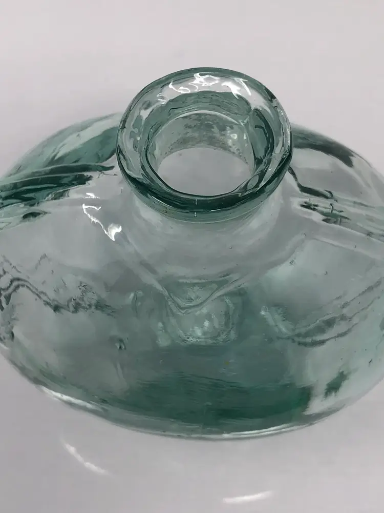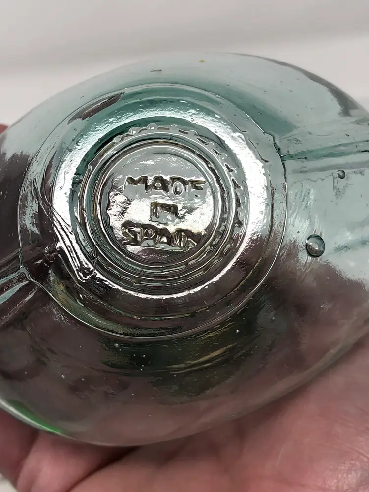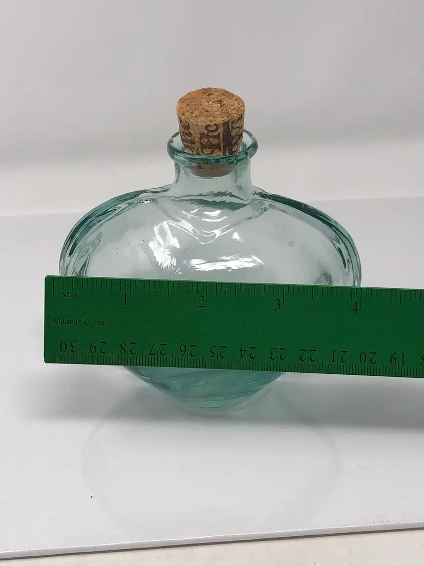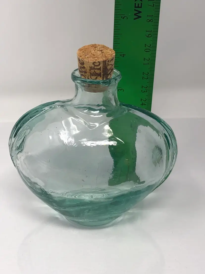 5" heart-shaped glass bottle with cork marked made in Spain on the bottom. Glass is a wavy pale green with a thick ridge on the sides. No chips or cracks