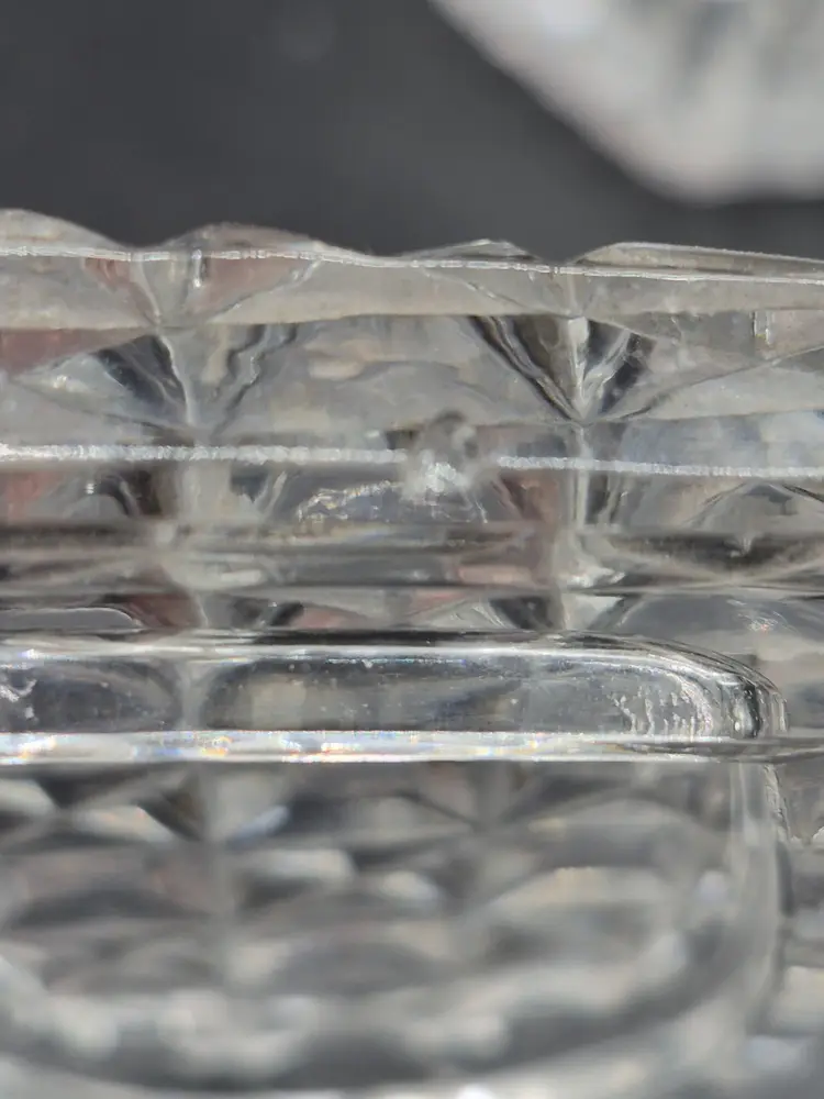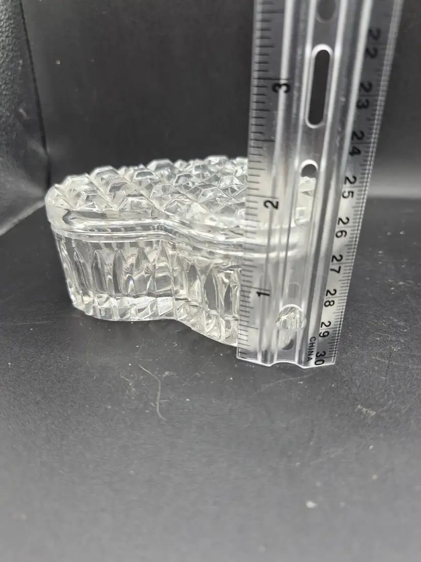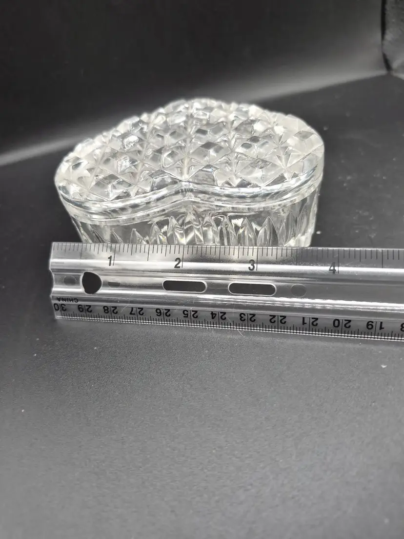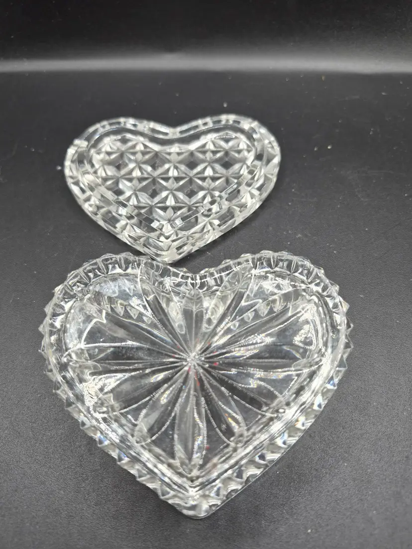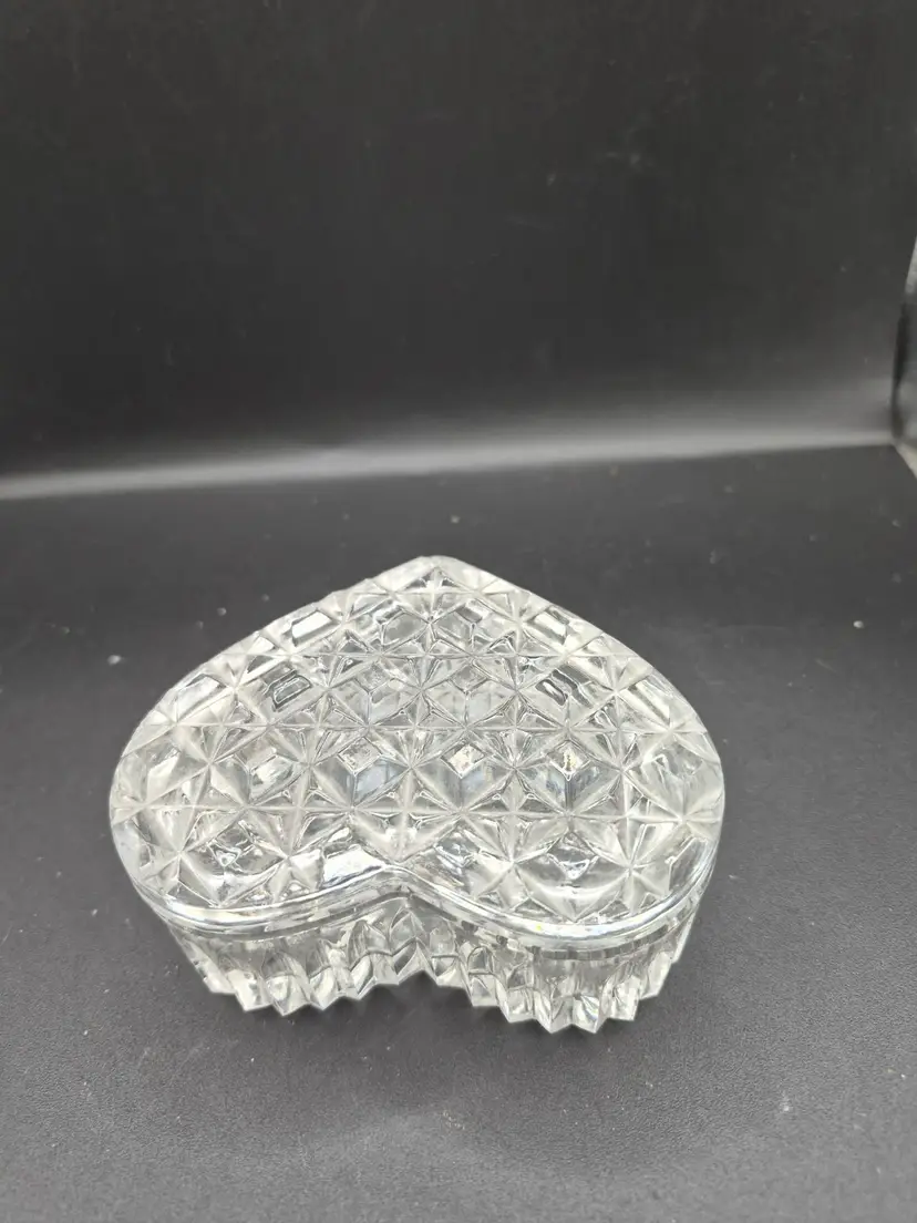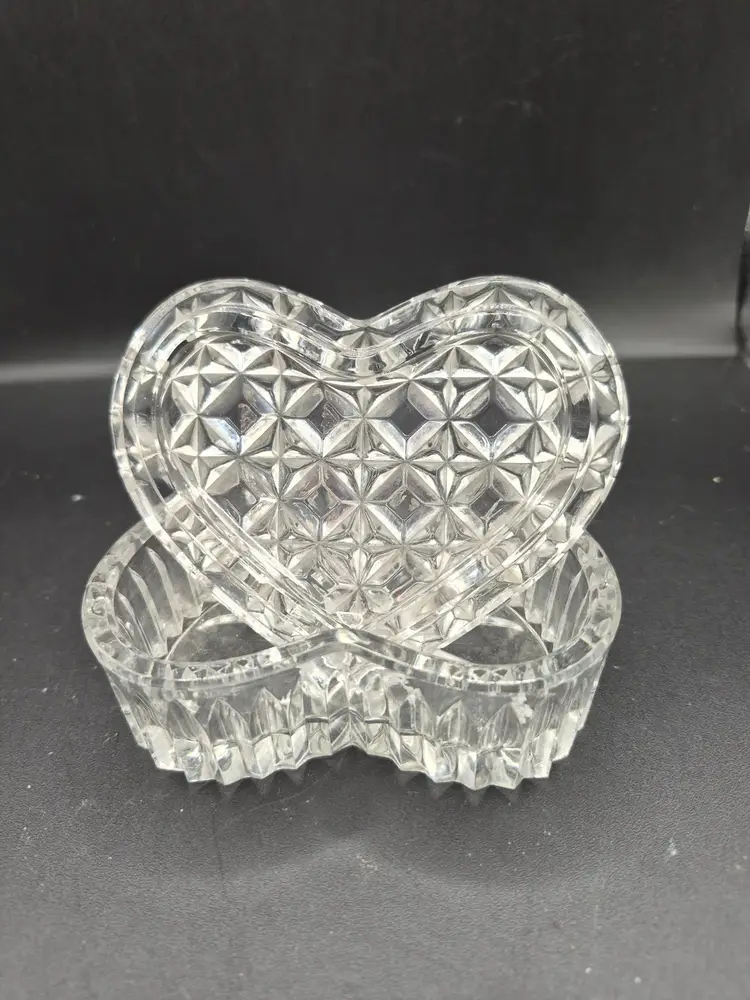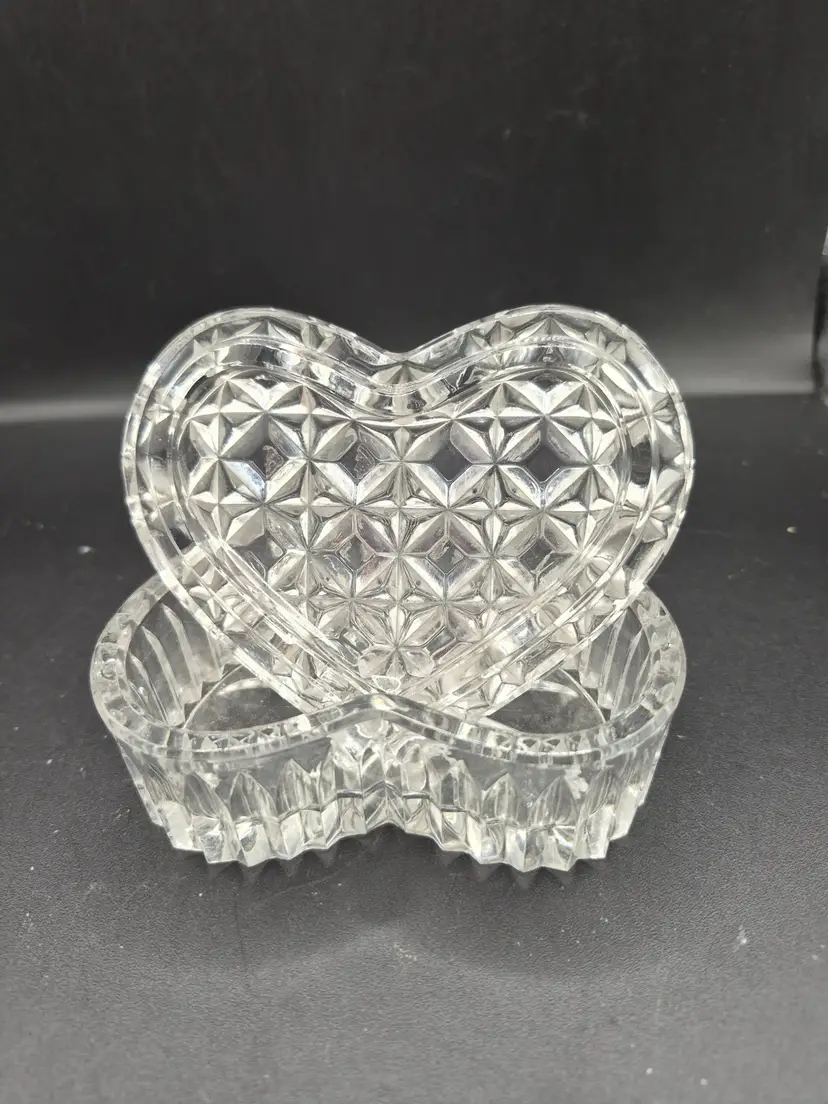 A charming heart-shaped glass box with intricate pressed patterns. This timeless piece is ideal for keeping small treasures or jewelry secure. Its radiant design reflects light beautifully, adding a touch of elegance to any space. A heartfelt gift or delightful keepsake for someone special.
