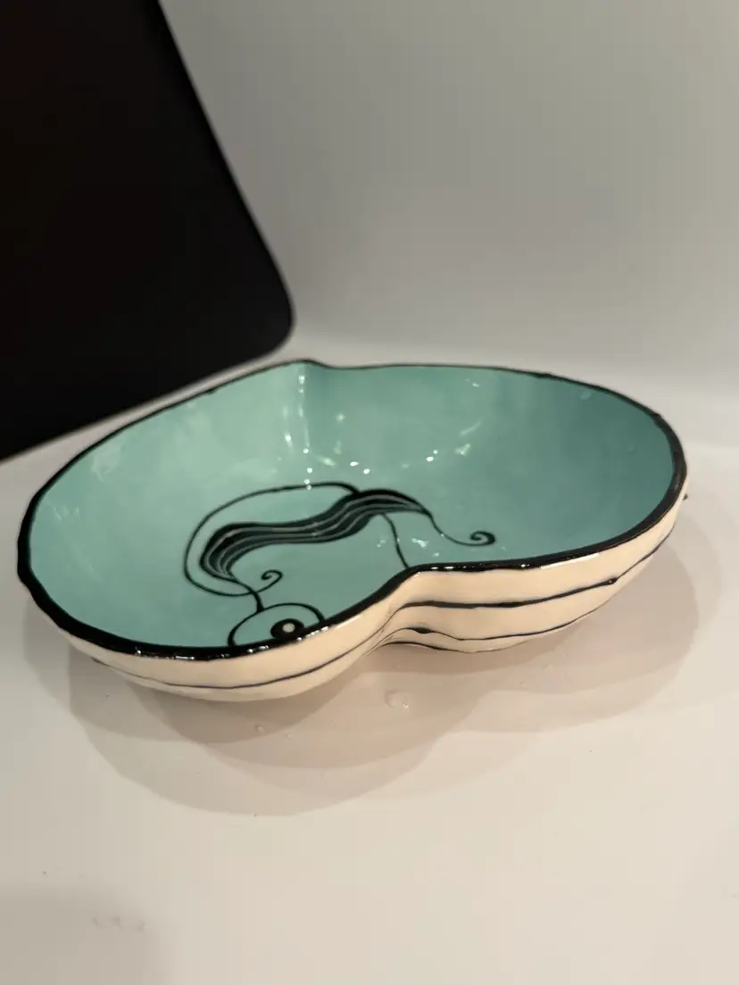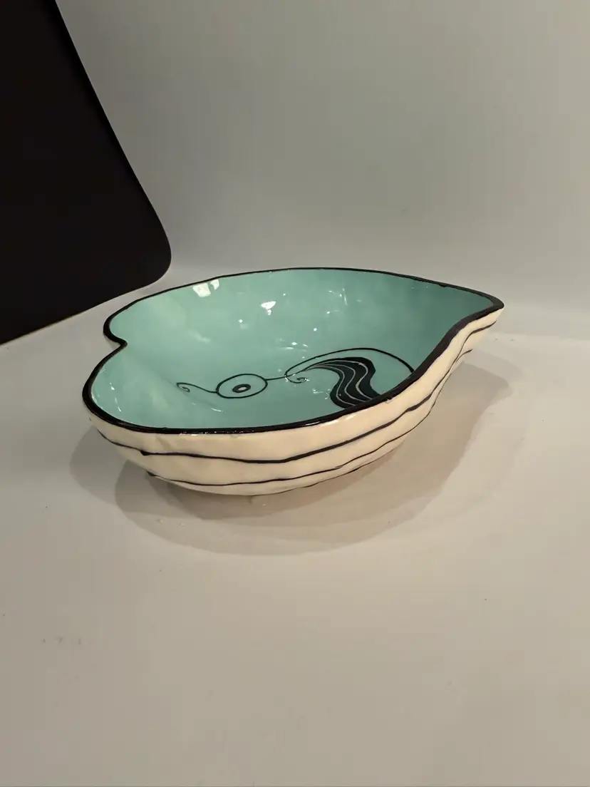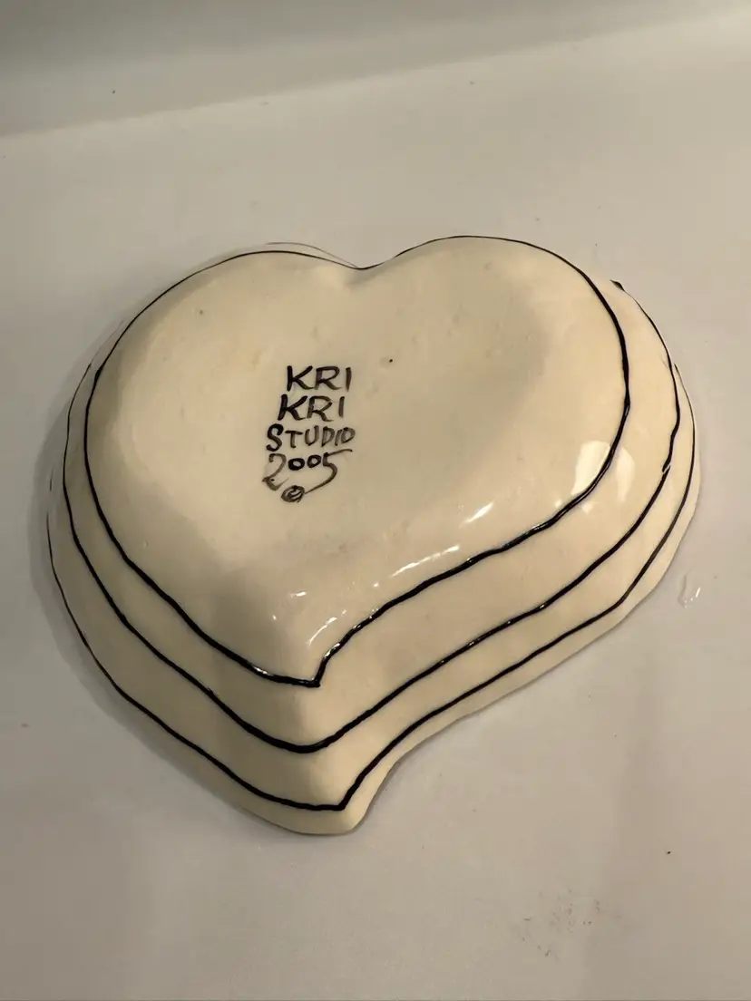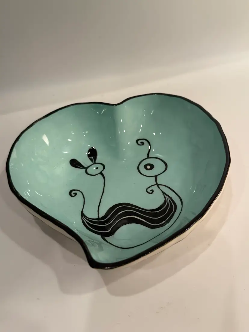 Light Blue Heart Shaped dish 6” by 6.5” Delicate with 1/8” thin porcelain. Decorated with black accents and stripes that can be felt by the touch.