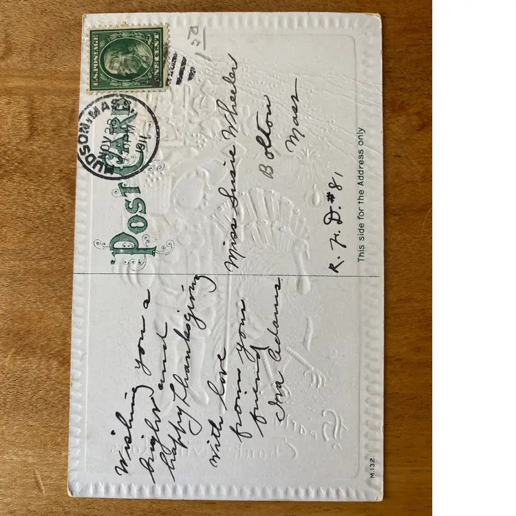 Signed. Minor creasing and a scuff int he top right corner. Measures 5.5"x3.5". Post marked 11/28/1911