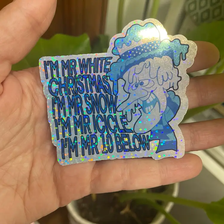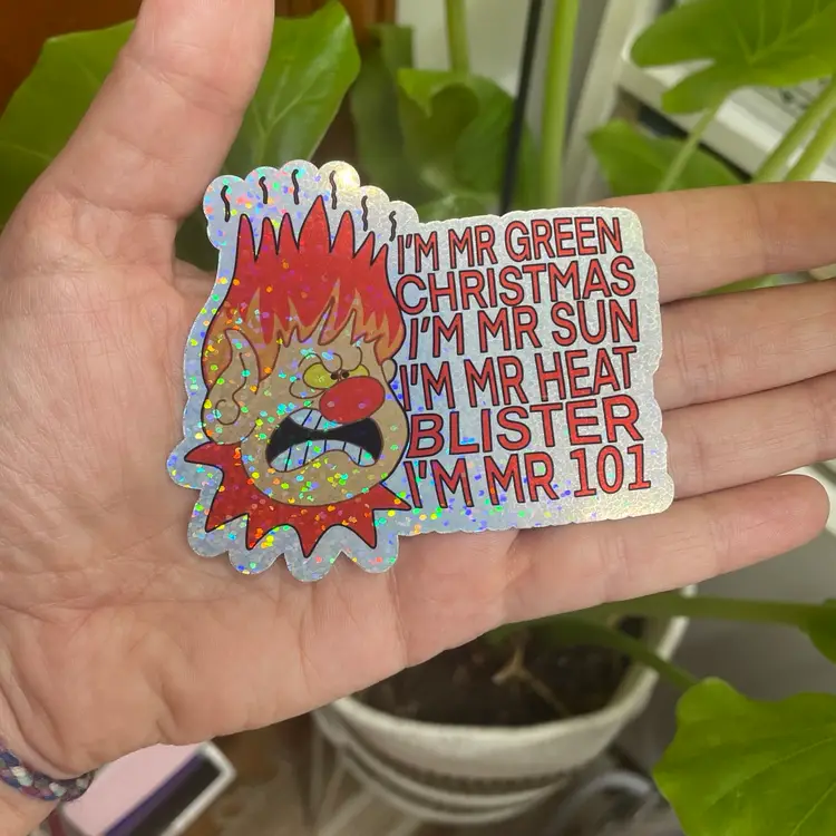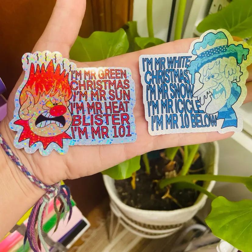 Capture the festive rivalry with our Heat Miser & Snow Miser sticker set from the classic movie A year without a Santa Clause! These quirky stickers bring the classic characters to life, adding a dash of holiday humor. Choose your mood – whether it's sizzling heat or icy coolness, these stickers have your seasonal vibes covered. Hand Drawn Each Sticker Approx 3” Dot Holographic Sticker Do not submerge in water for longevity Stamp Mailed only Set of 2 Thanks ABC Matt for the suggestion