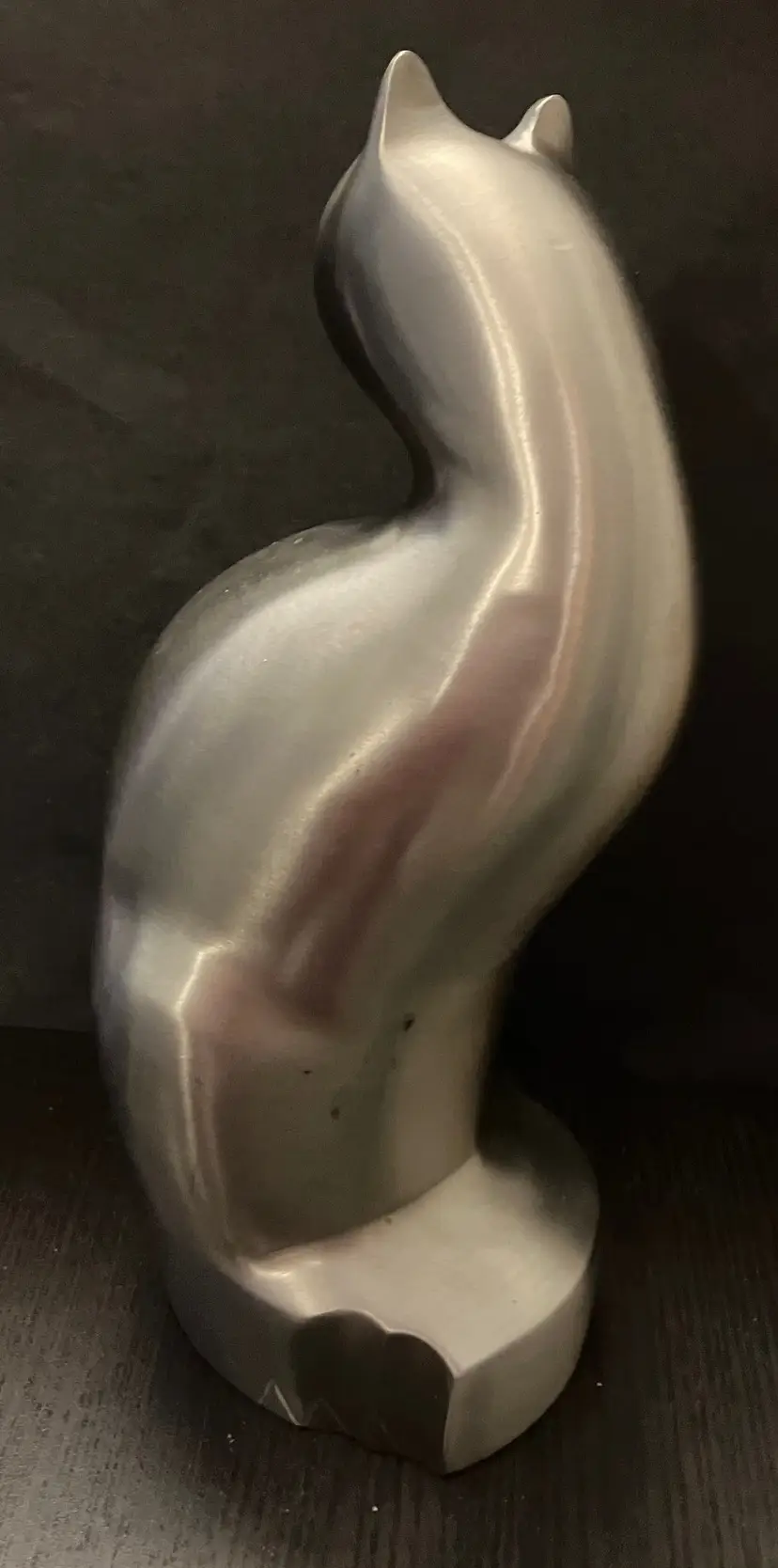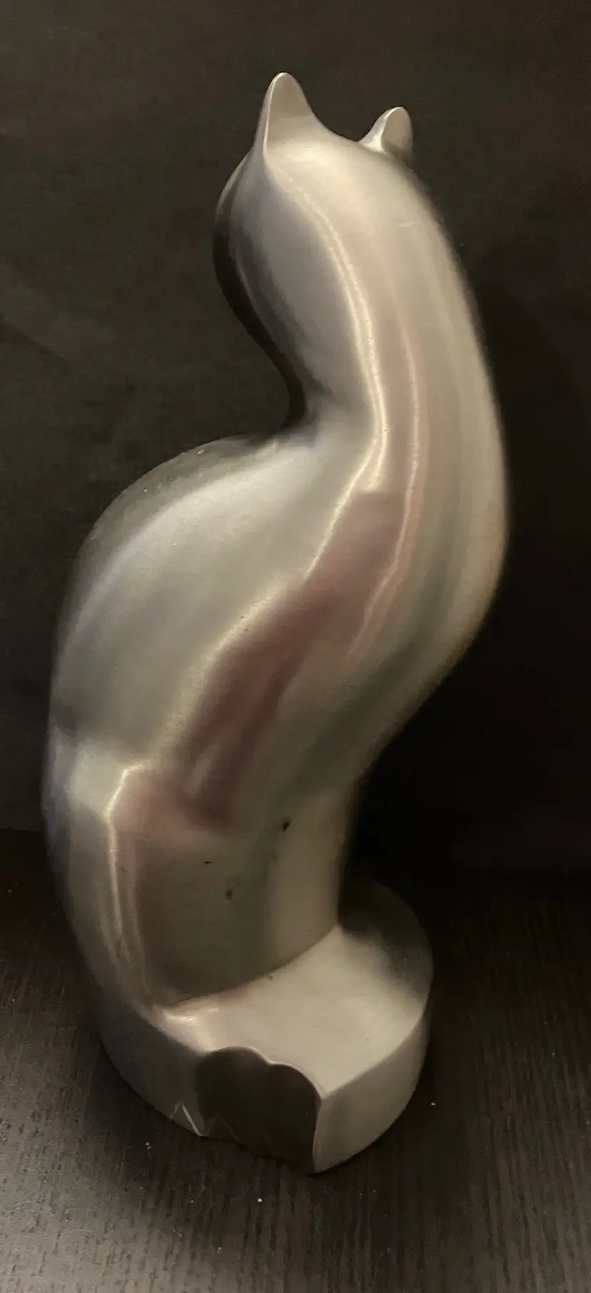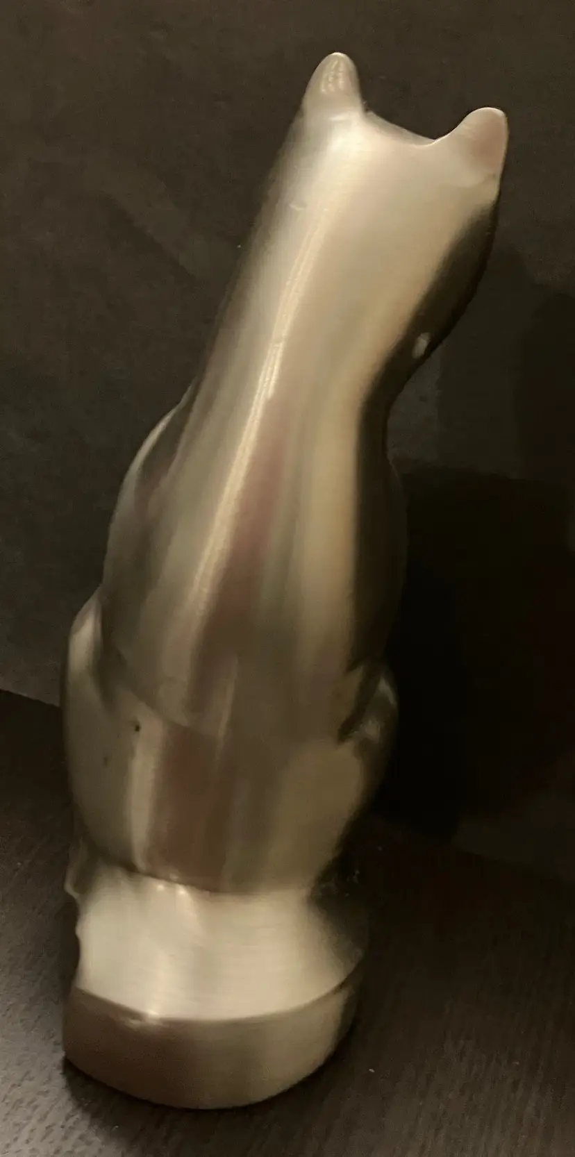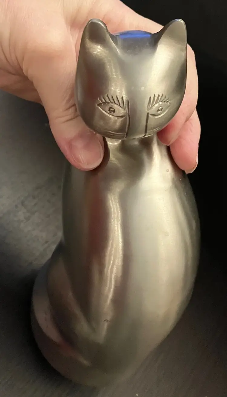 Polished metal, could be brass, aluminum, or pewter. Can be used as decor or a memorial urn. There is a preservative pouch in the empty container. There are no ashes and it doesn't look like there has been any ashes.There is wear on the bottom, specifically on the cover. There is no condition issues on the finish everywhere else. Measures 9" tall and about 3" wide and deep. Weighs 3 1/2 lbs before packaging.