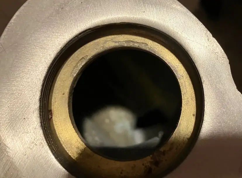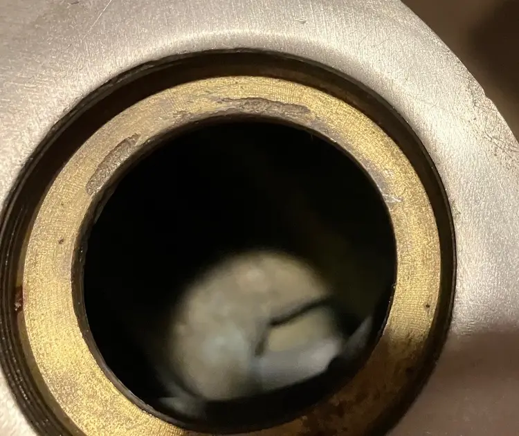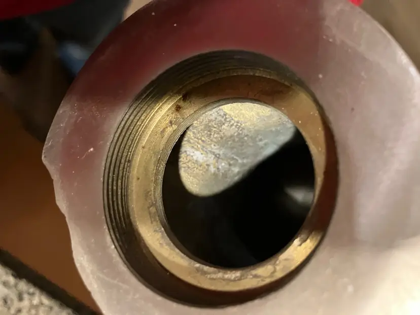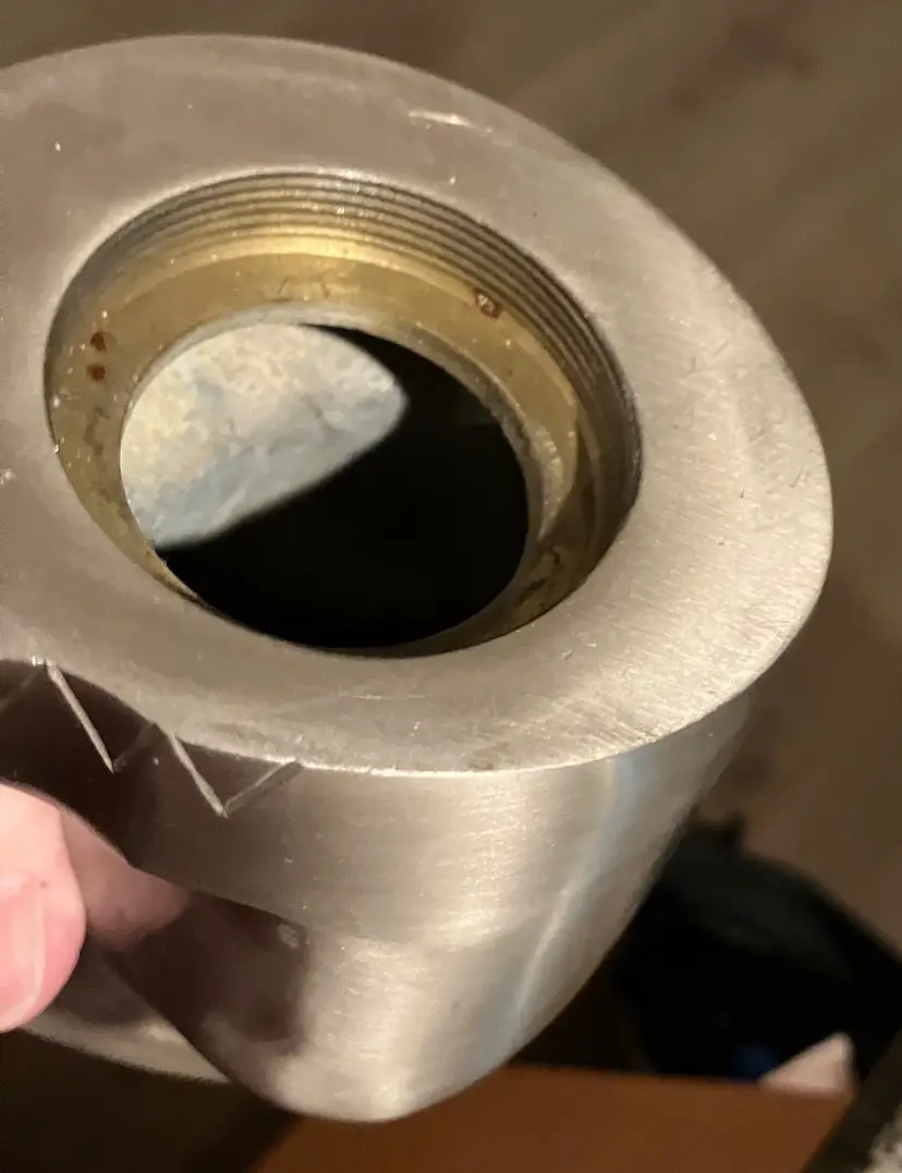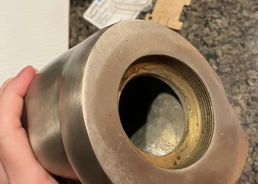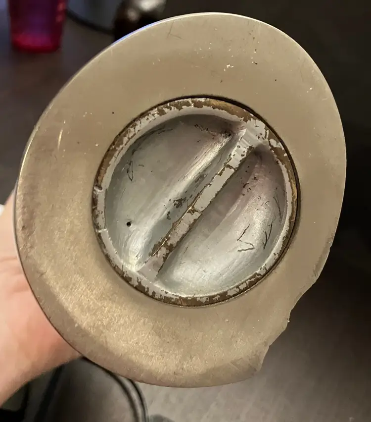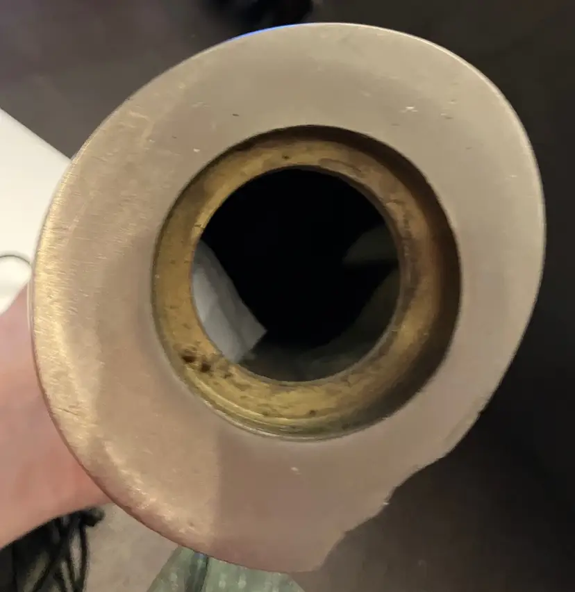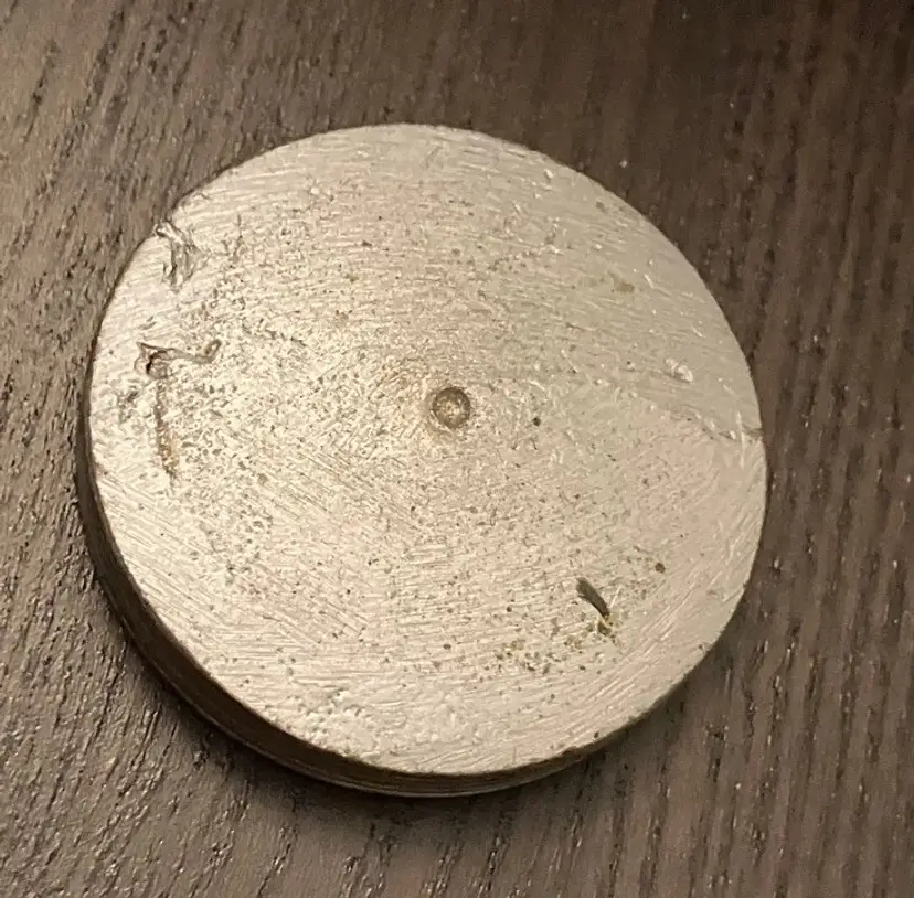 Polished metal, could be brass, aluminum, or pewter. Can be used as decor or a memorial urn. There is a preservative pouch in the empty container. There are no ashes and it doesn't look like there has been any ashes.There is wear on the bottom, specifically on the cover. There is no condition issues on the finish everywhere else. Measures 9" tall and about 3" wide and deep. Weighs 3 1/2 lbs before packaging.