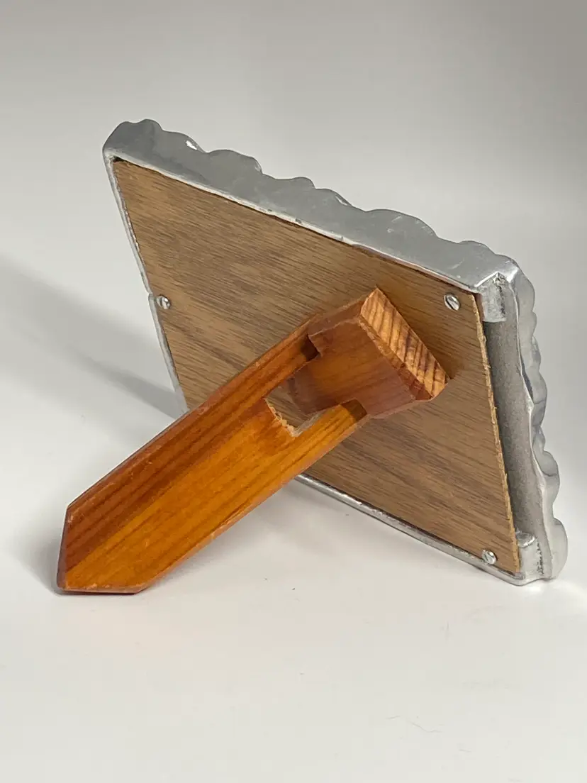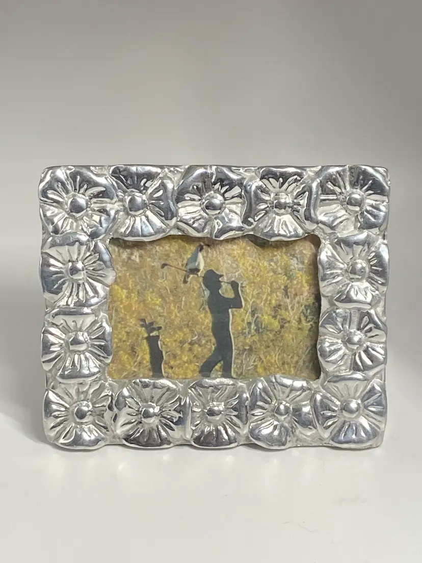 This heavy pewter and wood photo frame with a floral design is perfect for all occasions. The rectangular shape, silver color, and ornate features add an elegant touch to any room. The rear-loading photo insertion type allows for easy customization, while the metallic finish adds a shiny silver look. This frame is a decorative collectible that can hold one photo and is a beautiful addition to any home decor.
