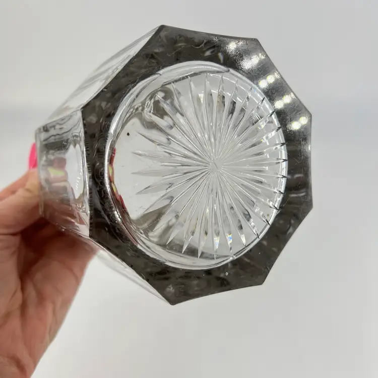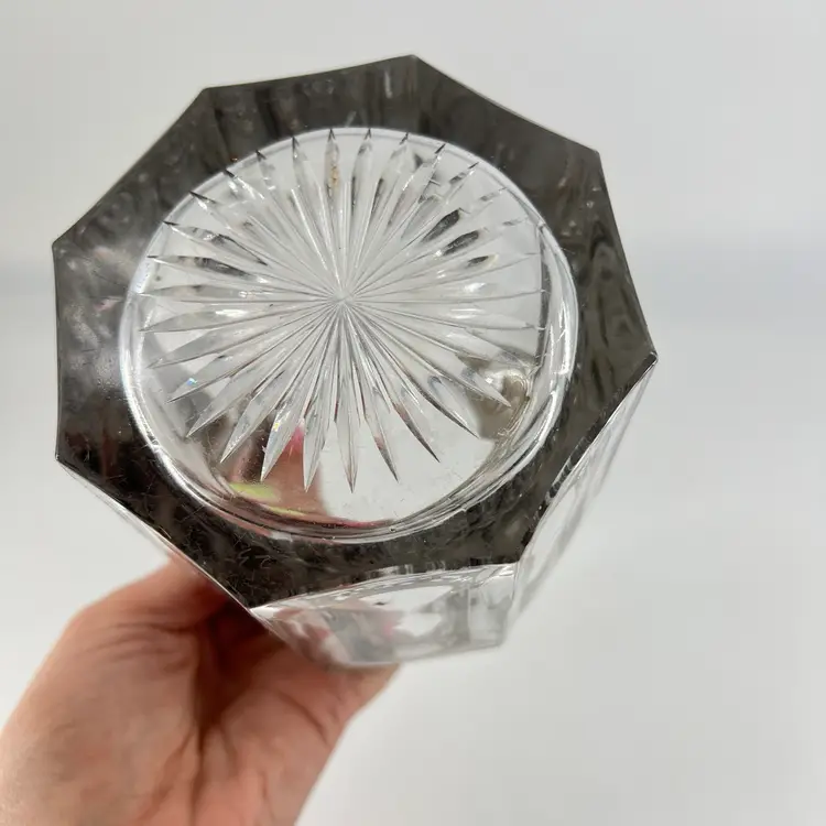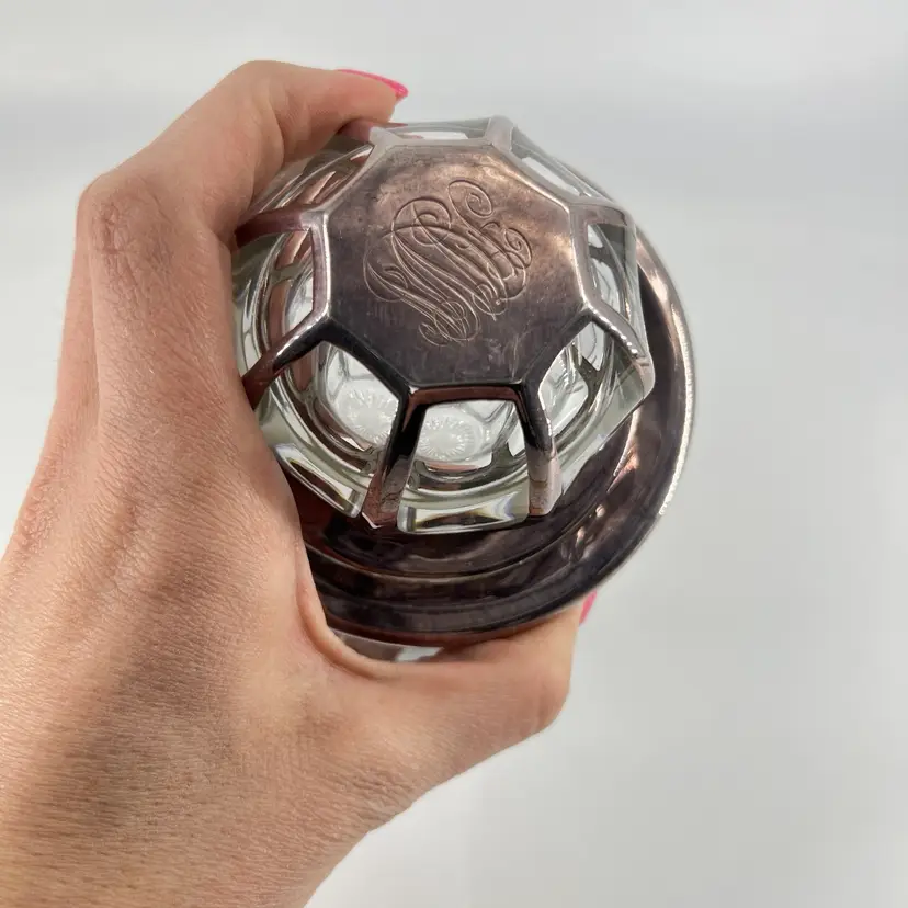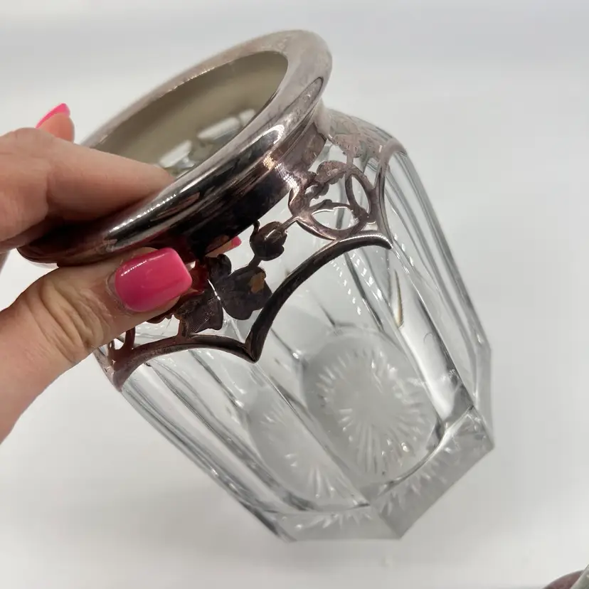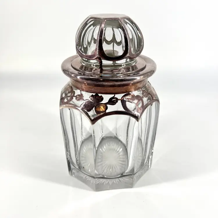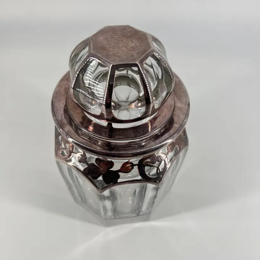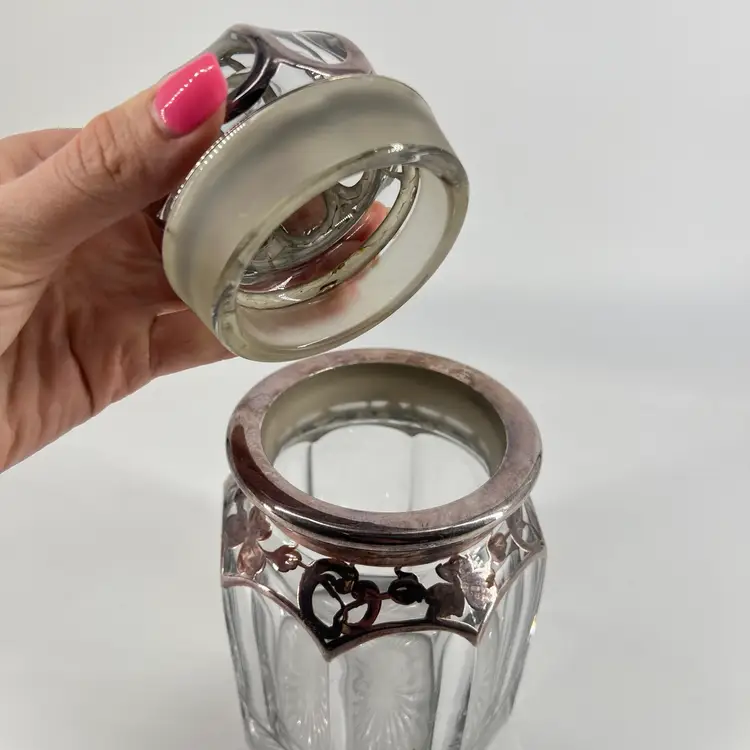 This glass jar may have originally been a humidor. It is made of clear glass with heavy silver overlay that is tarnished. There is a monogram on the top and leaf designs. It measures approx 7.25” tall and 4” wide.