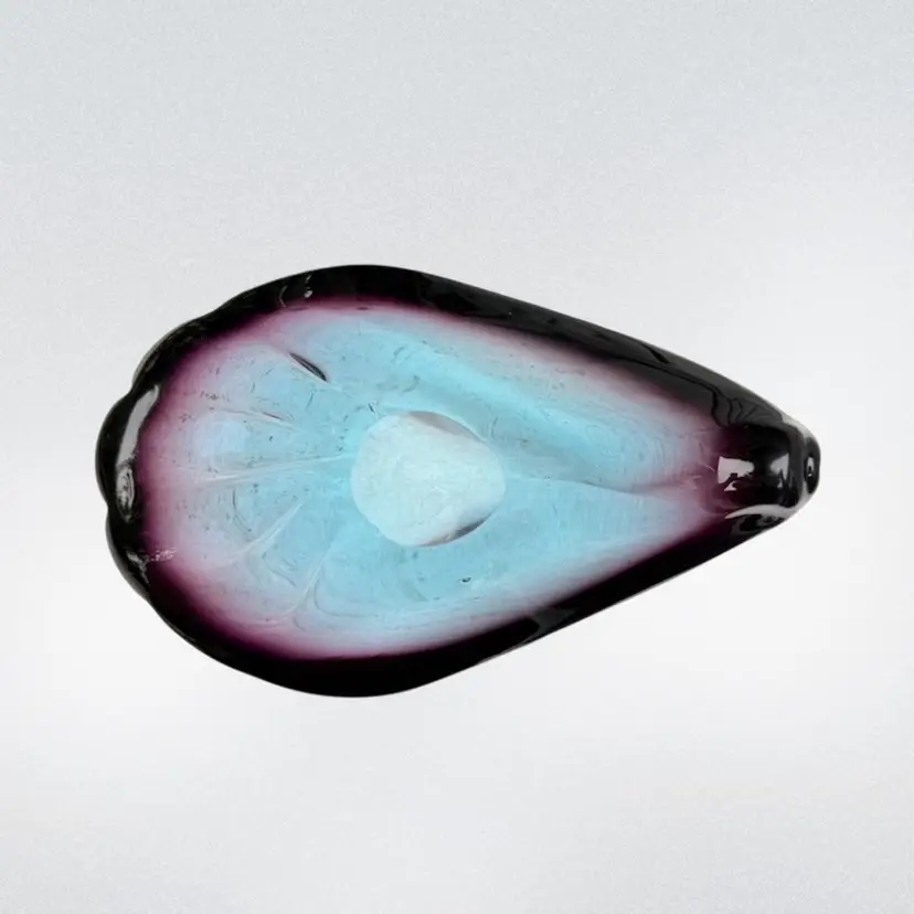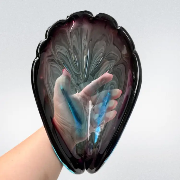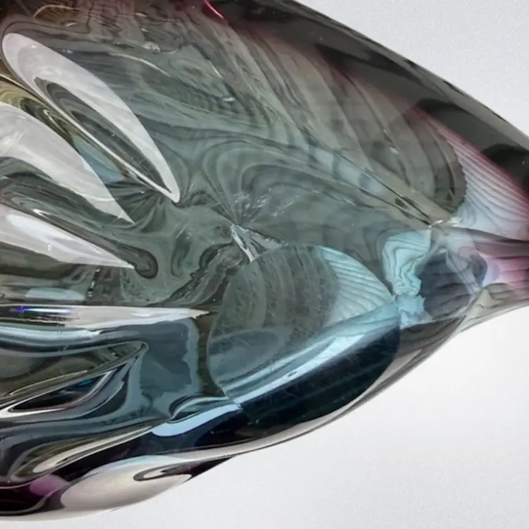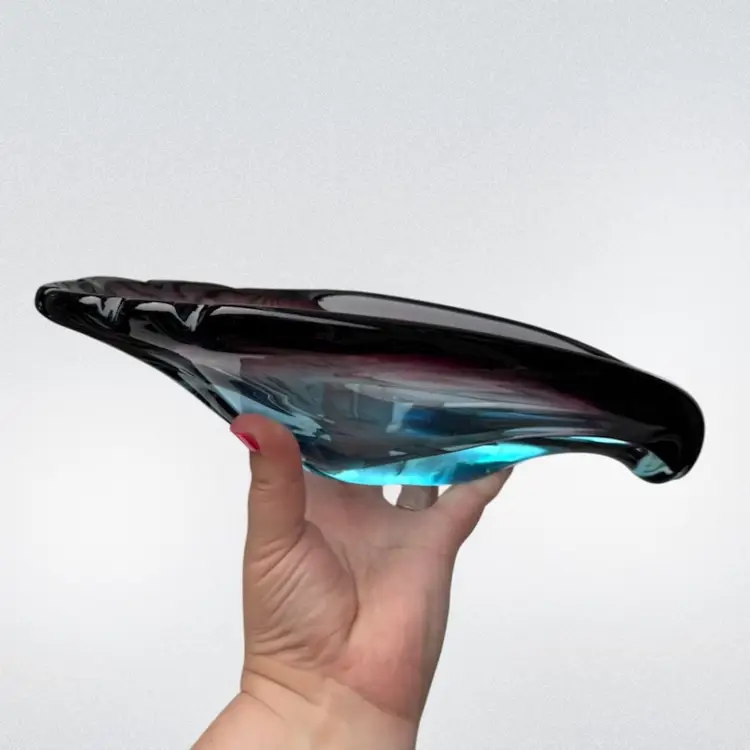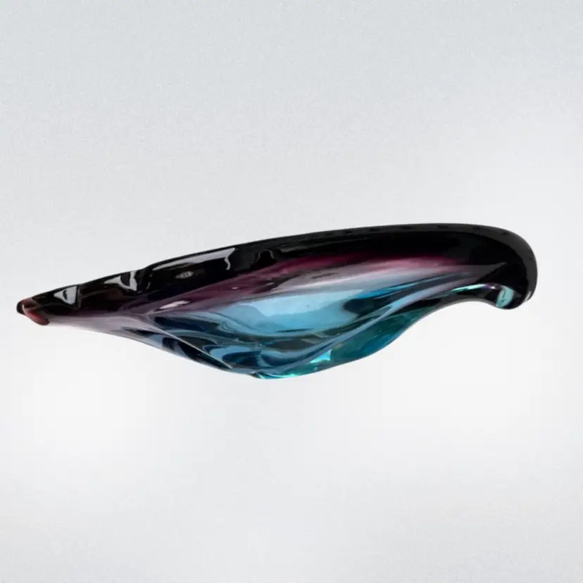 A beautiful, heavy piece of glass with beautiful amethyst and light blue coloring. It is 10 in long and about 3in at its tallest. There are no chips but one air bubble from the making process and there is some scratching on the base.