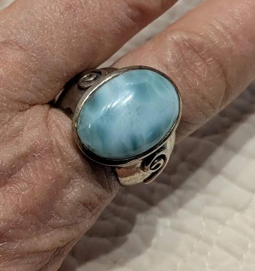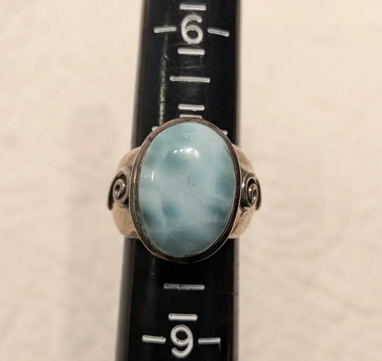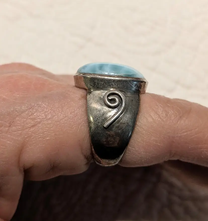 Heavyweight sterling silver with a swirl design on each side of the stone. The front face of the stone is 3/4". Unmarked but acid tests as positive for sterling.