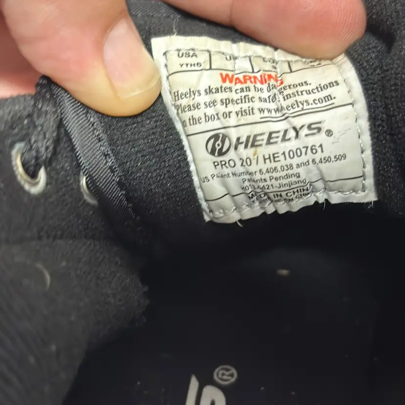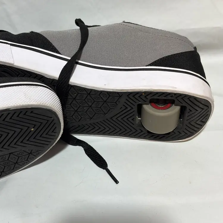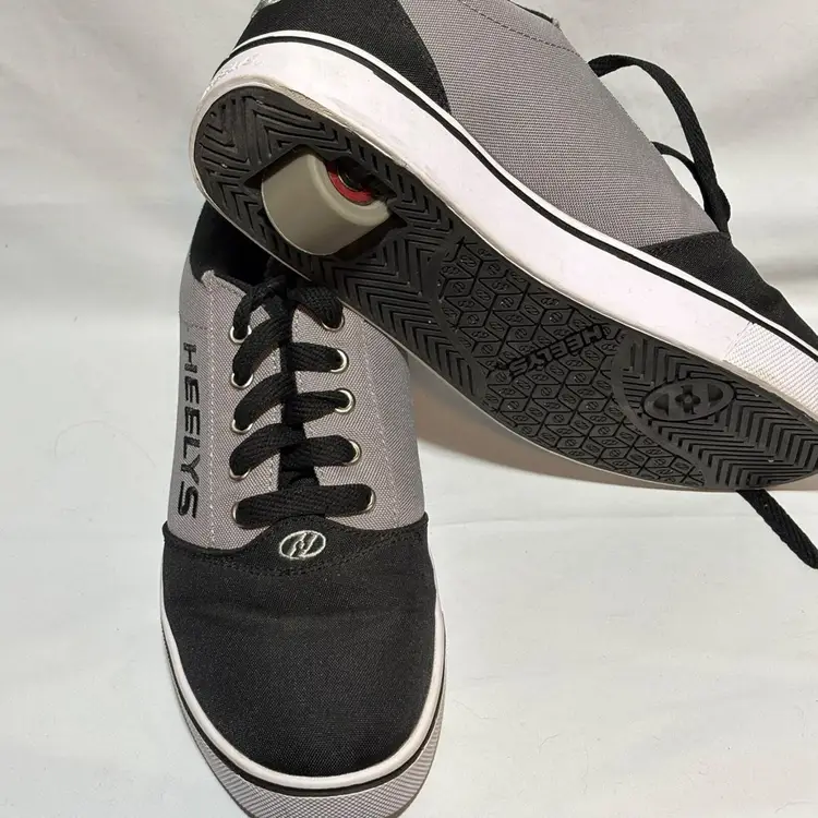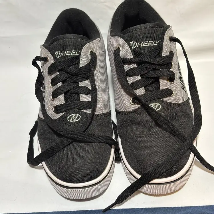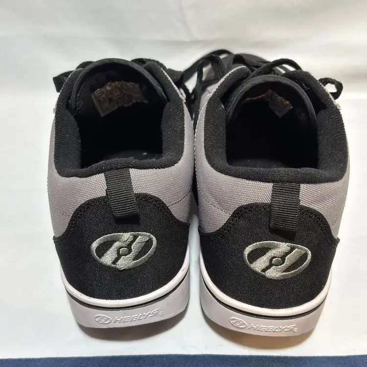 Heelys Pro 20 model roller shoes, style HE100761. These youth-size 6 sneakers feature a black and gray canvas upper with black laces and the classic Heelys branding on the sides, tongue, and heel. The wheels are built into the soles, allowing for both walking and skating. Perfect for kids who want to roll in style!