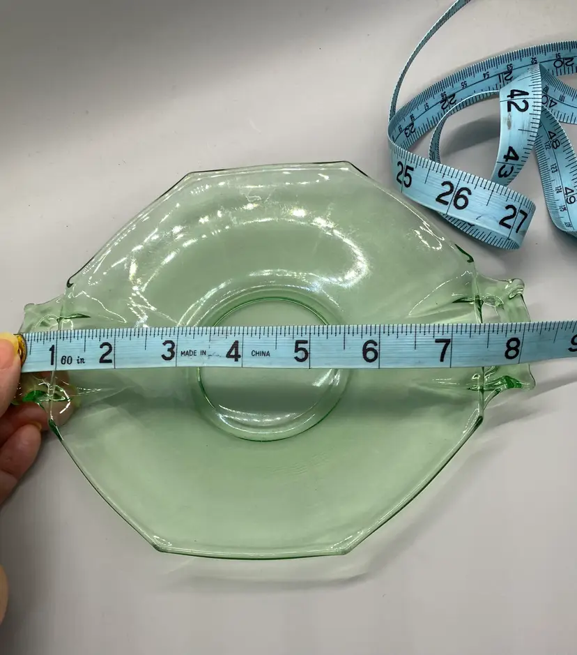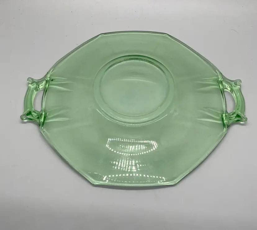 Vintage Heisey serving plate great for tidbits hoerderves green glass Moongleam double handle some noticeable minor wear 8.25" dia. including handles hand wash recommended
