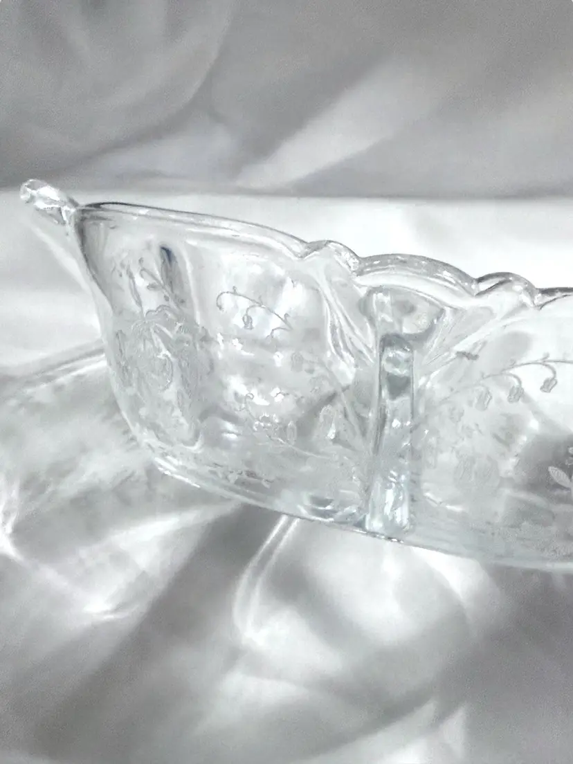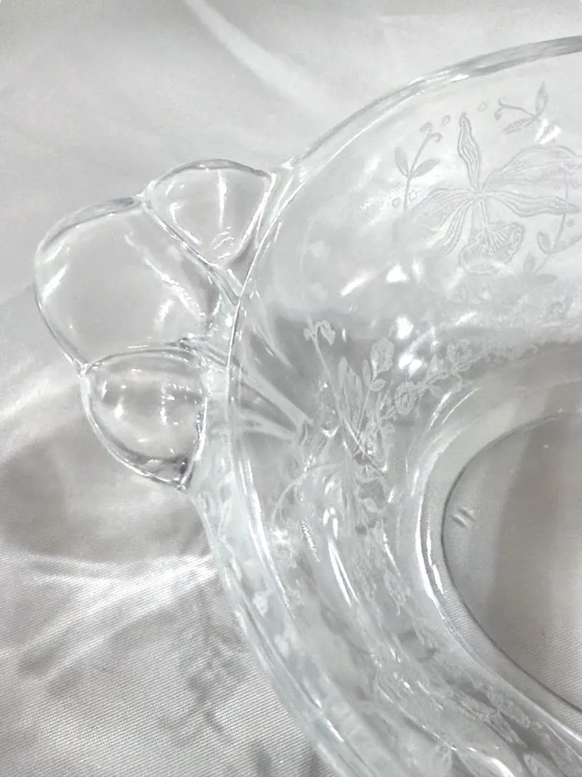 Vintage Heisey Orchid Etch Divided Glass Dish – Elegant Depression Glass SIZE: 8" x 5" x 2.5" FEATURES: Orchid Etched Dish by Heisey Glass Company / divided glass relish dish featuring the Orchid etching patter / Elegant handles and central divide / this dish was produced as a relish dish, jelly dish or candy dish (I'm not sure which) / see photos for more details CONDITION: Great Vintage Condition with no Chips, Cracks, or Scratches, or Break / there is a 'rough' spot on the inner edge of the bottom rim. I do not see any chips, but the area has a slightly rough area / from a non-smoking home #LLC 08250601
