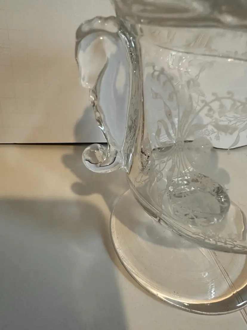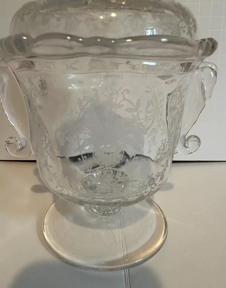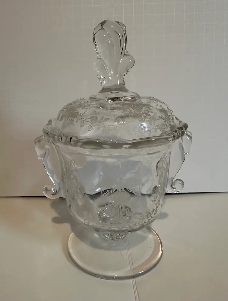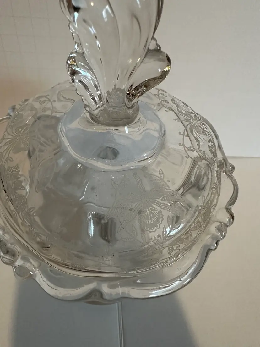 Beautiful Heisey Orchid pattern elegant depression glass covered dish. It is the Waverly mold with seahorse handles. The piece measures 8.5”. Condition is excellent, no chips, cracks or repairs.