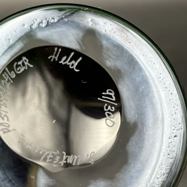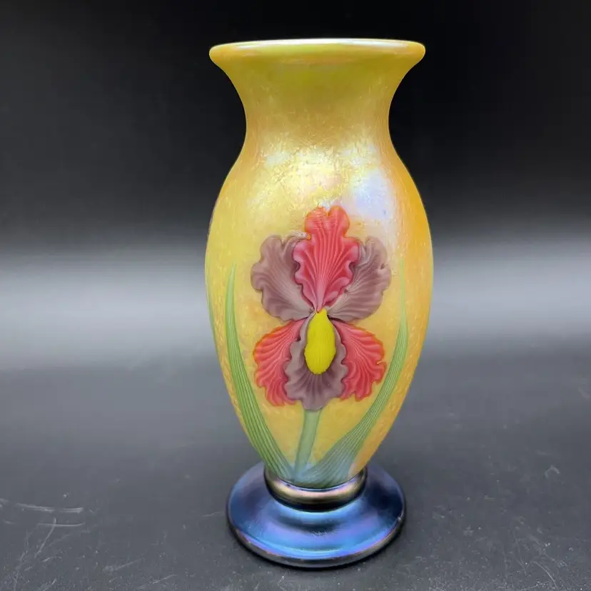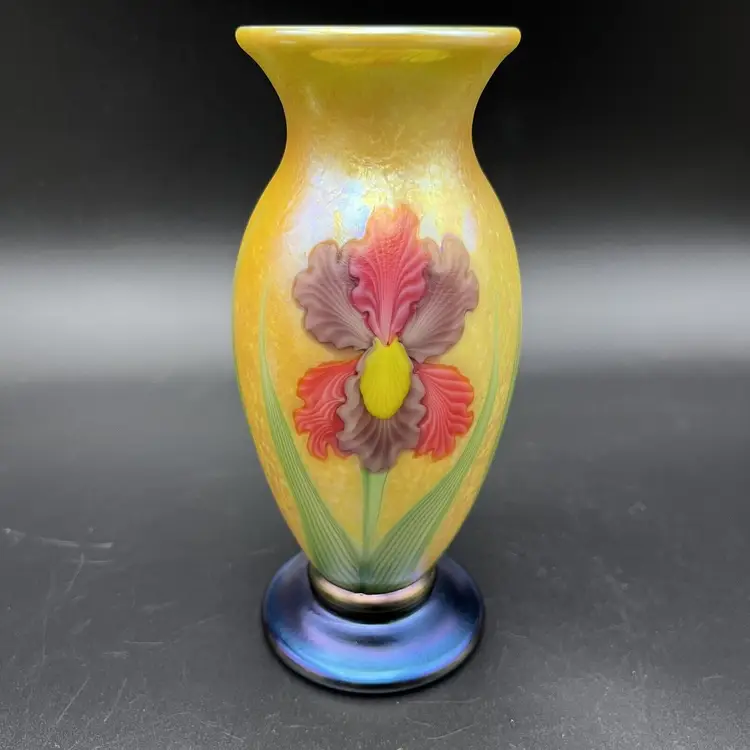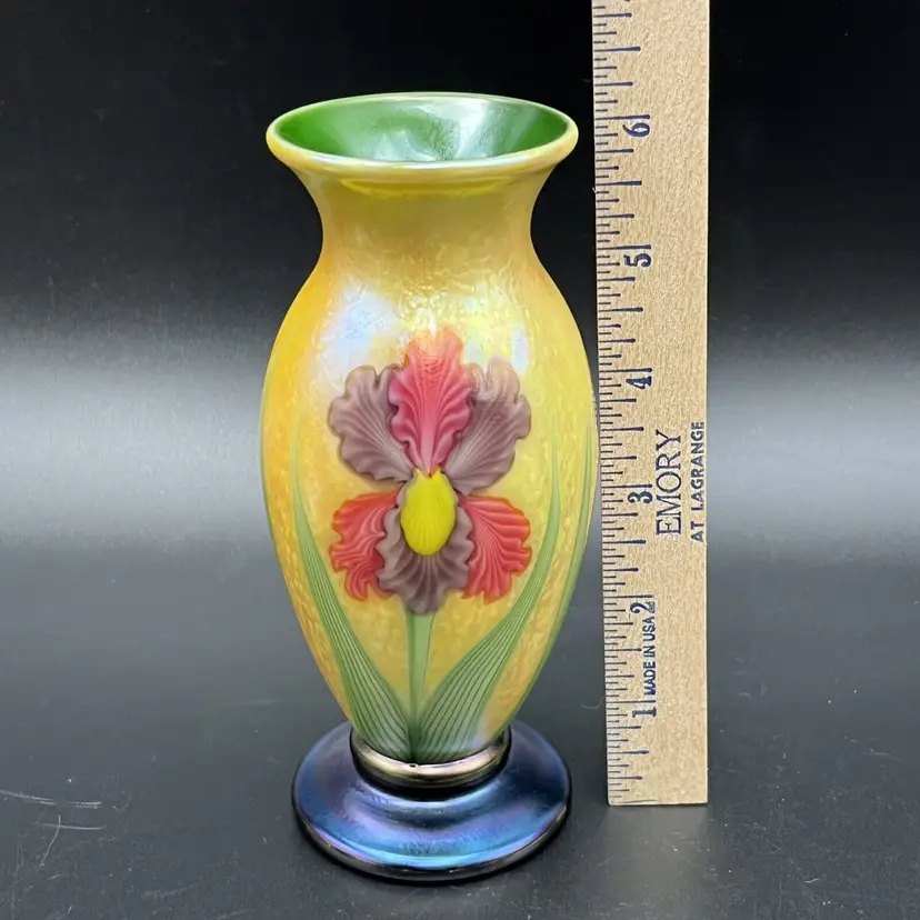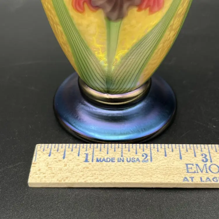 A Stunning Orient & Flume Contemporary Iridescent Studio Art Glass Cabinet Vase Yellow Exterior With A Beautiful And Colorful Iris And With A Green Interior The Base Color Is Blue But The True Color Of The Glass Is Green The Vase Is Signed By The Artist Held It Is 6" Inches Tall In Excellent-Outstanding Condition Please See All Pictures To Verify Description A Wonderful Addition To Any Collection!! I Do Combine Shipping It Will Come To You Double Boxed! Origin: North American Pattern: Iris Signed By: Held Color: Multicolor Material: Glass Subject: Floral Brand: Orient & Flume Type: Vase Original/Licensed Reproduction: Original Item Height: 6" Theme: Studio Production Style: Art Glass Production Technique: Hand Blown Glass Finish: Iridescent Handmade: Yes Item Width: 2.25" Item Weight: 1lb 1oz