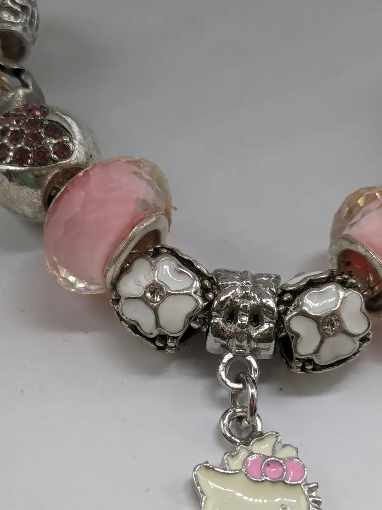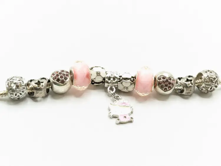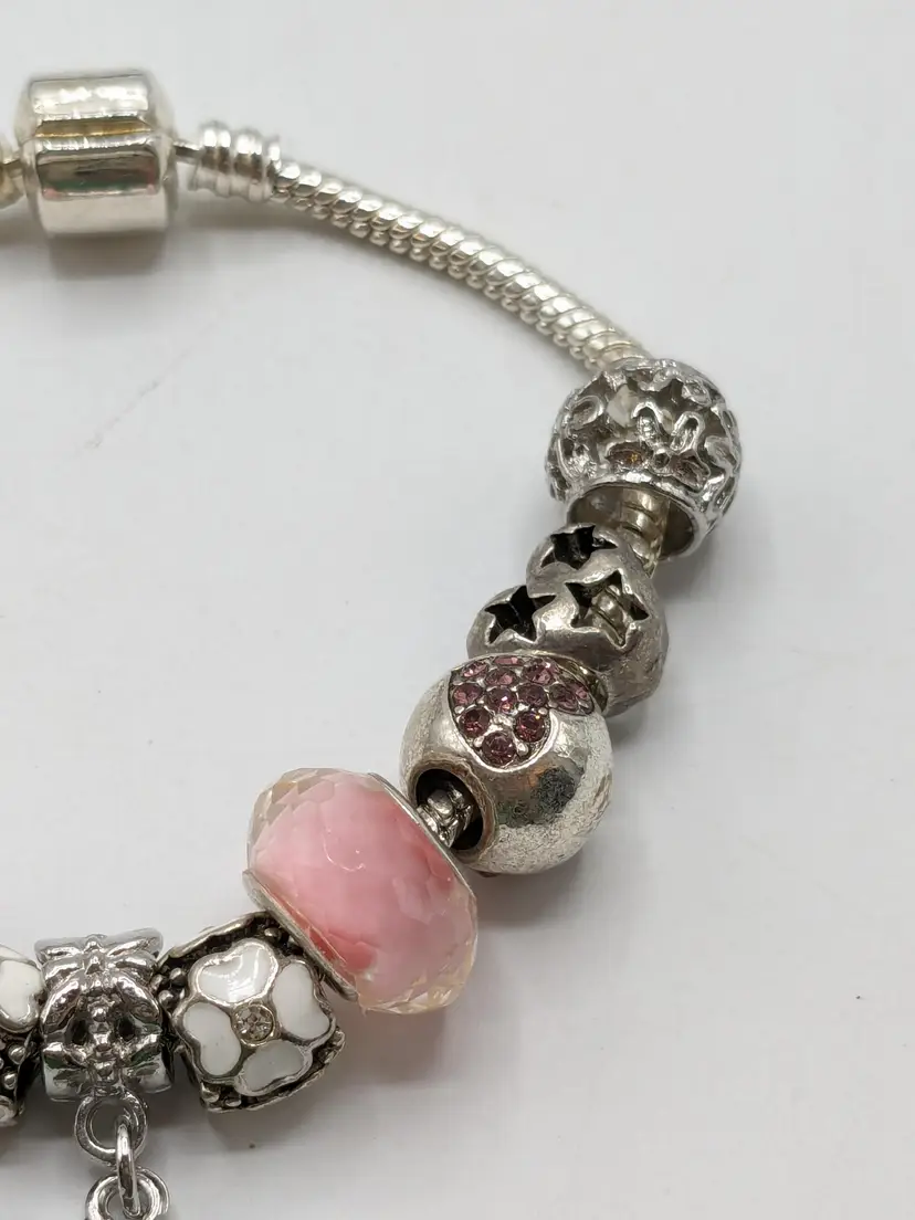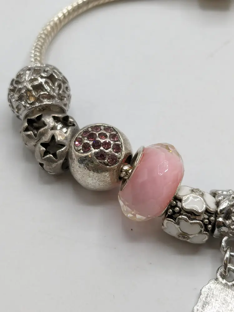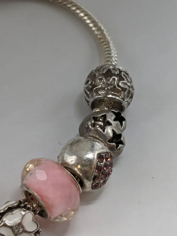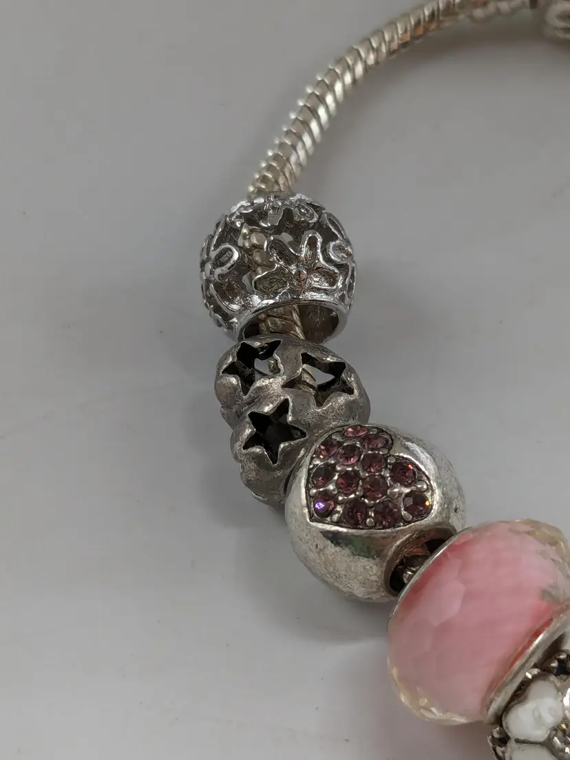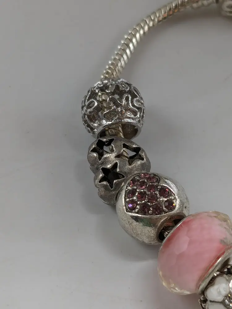 Good condition. Total of 11 charms. Colors are pink, white and silver. Measures 7".