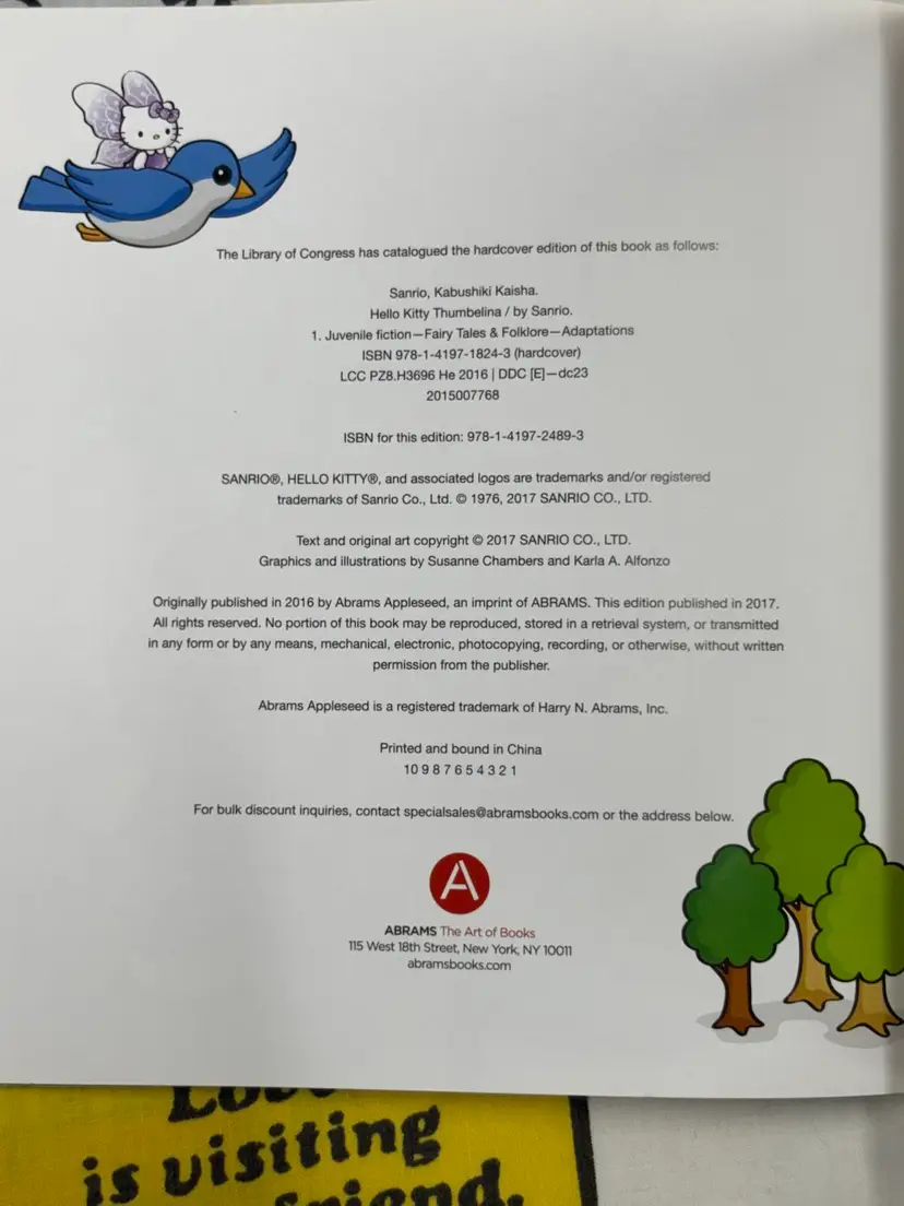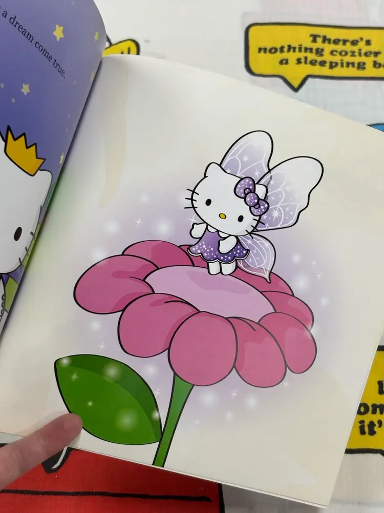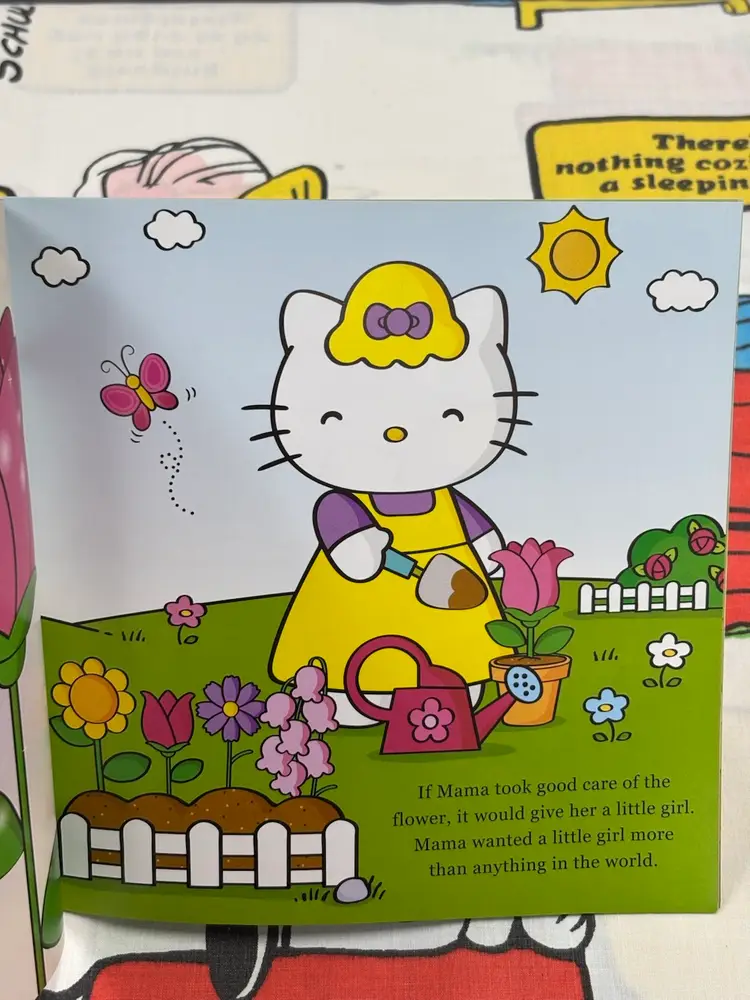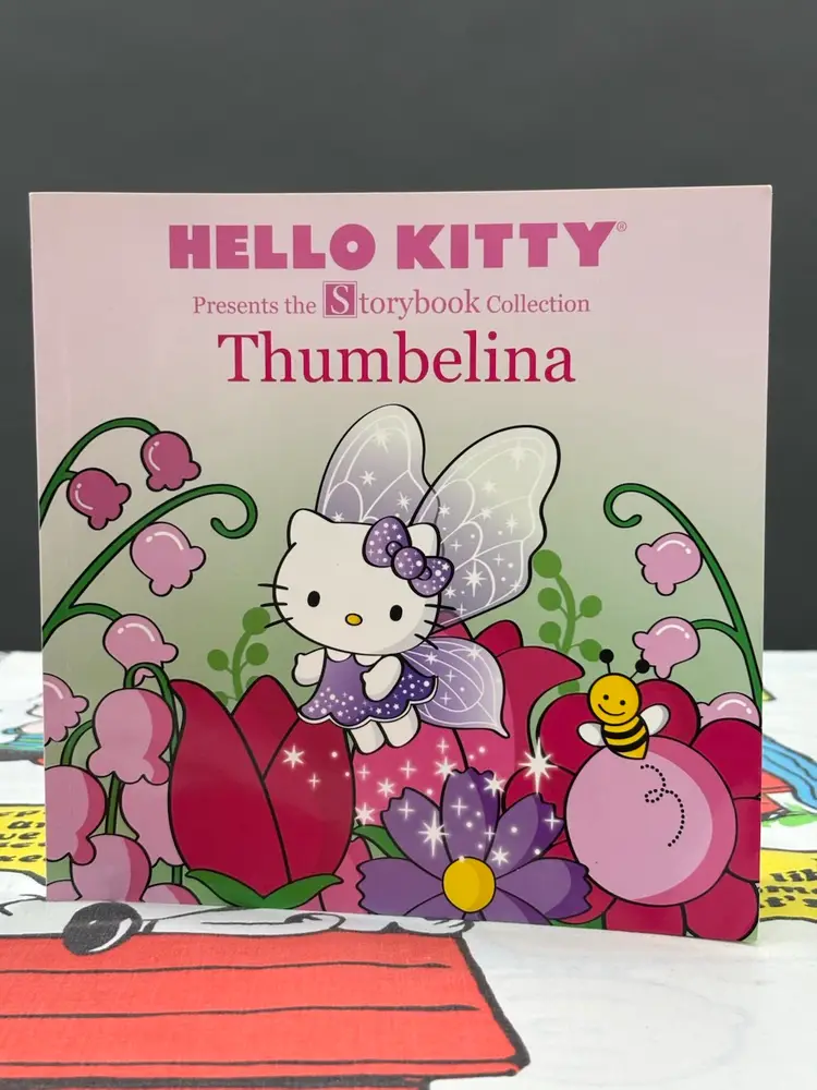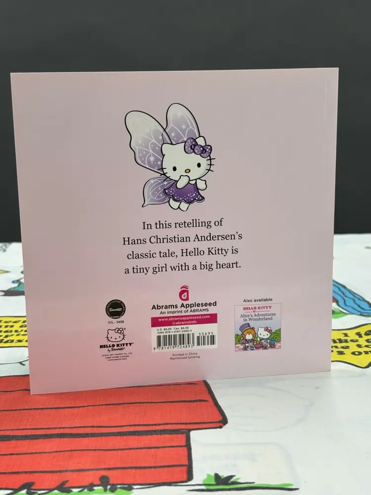 Hello Kitty as Thumbelina, published in 2017 by Abrams Appleseed. Nice softcover picture book. Has a stain(?) on the page with Hello Kitty flying above the flower as seen in the photos. Otherwise this book is in very good condition.