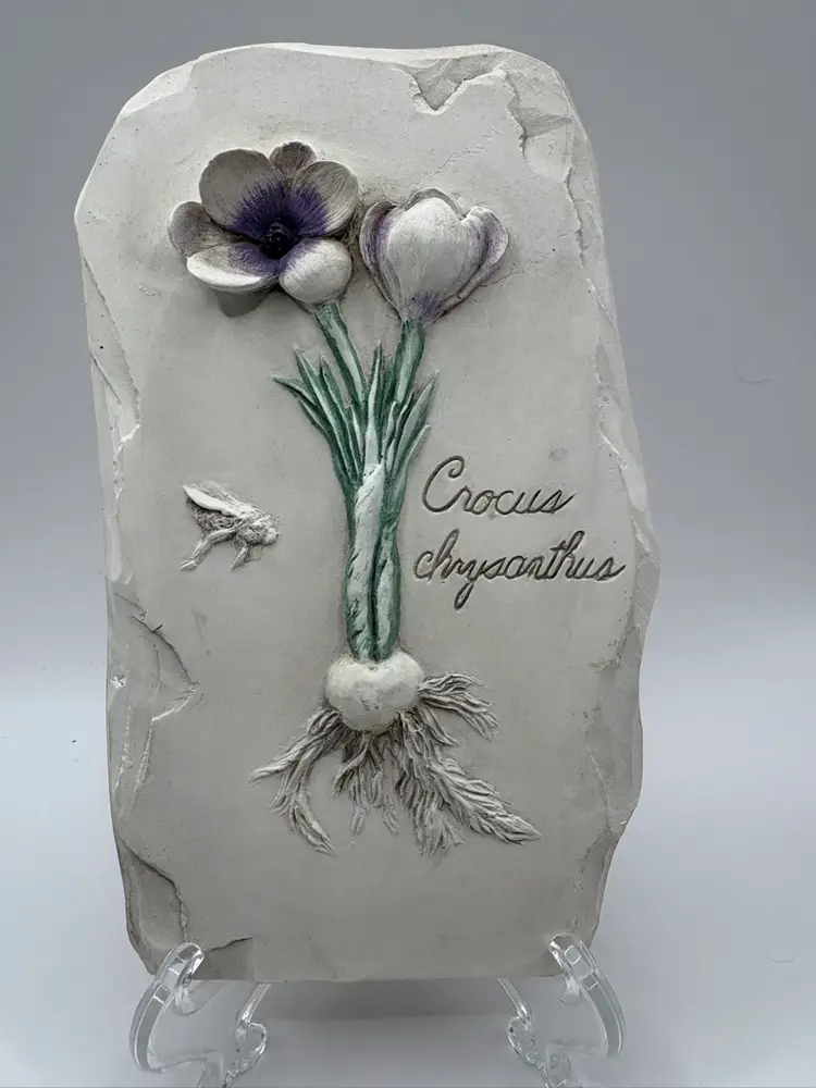 Hen Feathers Crocus Christy’s Walk Hanging 3D relief Measures 4 1/4 inches wide by 7 1/2 inches tall No chips or cracks Note metal hanger is bit rusty