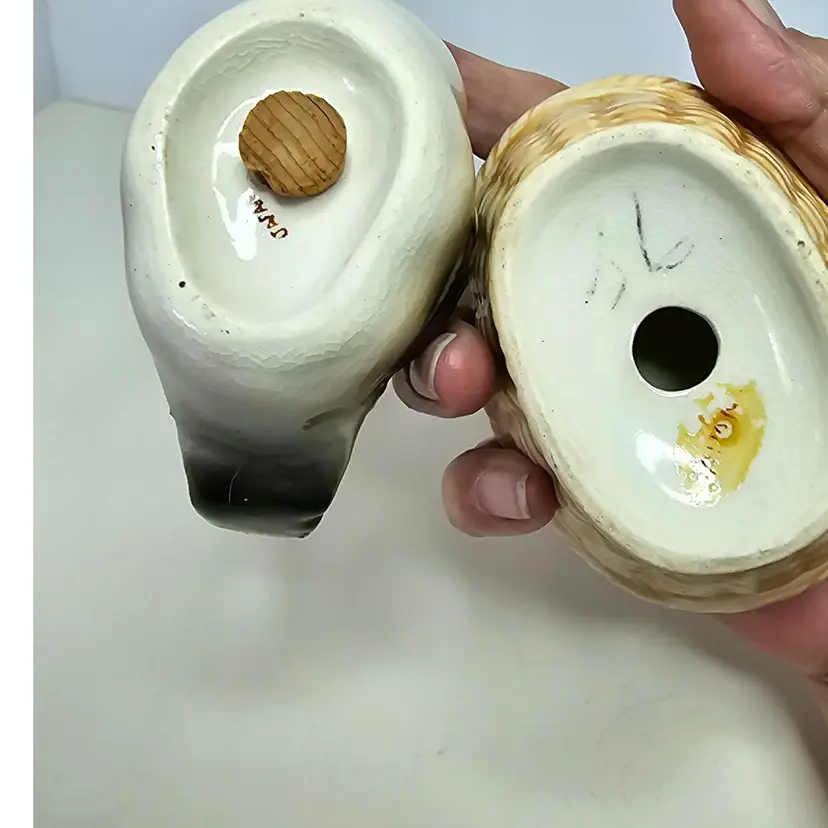Vintage hen on a nest Shaker set. The hen is one Shaker, and the nest is the other. They are marked Japan, and the stoppers are there, but the nest Shaker the cork has been pushed in. There are no chips or cracks. The paint is worn on the hen's comb and crazing on both shakers. They measure 4.5" tall x 4" wide.