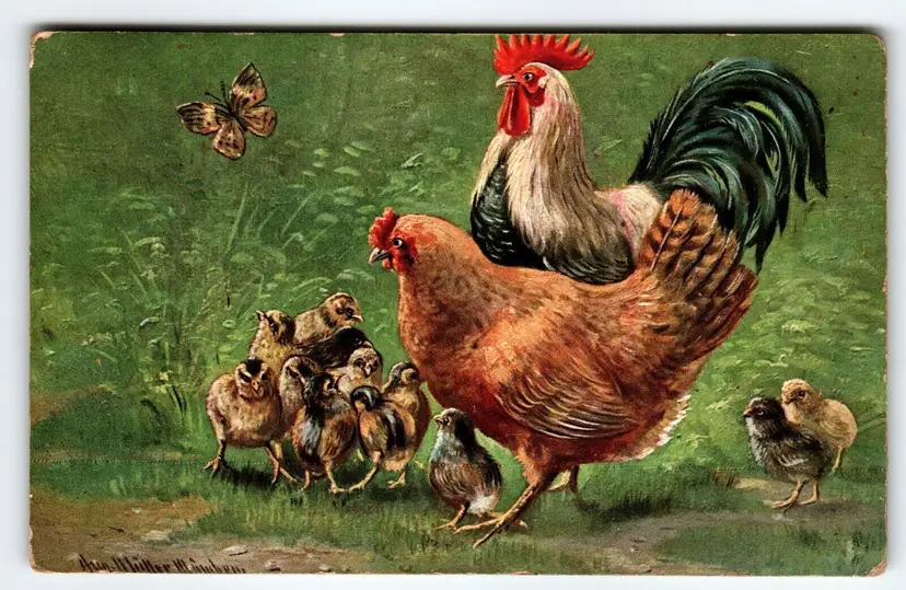 Number of Items in Set: 1 Unit of Sale: Single Unit Artist: Muller Signed By: Muller Occasion: Greetings Size: Standard (5.5 x 3.5 in) Signed: Yes Custom Bundle: No Year Manufactured: 1908 Material: Paper Original/Licensed Reprint: Original Franchise: None Brand/Publisher: HKM Subject: Baby Chicks Personalize: No Type: Printed (Lithograph) Era: Divided Back (1907-1915) Theme: Animals, Rustic, Wildlife Features: Divided Back Time Period Manufactured: 1900-1919 Country/Region of Manufacture: Germany Postage Condition: Posted