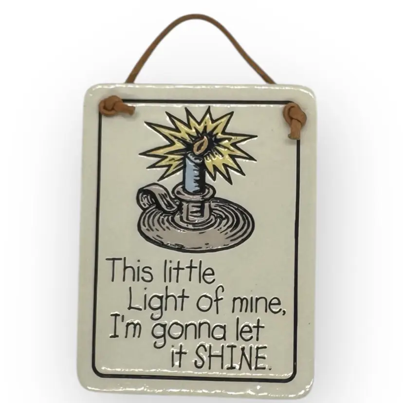 This Little Light of Mine mini ceramic wall hanging will help you start each day off right by encouraging you to let it shine! Made by the artisans at Spooner Creek Designs and stamped on the back. Highly glazed, it is 3.25 “ x 2.5” with a leather cord to hang. In perfect mint condition, no chips, cracks or repaired spots. Paint is still vibrant as well.