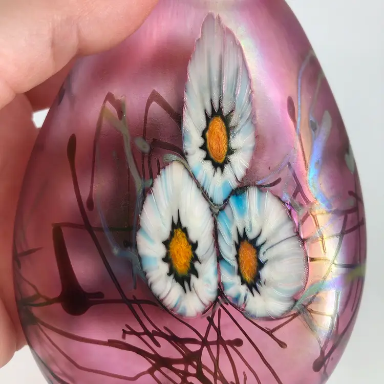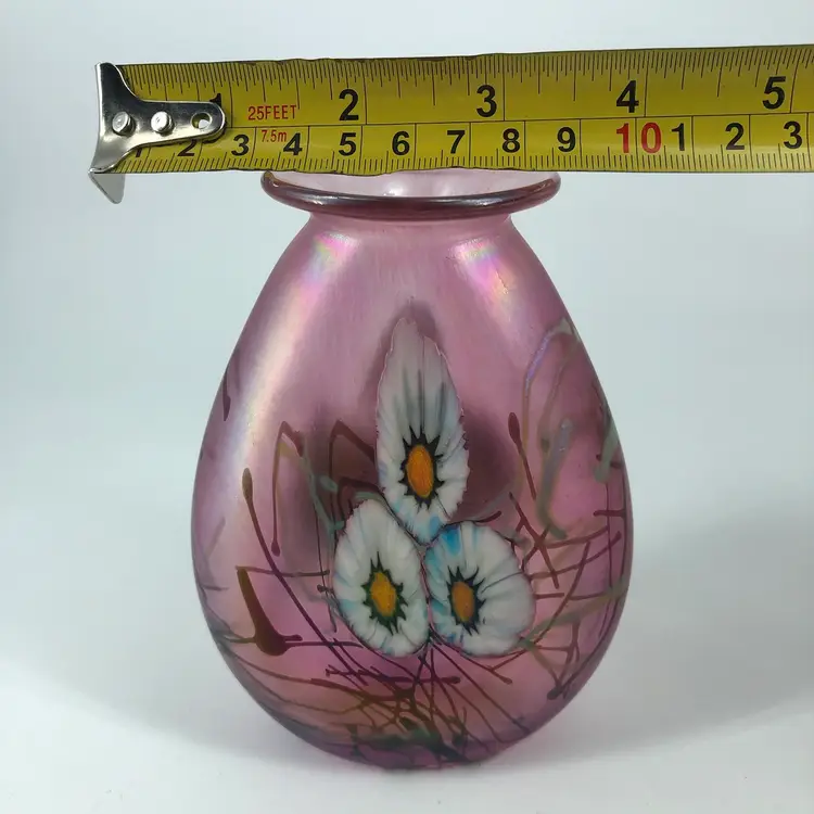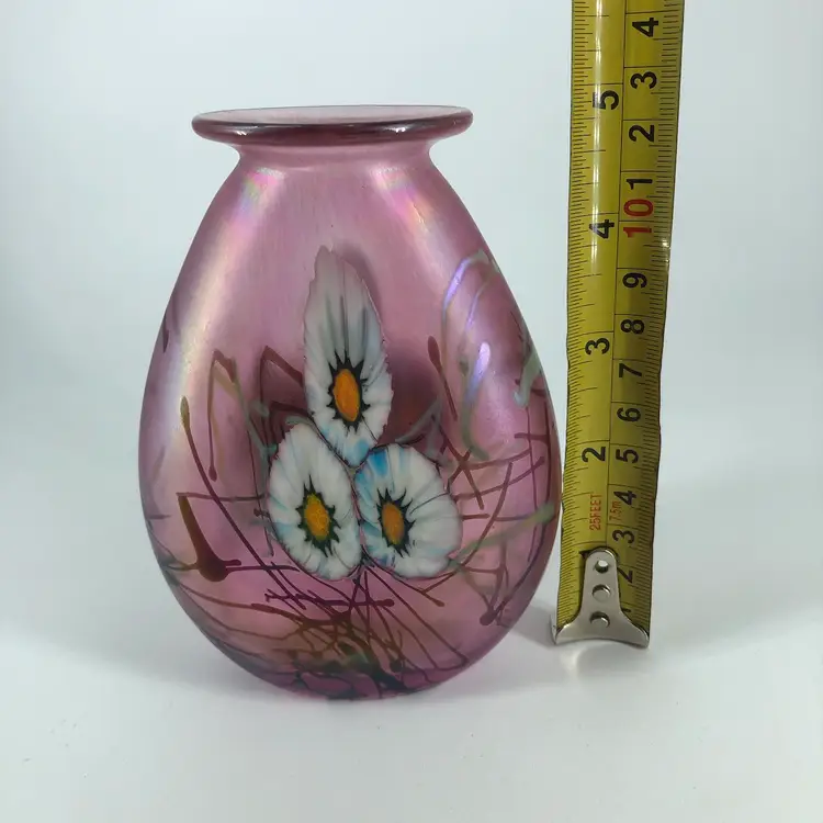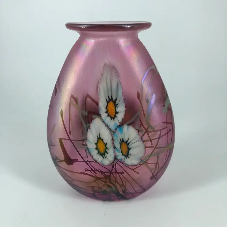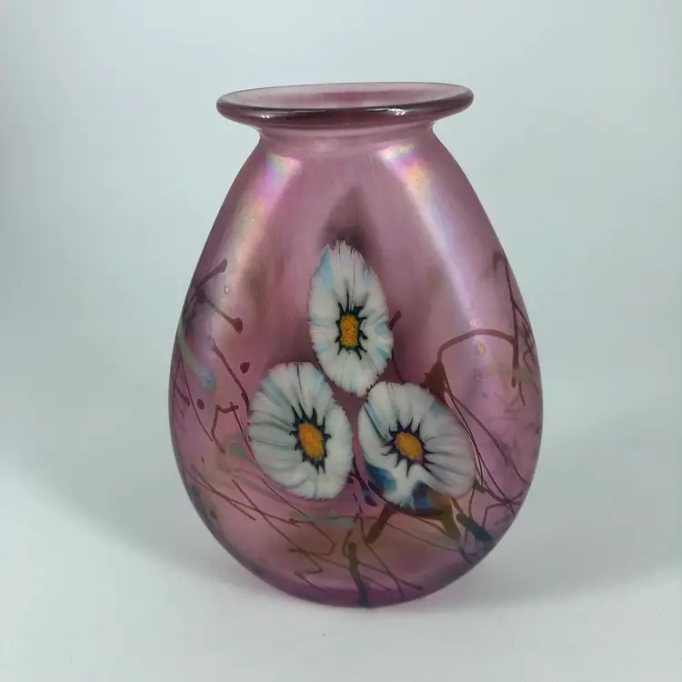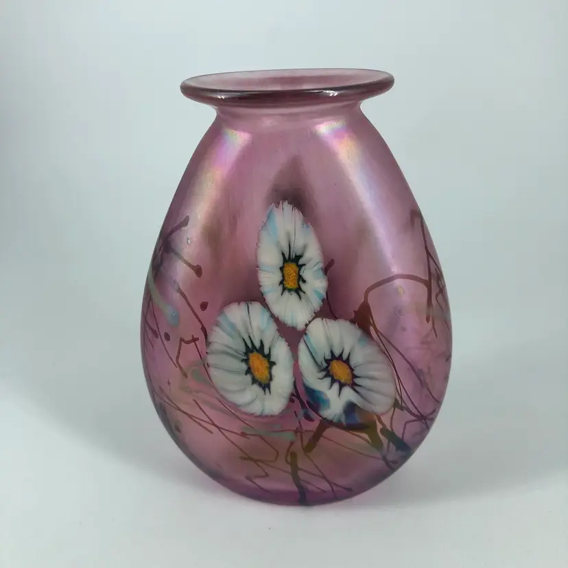 Herb A Thomas HAT Hand-Blown Art Glass Iridescent Daisy Flowers Pink Vase