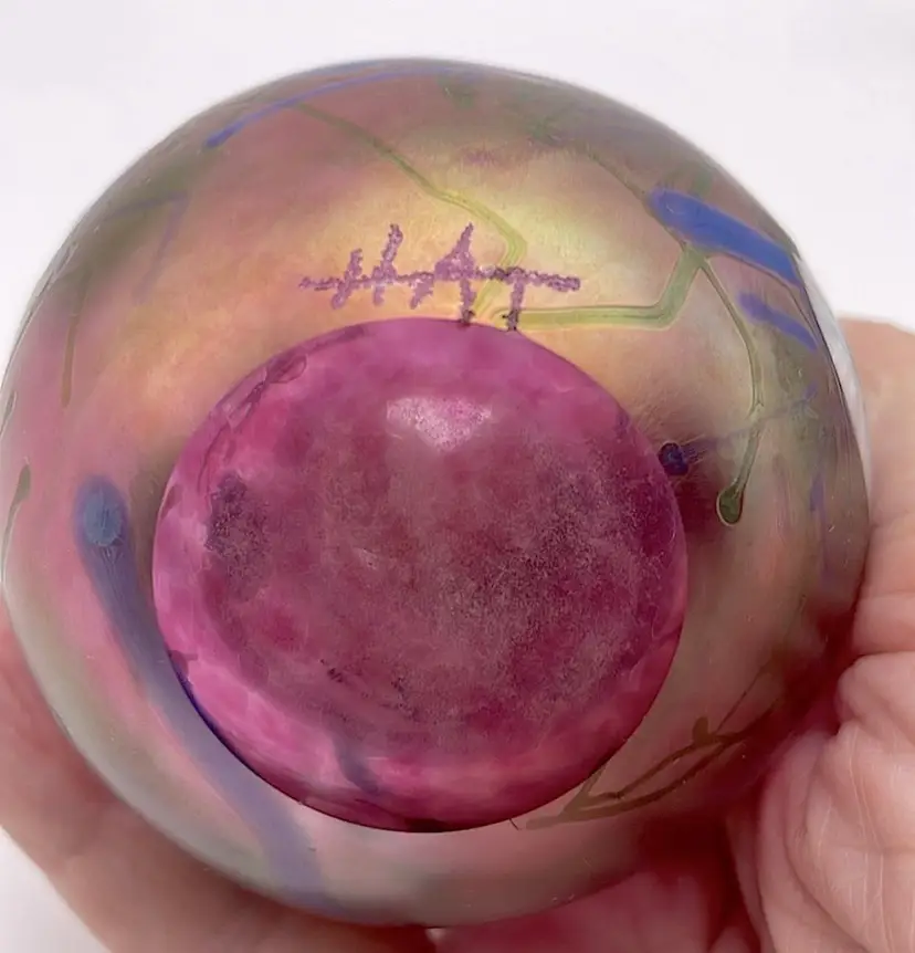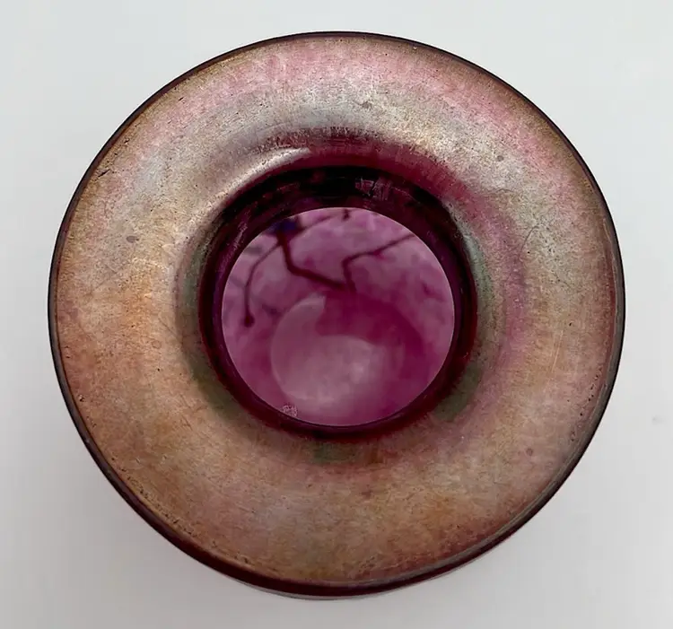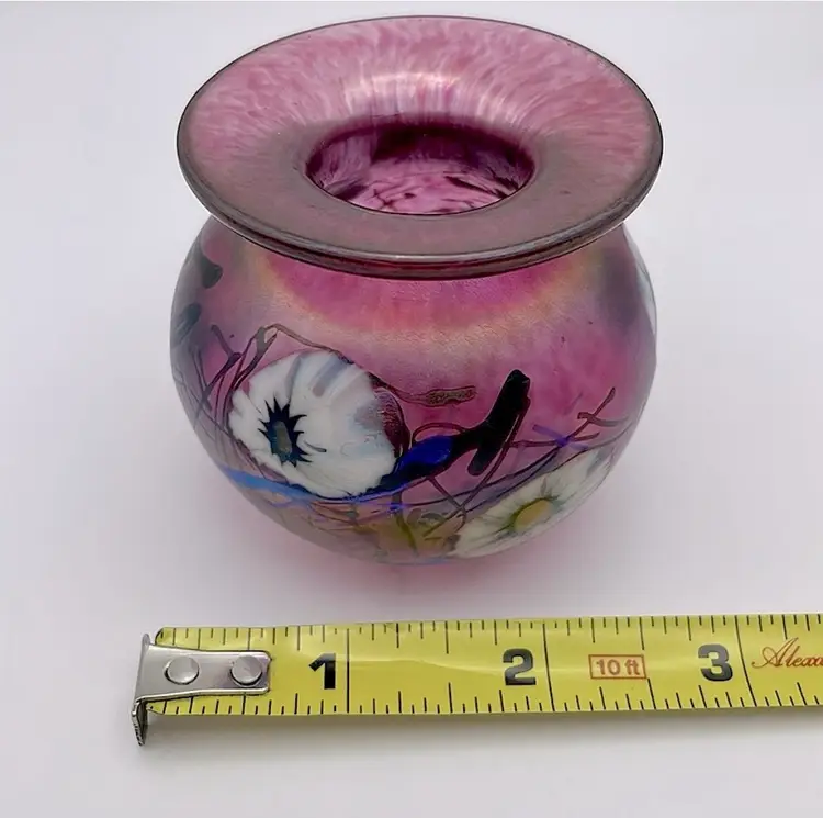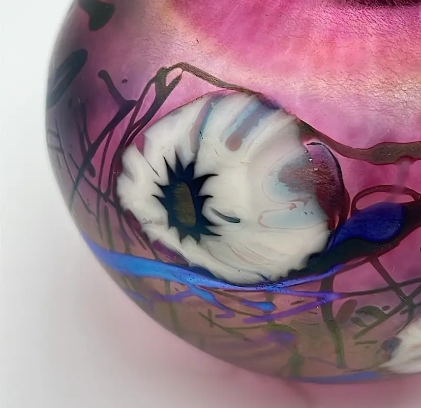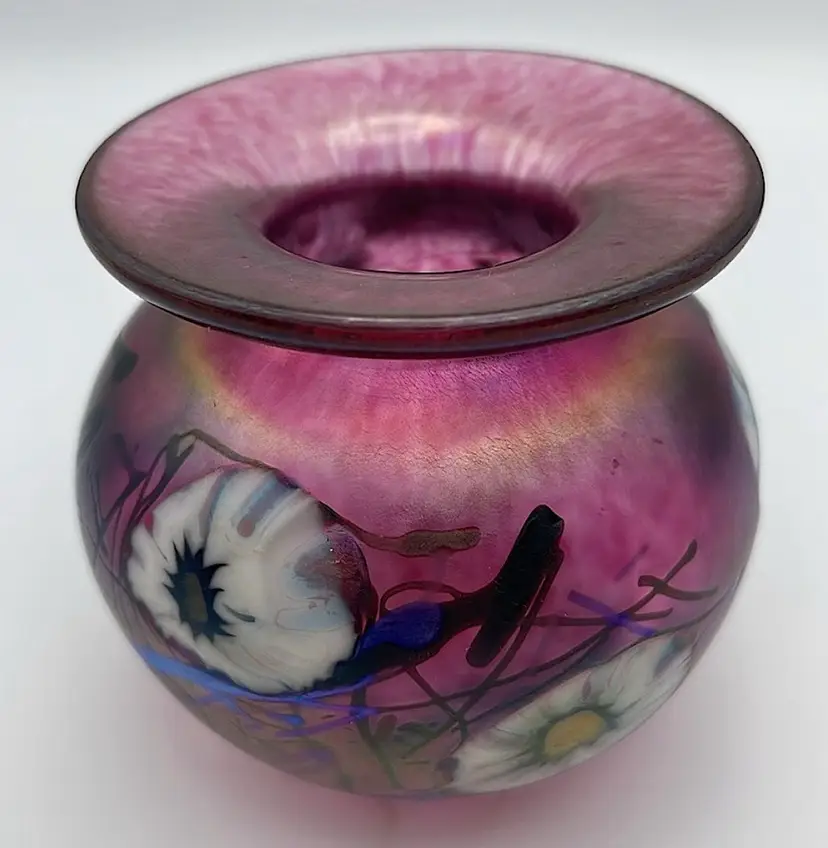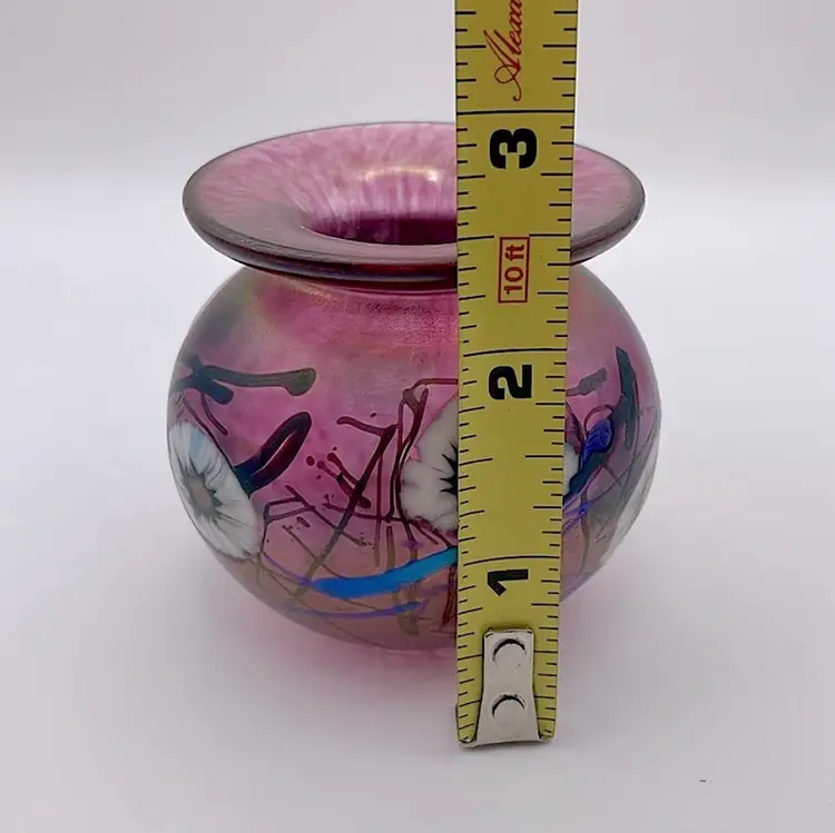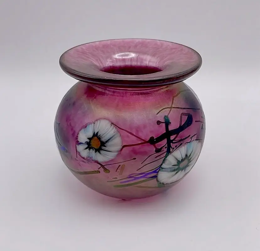 Herb A. Thomas Studio, Handmade Glass Bud Vase, Iridescent Fuchsia w/ Fused Flowers, Polished Bottom, Signed “HAT”