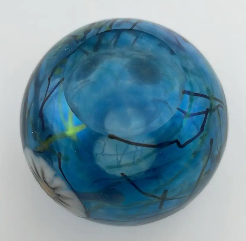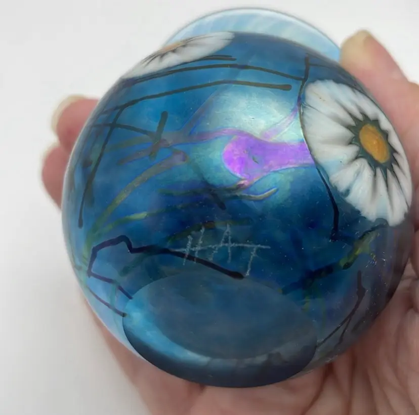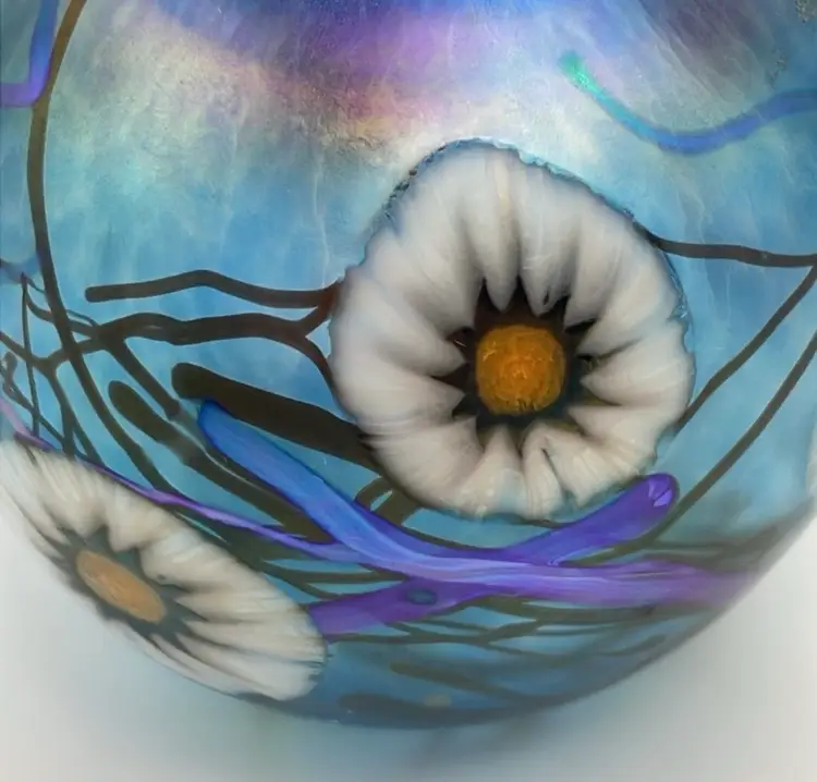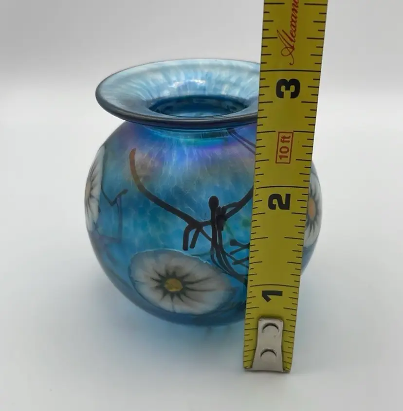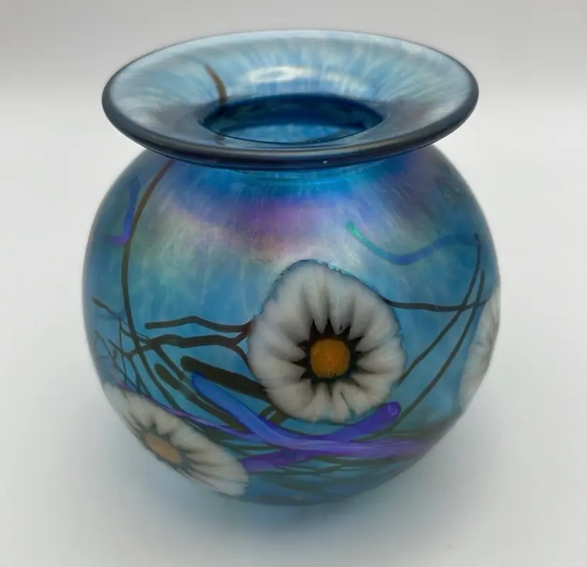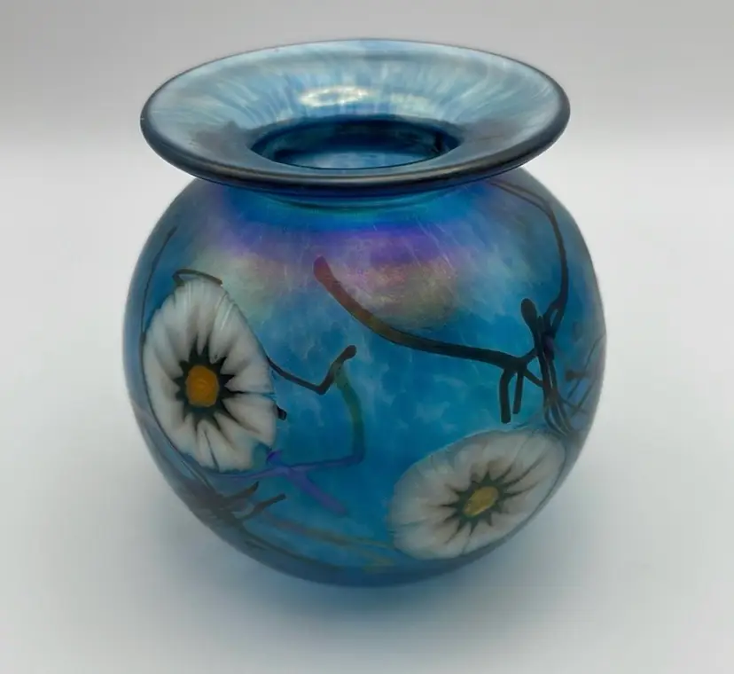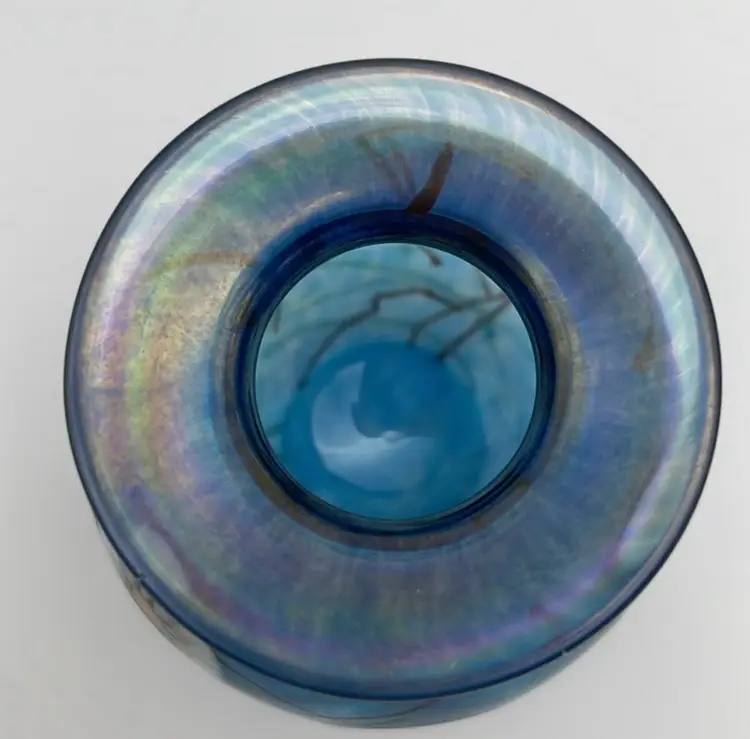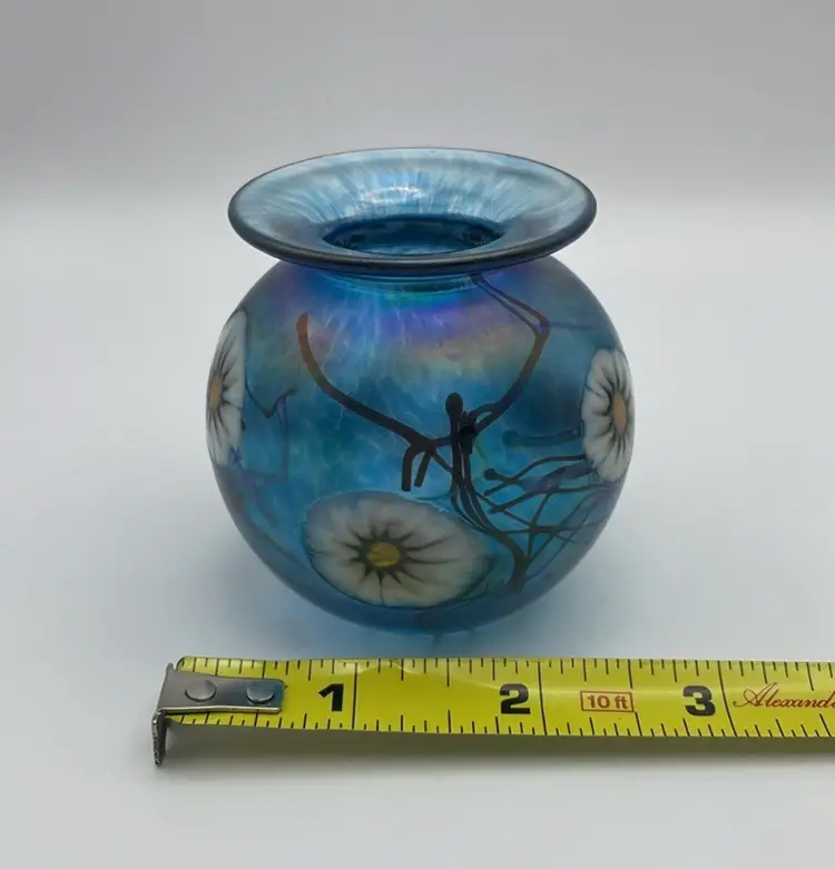 Herb A. Thomas Studio, Handmade Glass Bud Vase, Iridescent Teal Blue w/ Fused Flowers, Polished Bottom, Signed “HAT”
