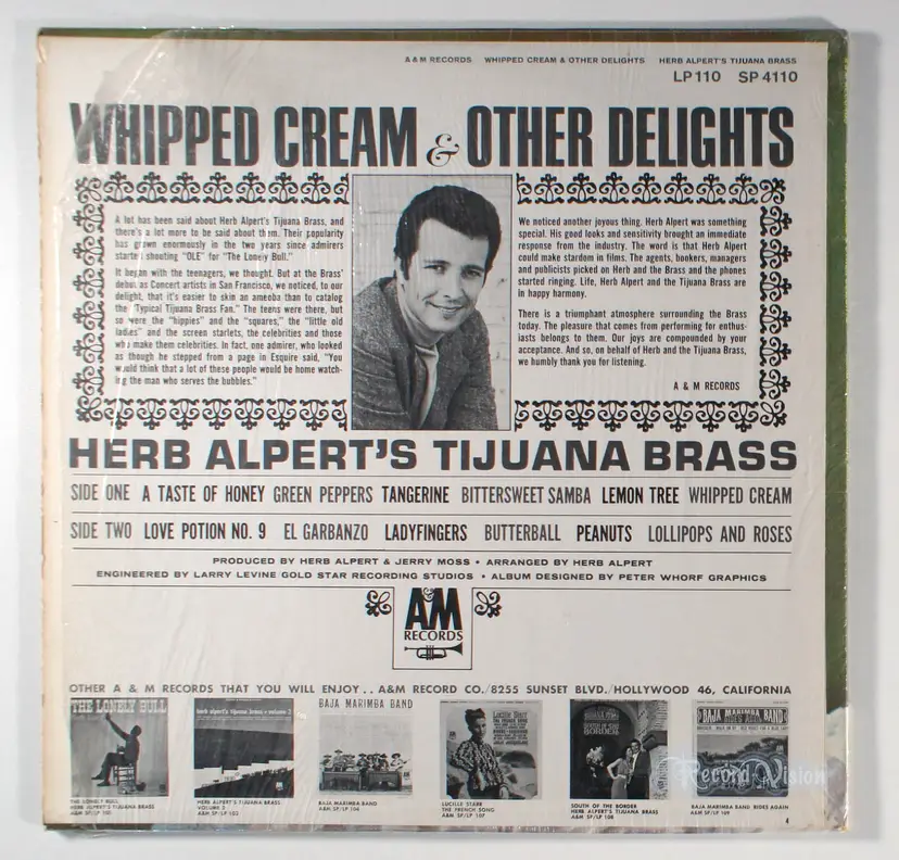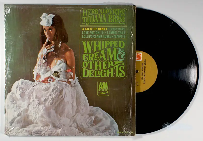 Whipped Cream & Other Delights, by Herb Alpert & the Tijuana Brass, called "Herb Alpert's Tijuana Brass" for this album, is the band's arguably most popular release. This album saw the band nearly abandoning its Mexican-themed music, featuring mostly instrumental arrangements of popular songs, and also generating some major pop hits for the first time since The Lonely Bull. One "tradition" of the early Brass was to include a number rendered in "strip-tease" fashion, and this album's entry for that style was Love Potion No. 9. Whipped Cream & Other Delights sold over 6 million copies in the United States and the album cover alone is considered a classic pop culture icon. It featured model Dolores Erickson wearing chiffon and shaving cream. The picture was taken at a time when Erickson was three months pregnant. The album cover was so popular with Alpert fans that, during concerts, when about to play the song Whipped Cream, Alpert would tell the audience, "Sorry, we can't play the cover for you!" Singles taken from the album included A Taste of Honey, Whipped Cream and Lollipops and Roses. The latter two of these were eventually featured on the ABC-TV series The Dating Game: Whipped Cream as the intro to the bachelorette, and Lollipops and Roses as the theme used when the bachelor(ette) learned about the person chosen for the date.