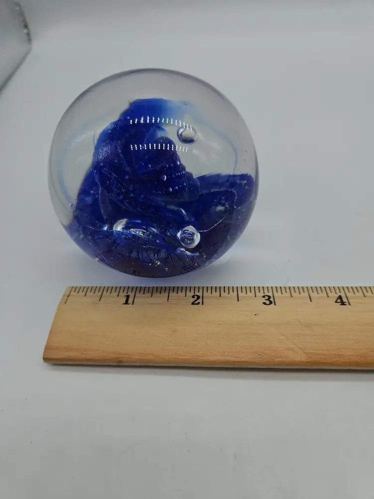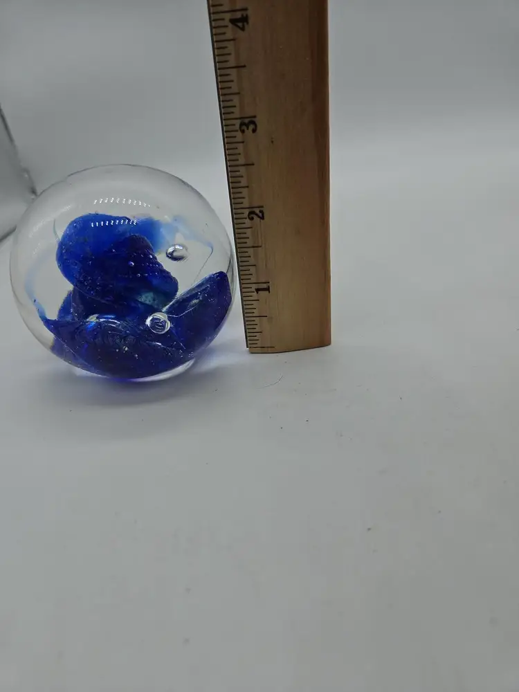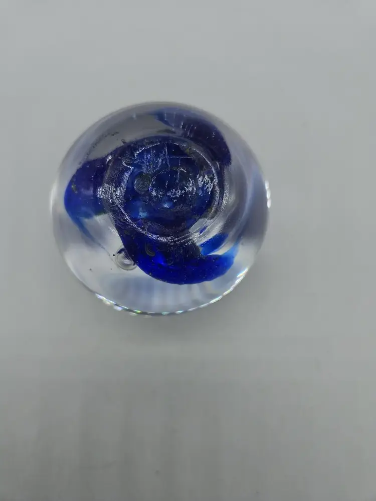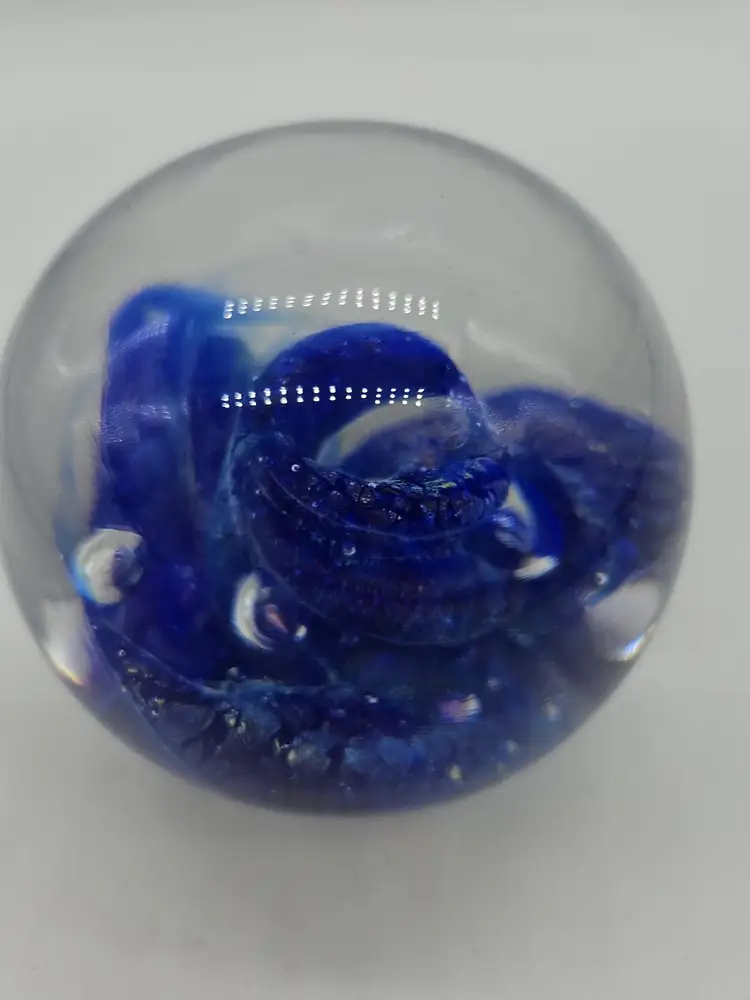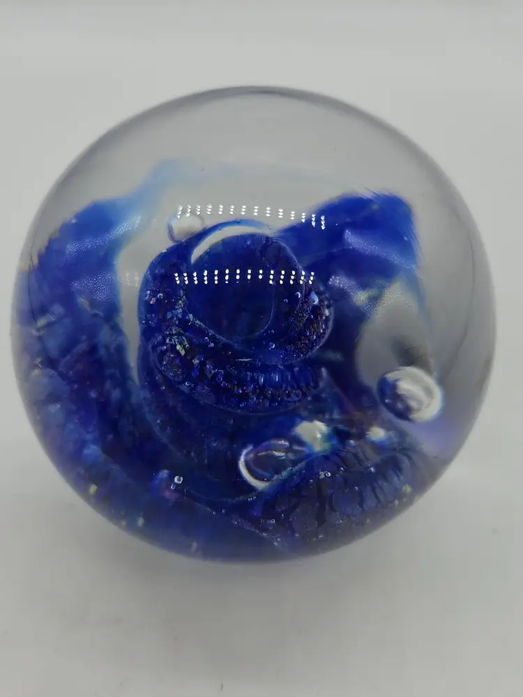 Add a touch of charm to your desk or shelf with this blue art glass paperweight. The intricate design and vibrant blue color make it a standout piece for any collection. Perfect for holding down papers or simply as a decorative item. A unique find for art glass enthusiasts!