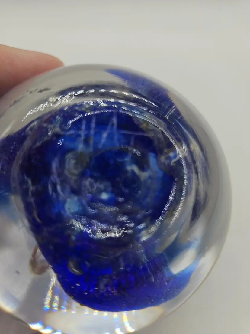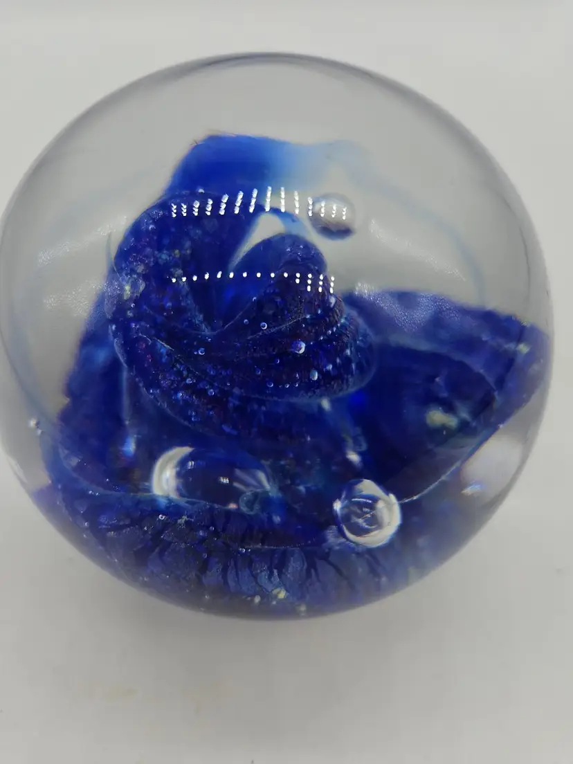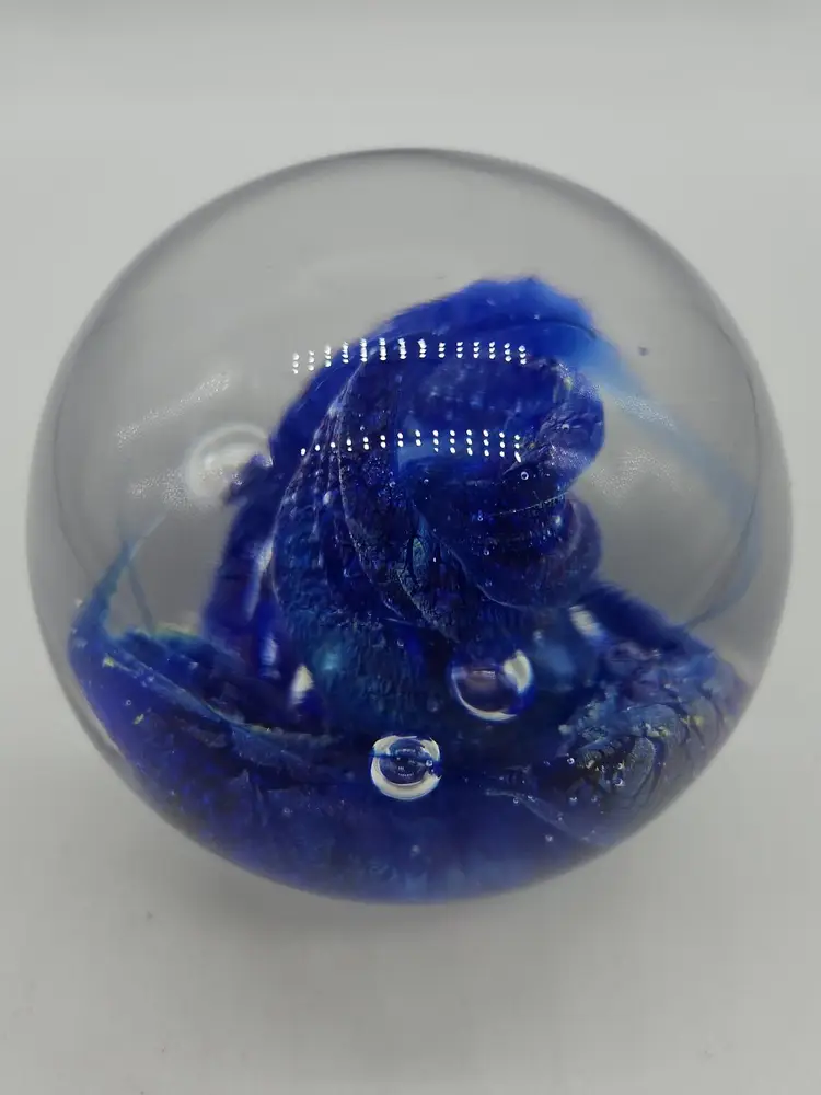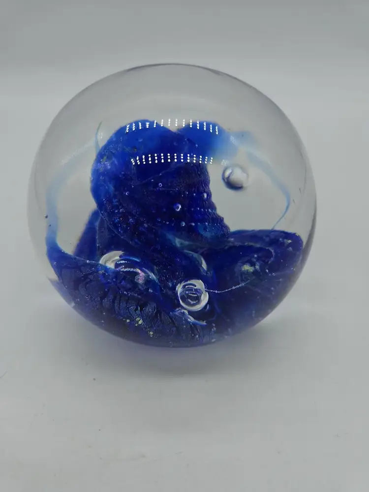 Add a touch of charm to your desk or shelf with this blue art glass paperweight. The intricate design and vibrant blue color make it a standout piece for any collection. Perfect for holding down papers or simply as a decorative item. A unique find for art glass enthusiasts!