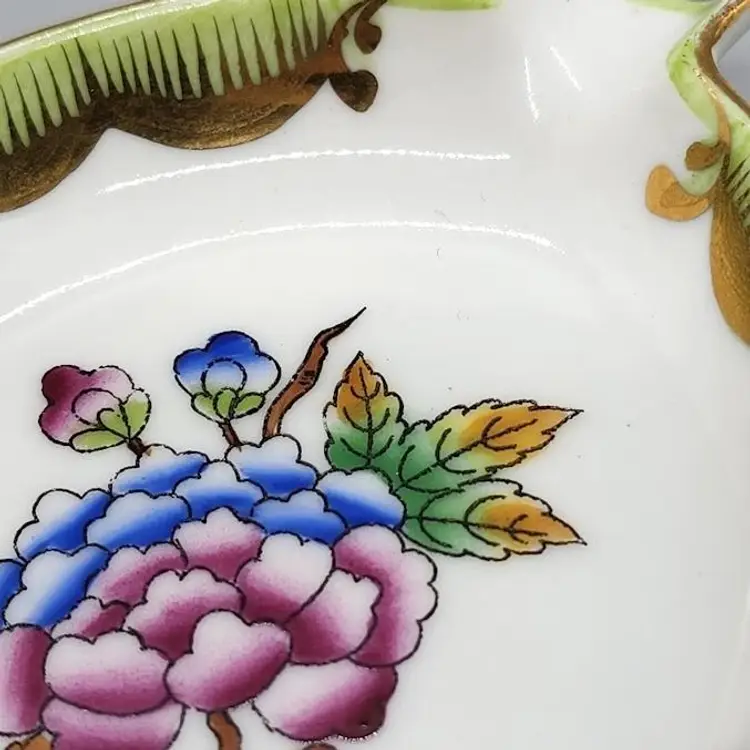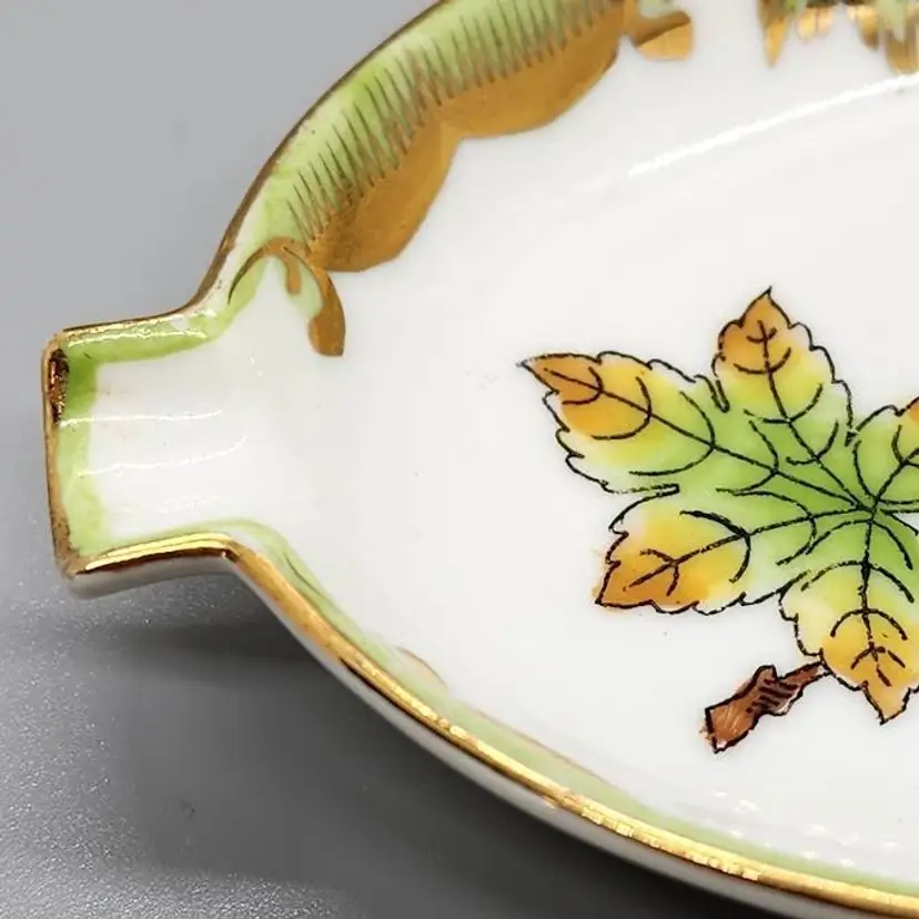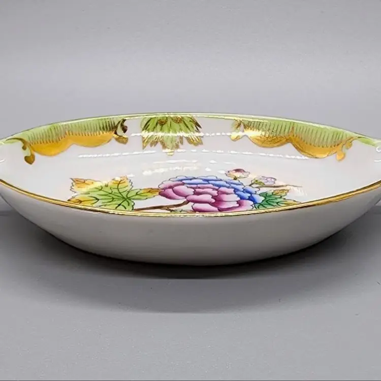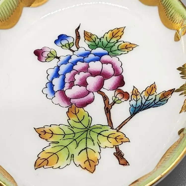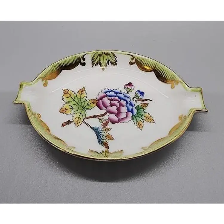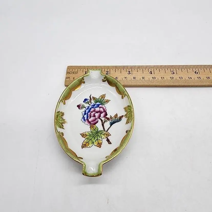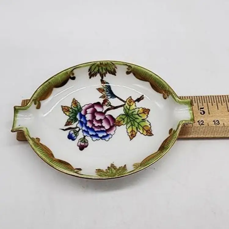 Vintage Herend "Queen Victoria" pattern with green border small porcelain ashtray. Would make a lovely ring or trinket dish. Measures 4 1/2" long x 3" wide x 1/2" tall. No chips, cracks or crazing. Some wayward dots of gold gilt/paint.