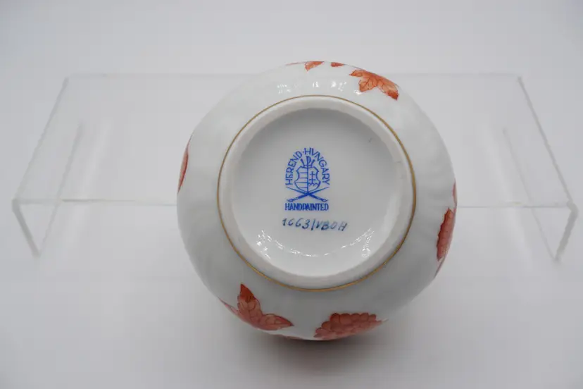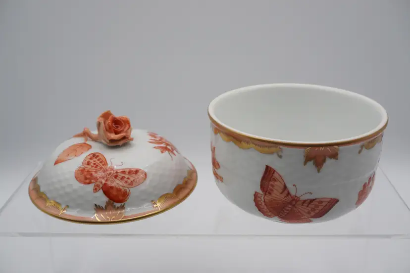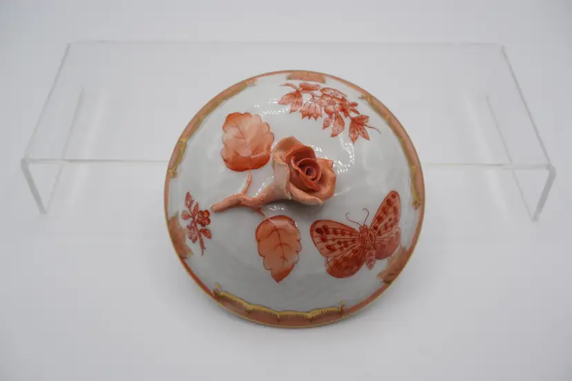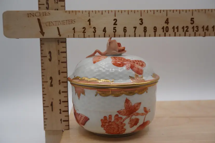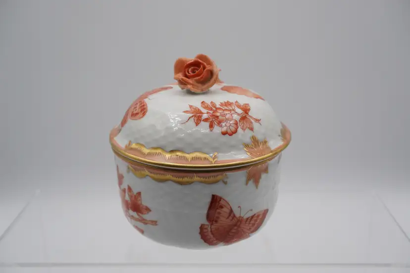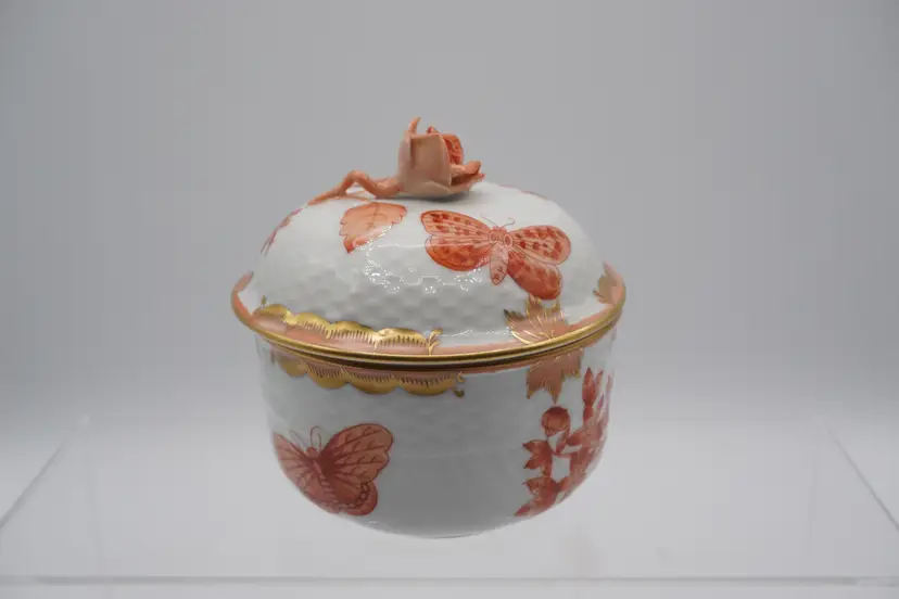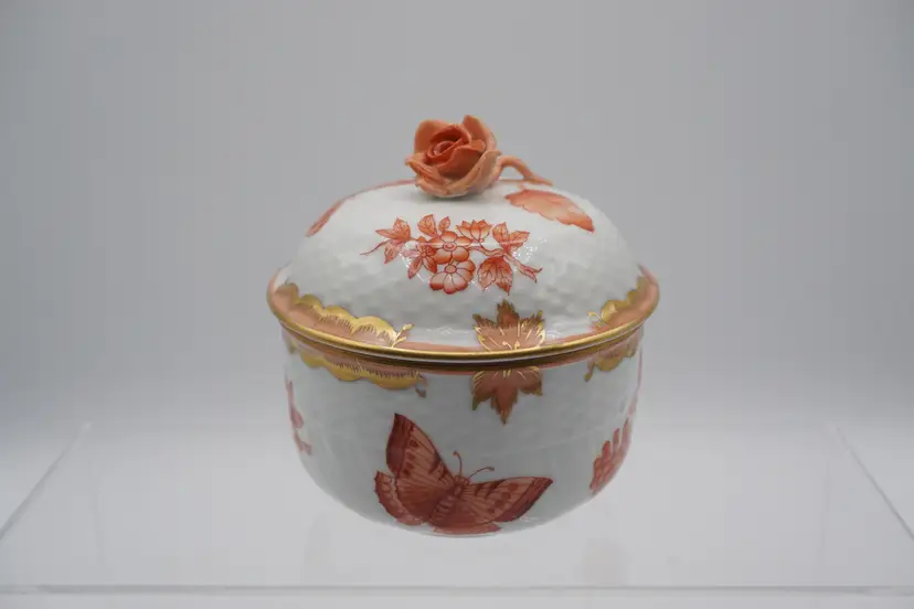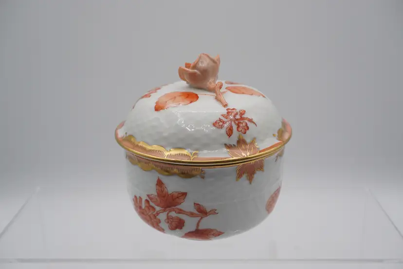 Queen Victoria design in orange. This is usually sold as a sugar bowl but also works great as a trinket box! I've seen this pattern referenced as "Fortuna" on various sites. According to the Herend Experts website, it is Queen Victoria.